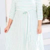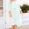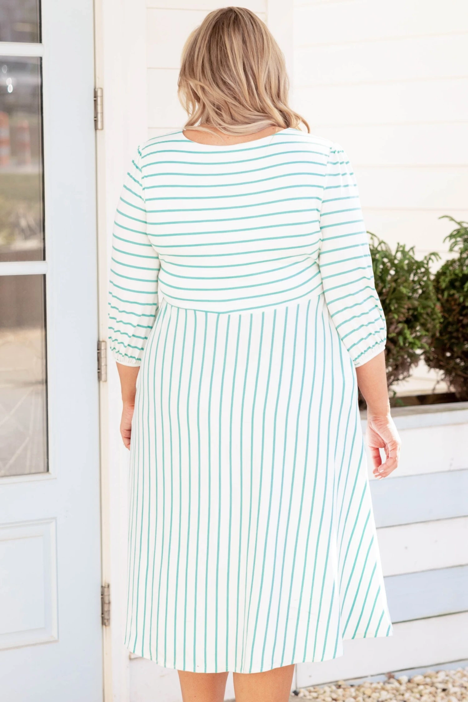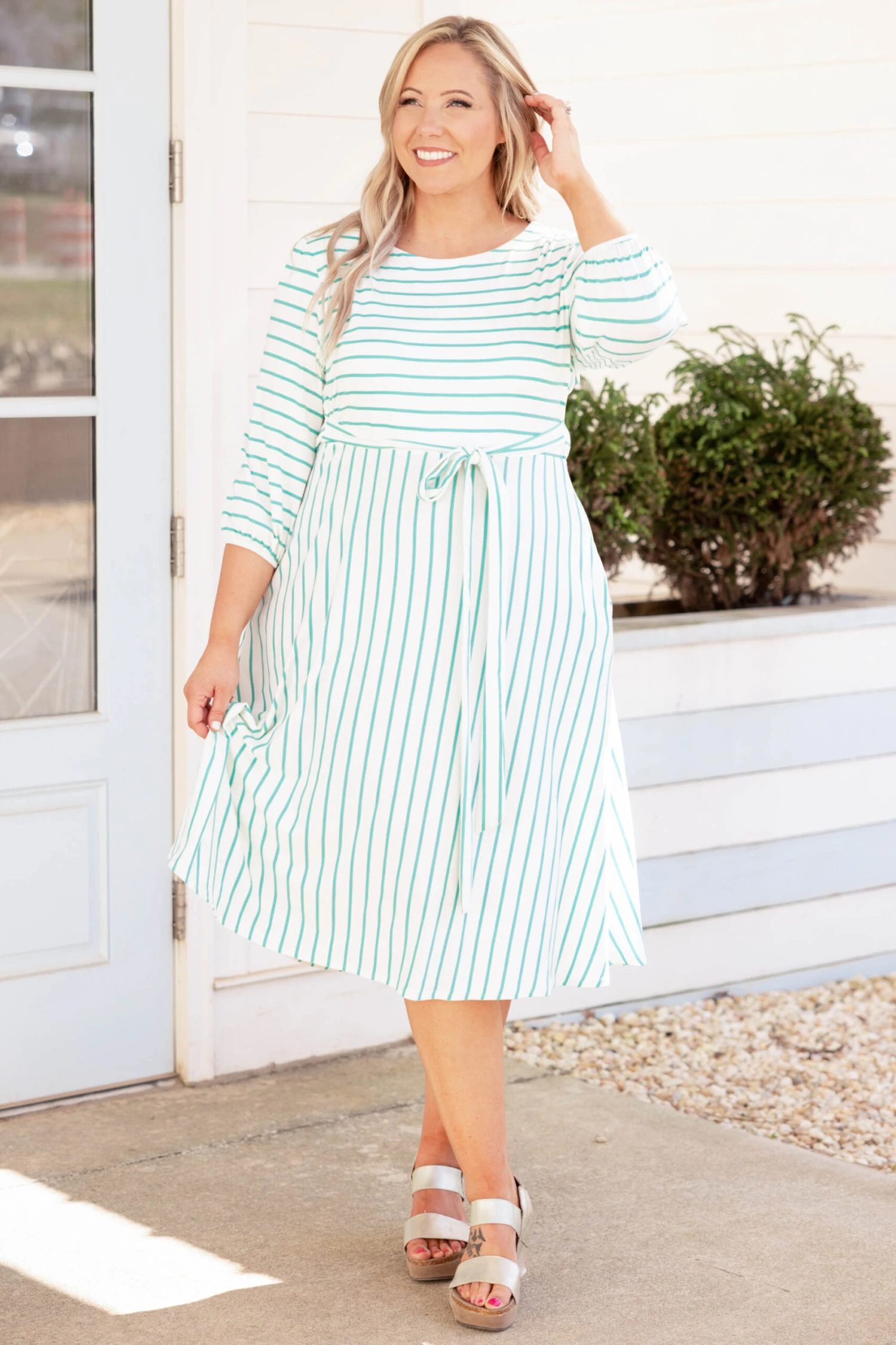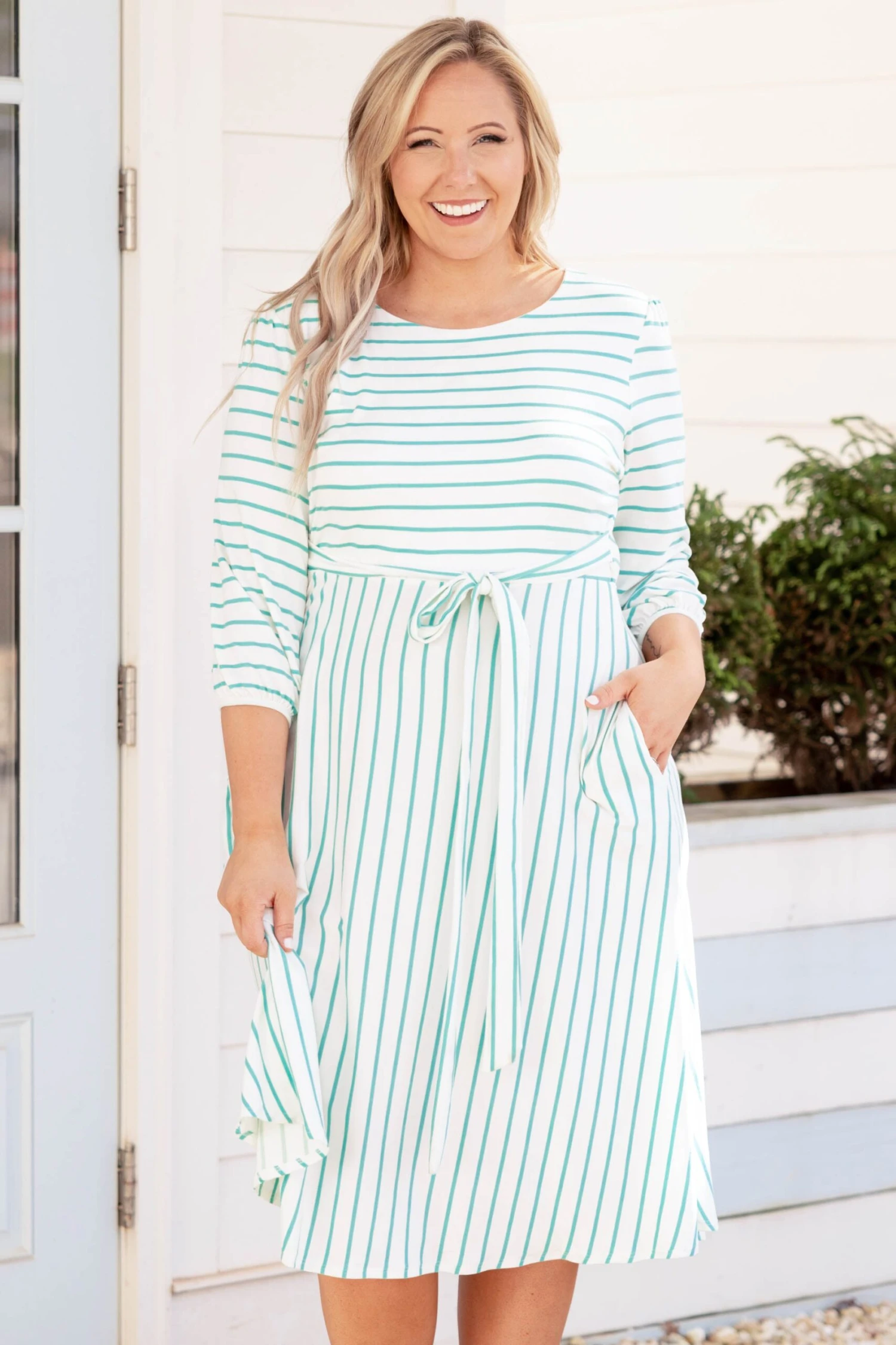 Hold hands with your love when you’re wearing this dress! This dress has the prettiest stripe pattern with a soft ivory-mint color you can style for every occasion! It’s comfortable for all-day wear, has a tied waistline to flatter your figure, and even features pockets! Simply, style this dress with heels or wedges for your next date night!Â