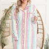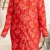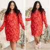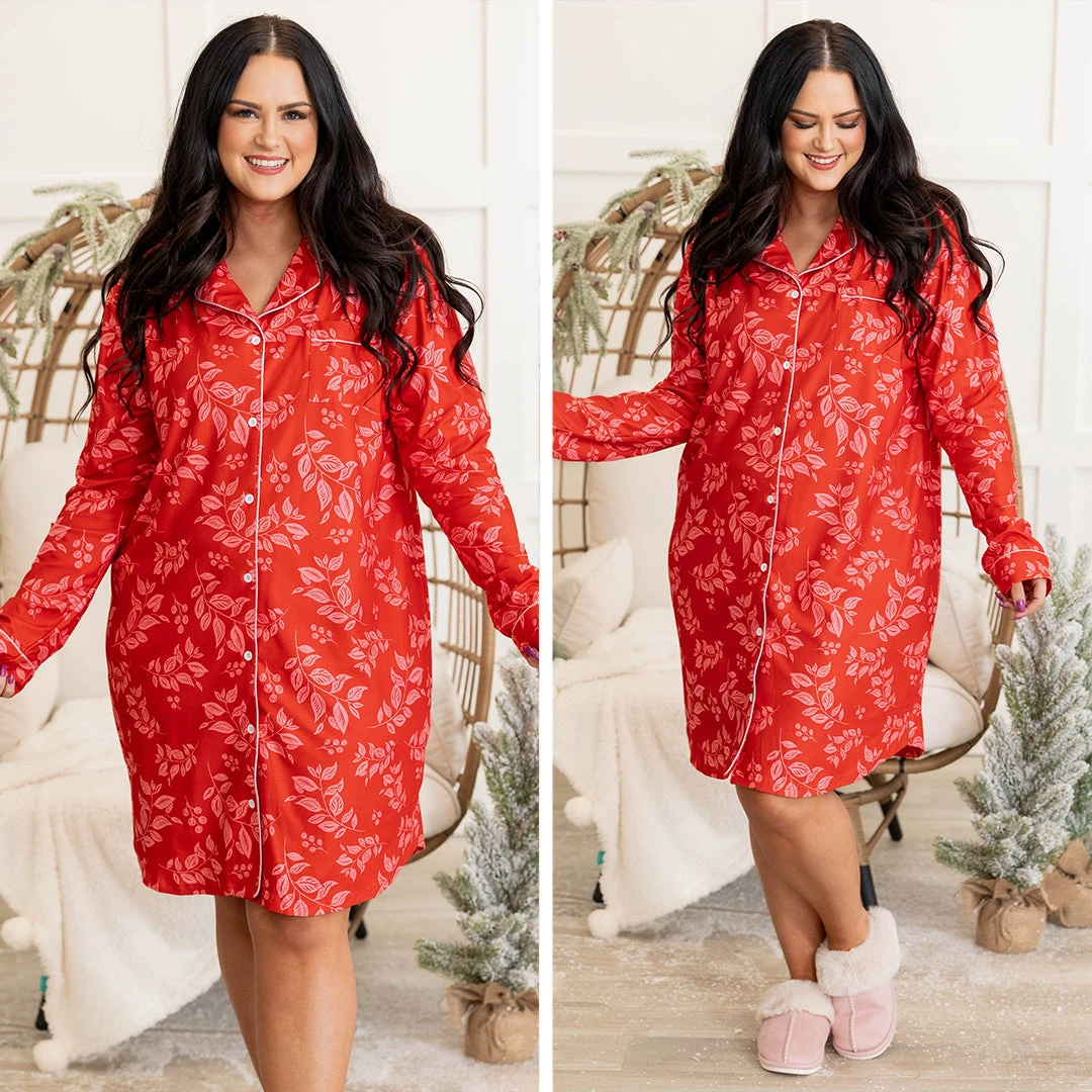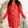 Tis’ the season to be jolly! This adorable pajama dress has a bold red color with a festive pattern that is just in time for the season! The comfy, figure flattering fit is perfect for lounging around! Throw on some slippers and sip some eggnog in this beauty!