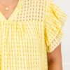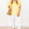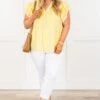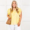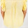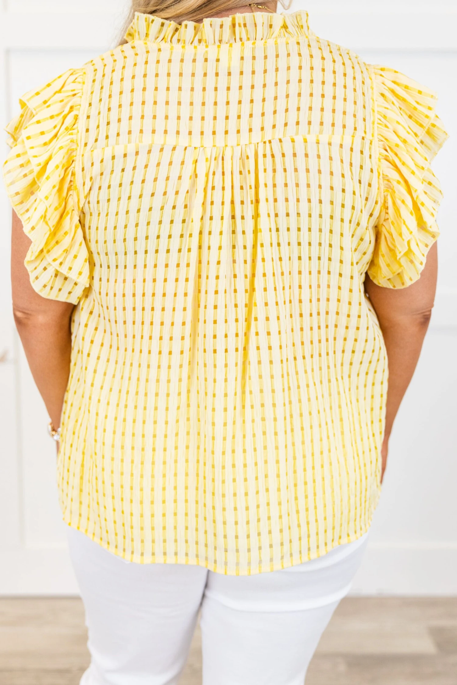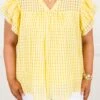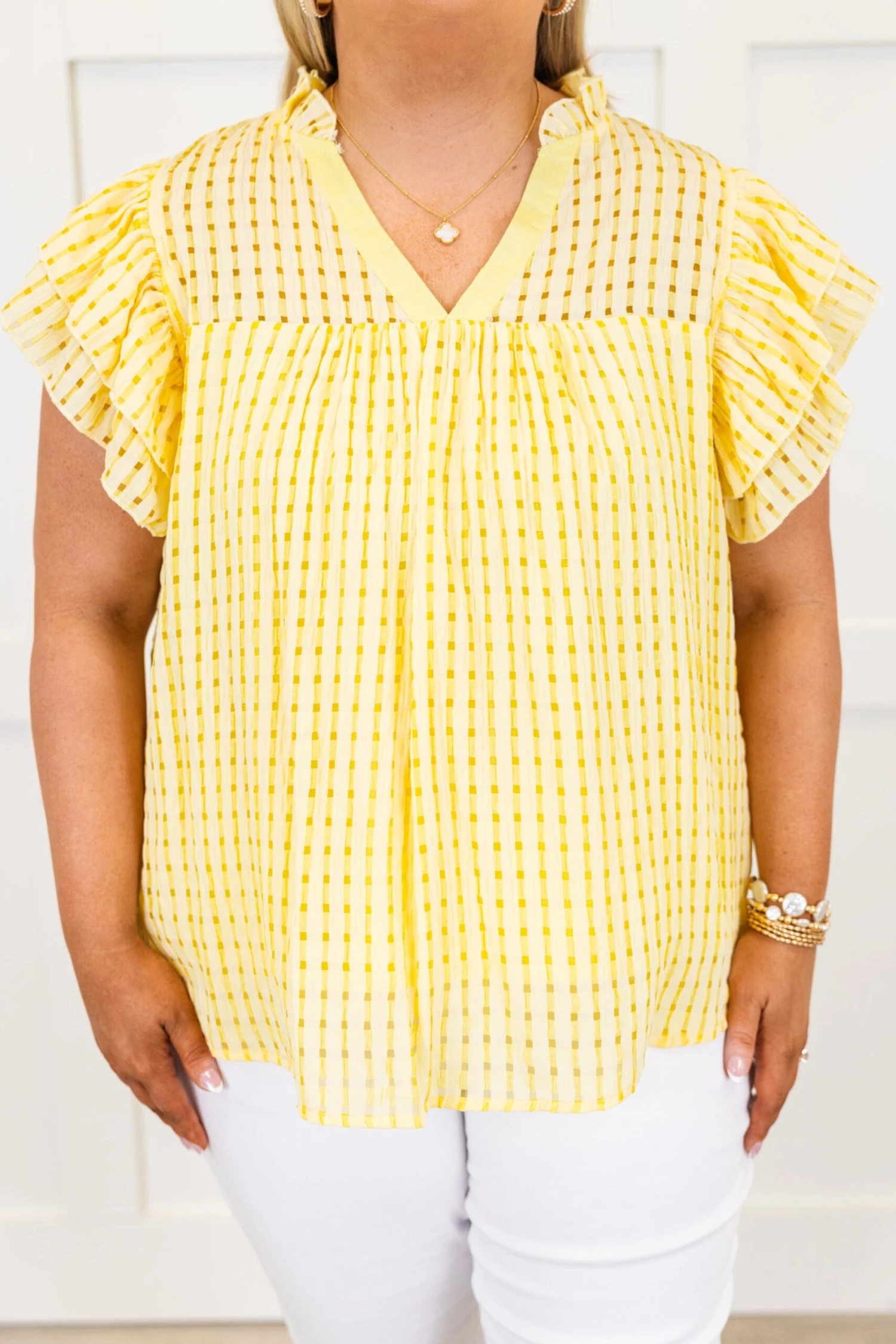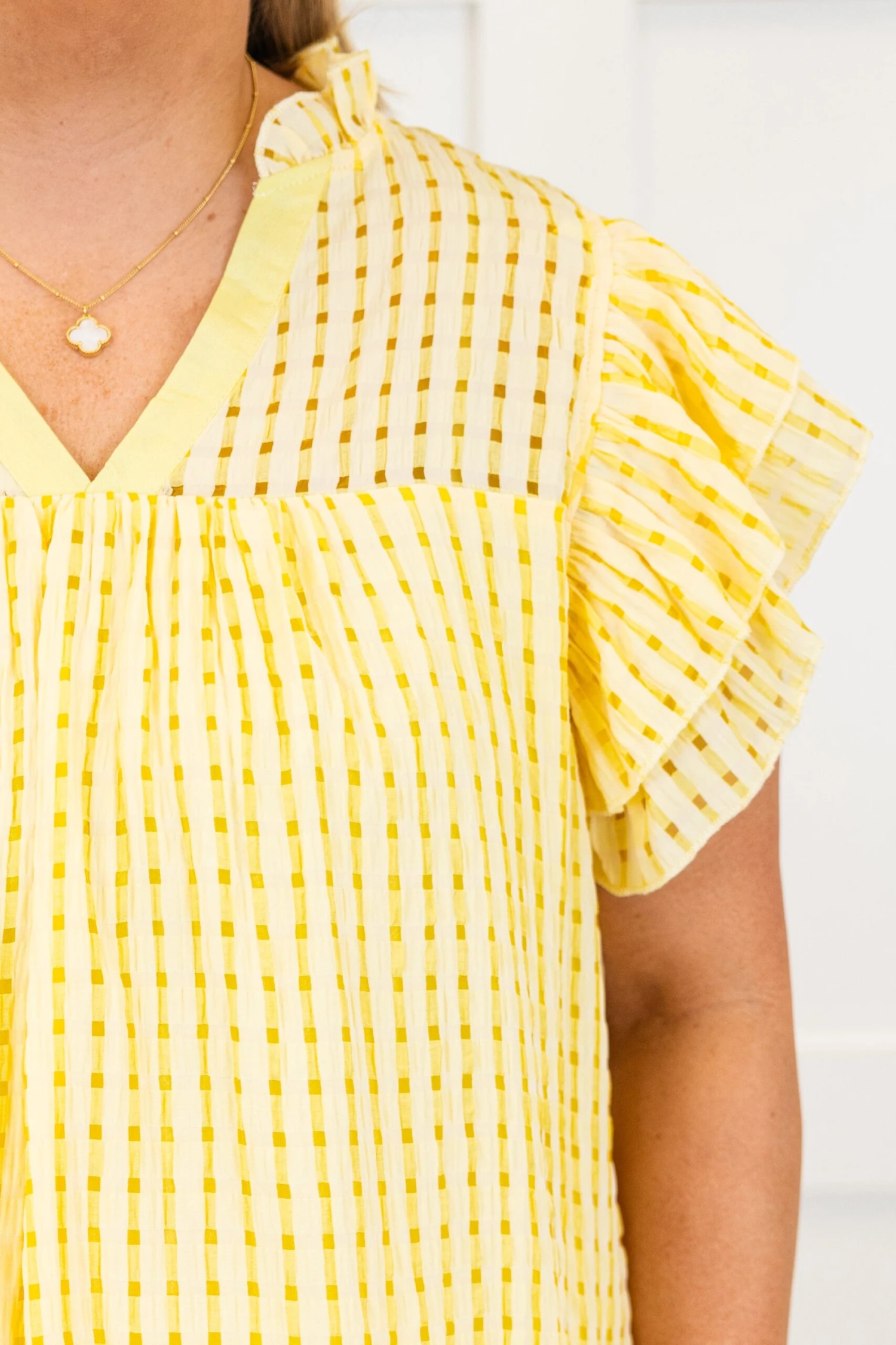 Home with you is where this top should be! It features a lightweight design and flutter sleeves for a chic and comfortable fit! Its lovely yellow color and plaid pattern make it versatile to pair with any outfit, making it a must-have addition to any wardrobe! Elevate your style with white denim and wedges for a timeless and chic look!
