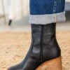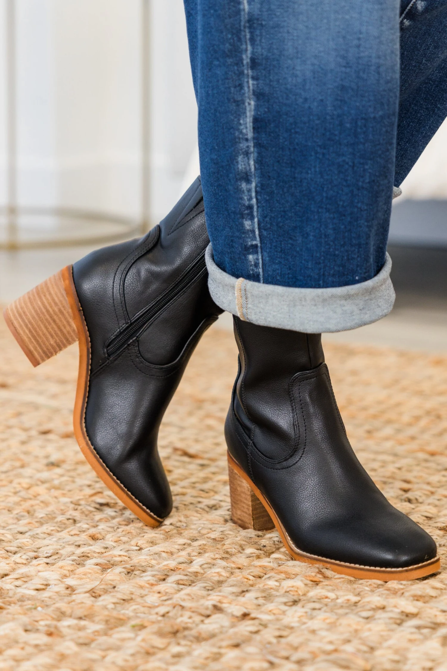 Turn heads in these booties! The black faux leather chelsea bootie design is given a twist with a light brown wedge heel, creating a unique and eye-catching look! Comfort and style combine in these one-of-a-kind booties!