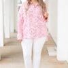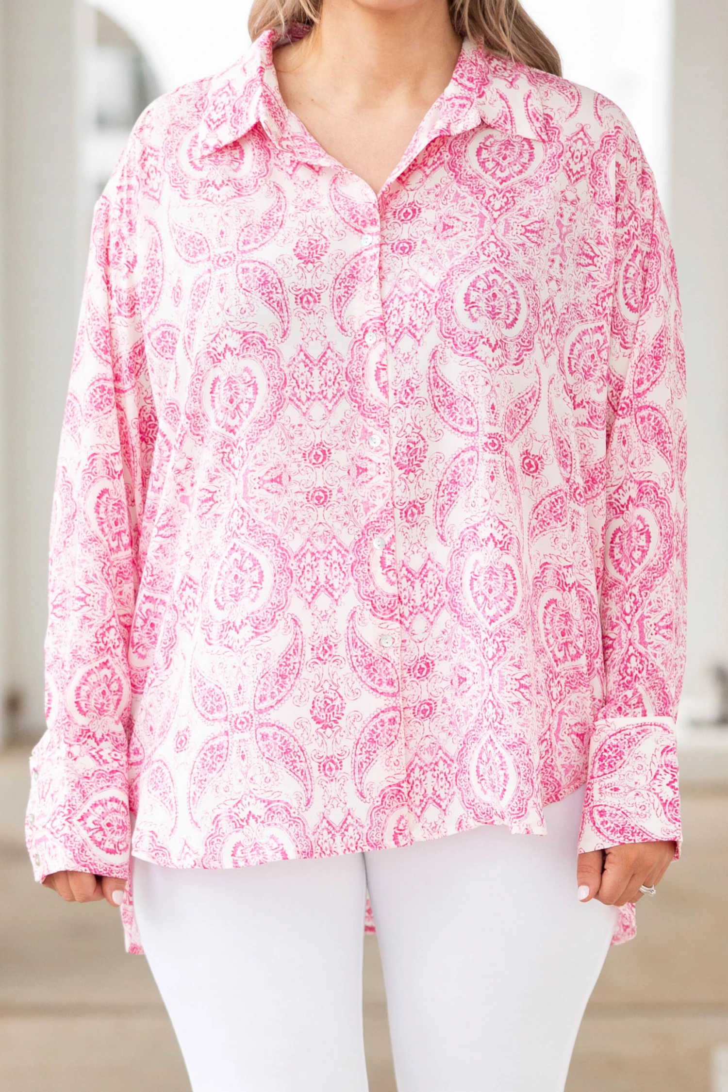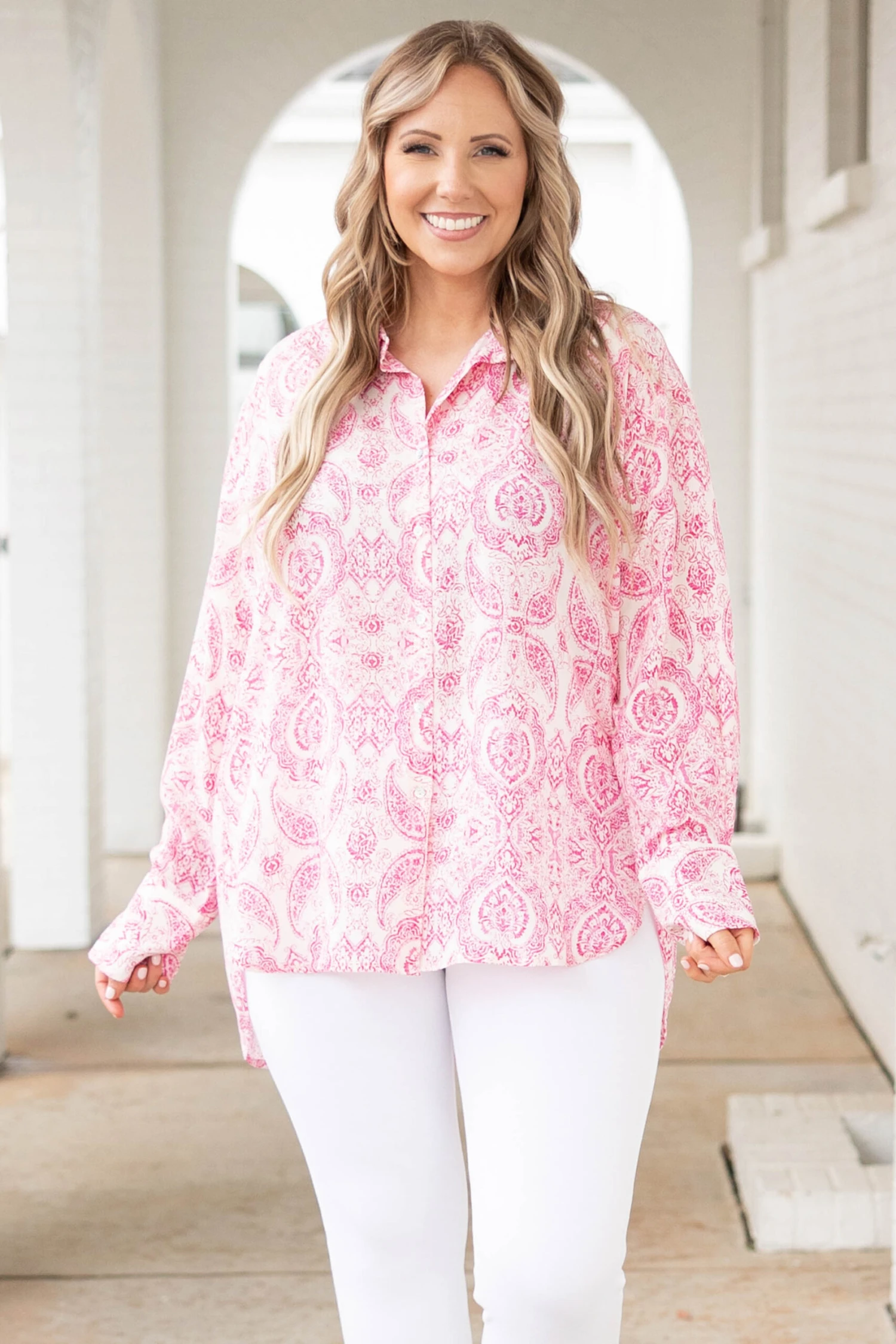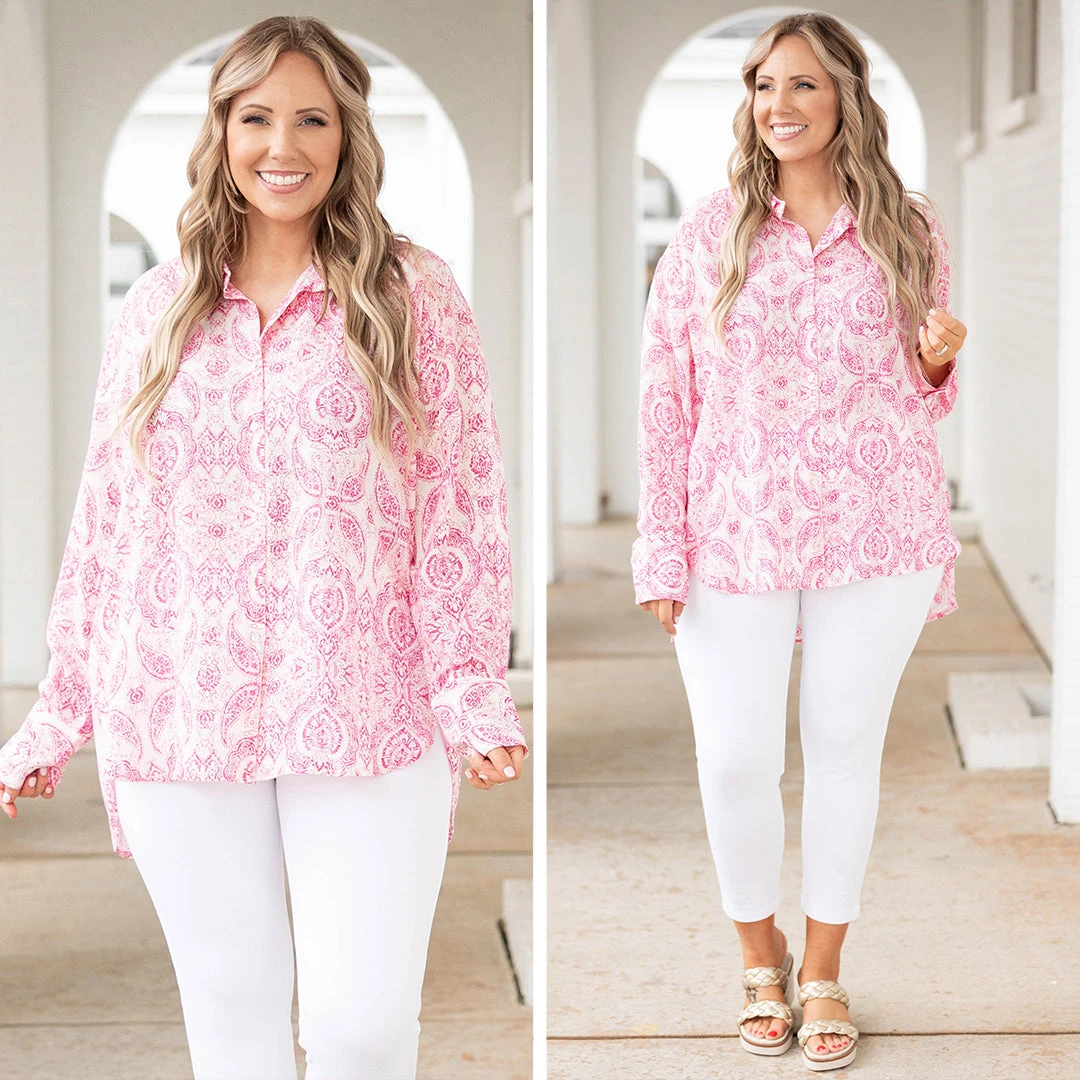 We simply ADORE this gorgeous top! It has a beautiful pink color with a paisley pattern that is so chic! The flowy, figure flattering fit is perfect for every occasion! Dress this top up with skinnies and heels or keep it casual with short and sneakers for an effortlessly chic look!