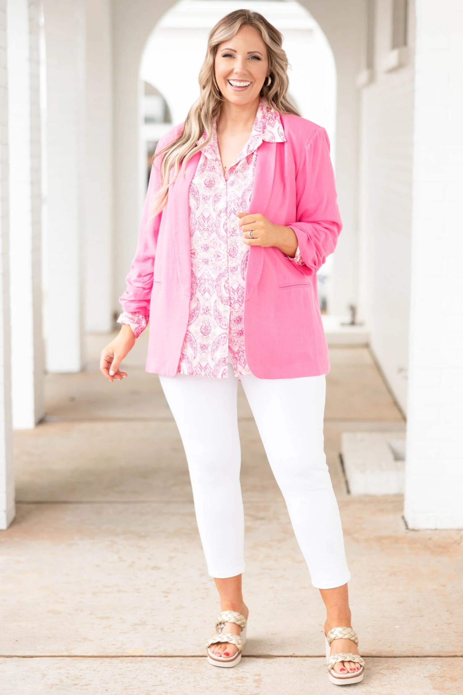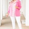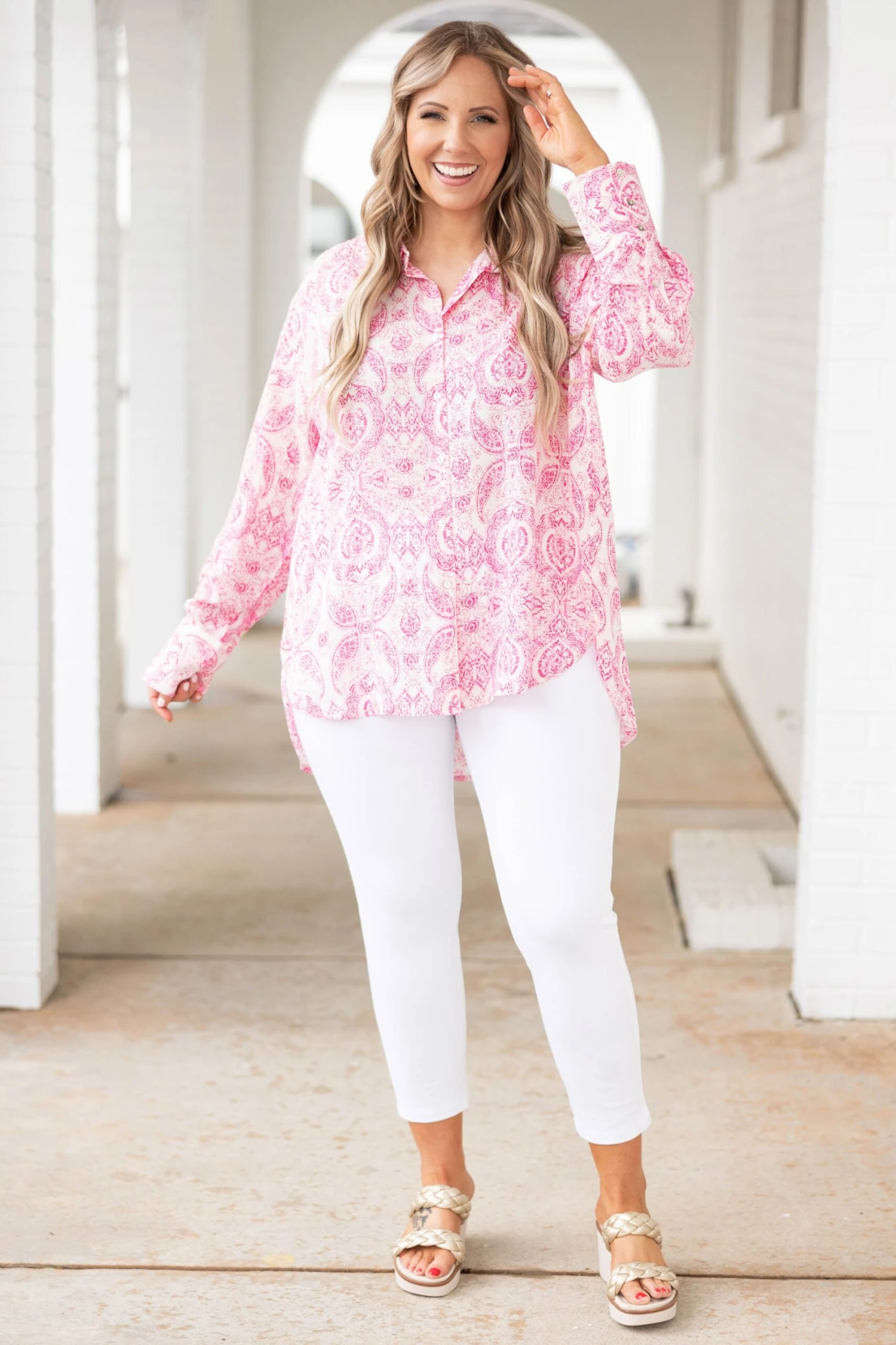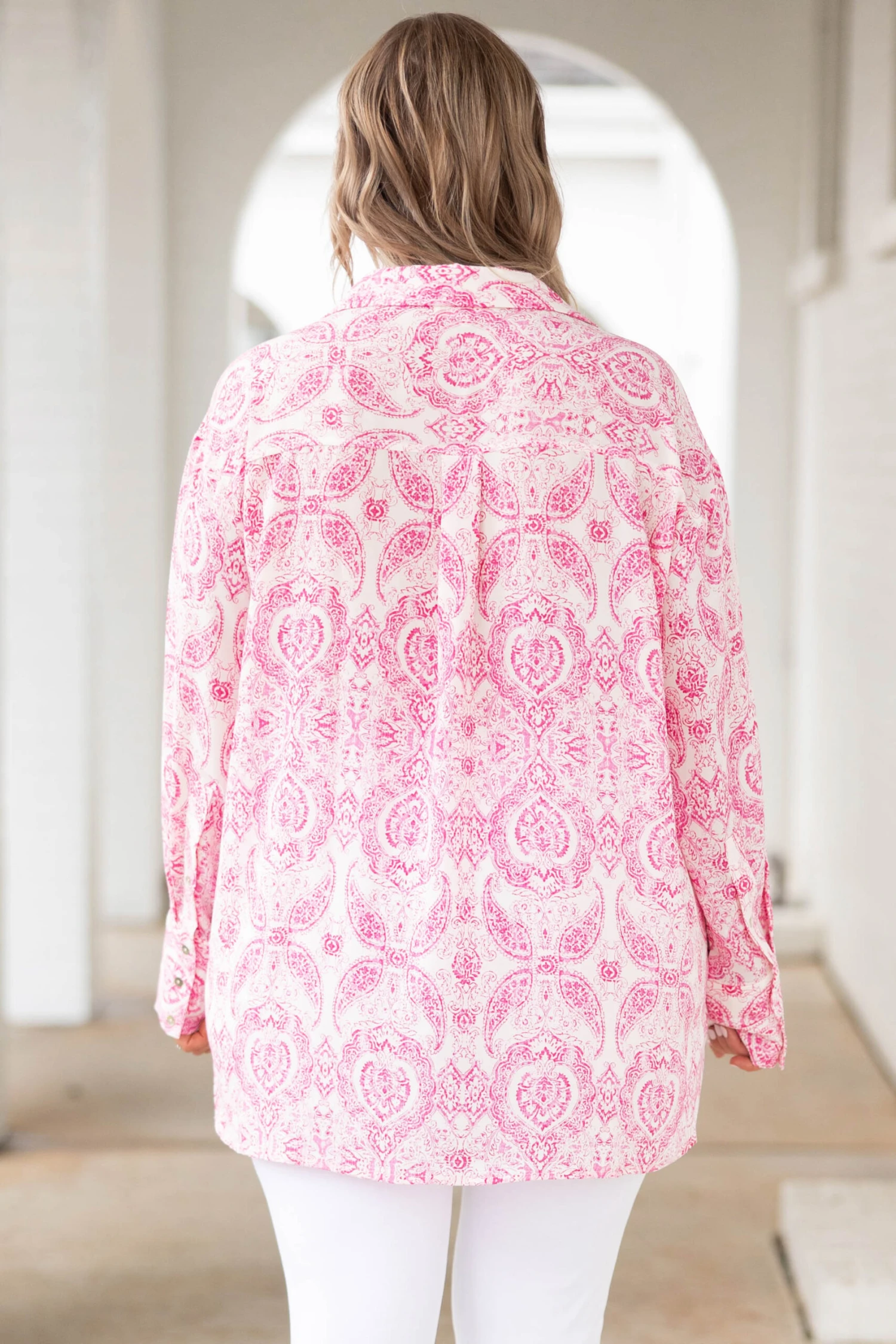 We simply ADORE this gorgeous top! It has a beautiful pink color with a paisley pattern that is so chic! The flowy, figure flattering fit is perfect for every occasion! Dress this top up with skinnies and heels or keep it casual with short and sneakers for an effortlessly chic look!