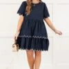 Get ready to flutter around in this dress! Featuring a tiered skirt with delicate scallop detail and white piping, this dress will make you feel effortlessly stylish! The scallop detail continues on the sleeves, adding a touch of whimsy! Don’t forget the keyhole button closure on the back for an extra detail!