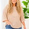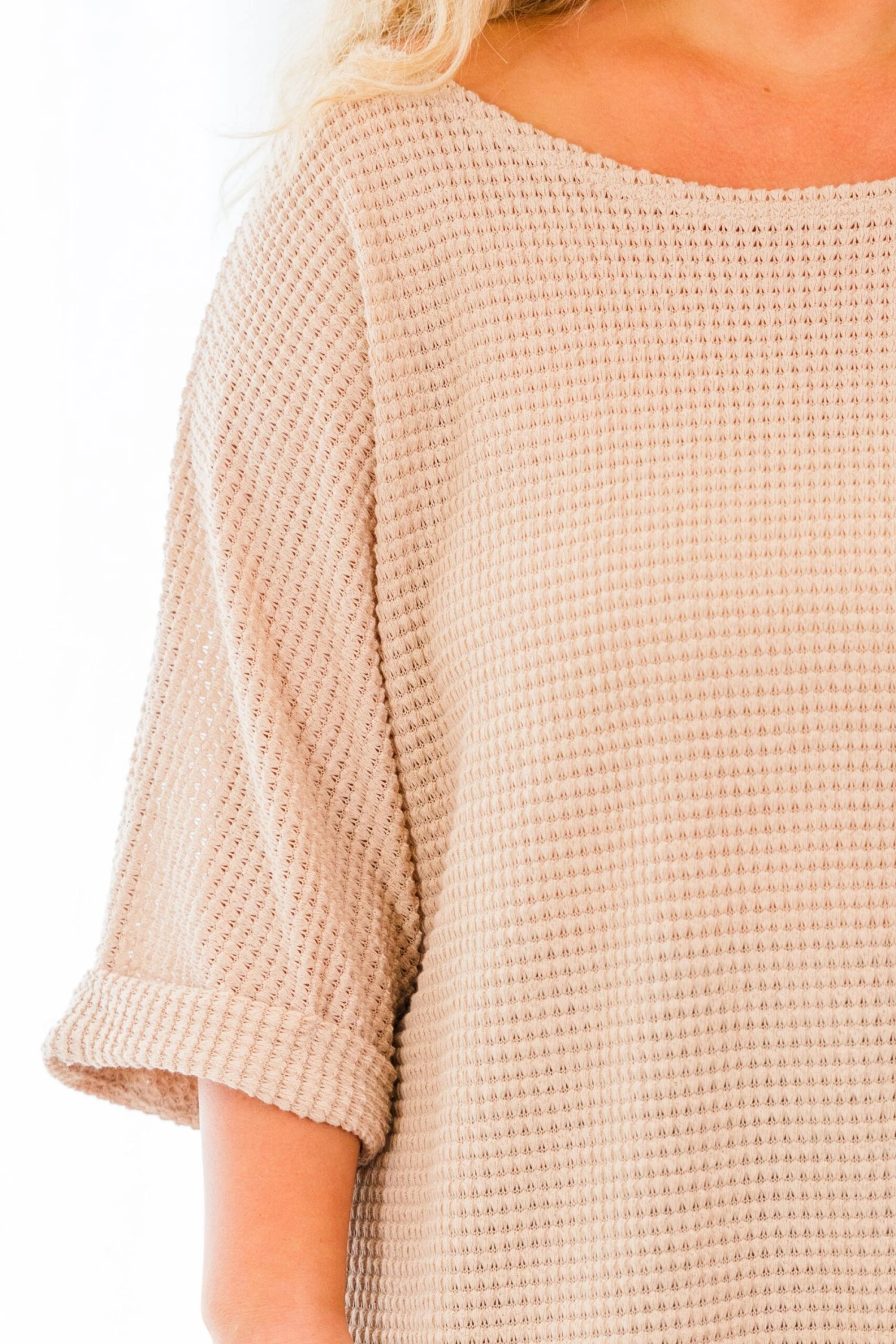 Hurry along to the checkout with this lovely top! It is must-have addition to your wardrobe! The light weight, diamond lattice design is so classic, while the classic taupe color adds a pop of fun! Pair this cutie with a tank and white denim for a sassy chic look!