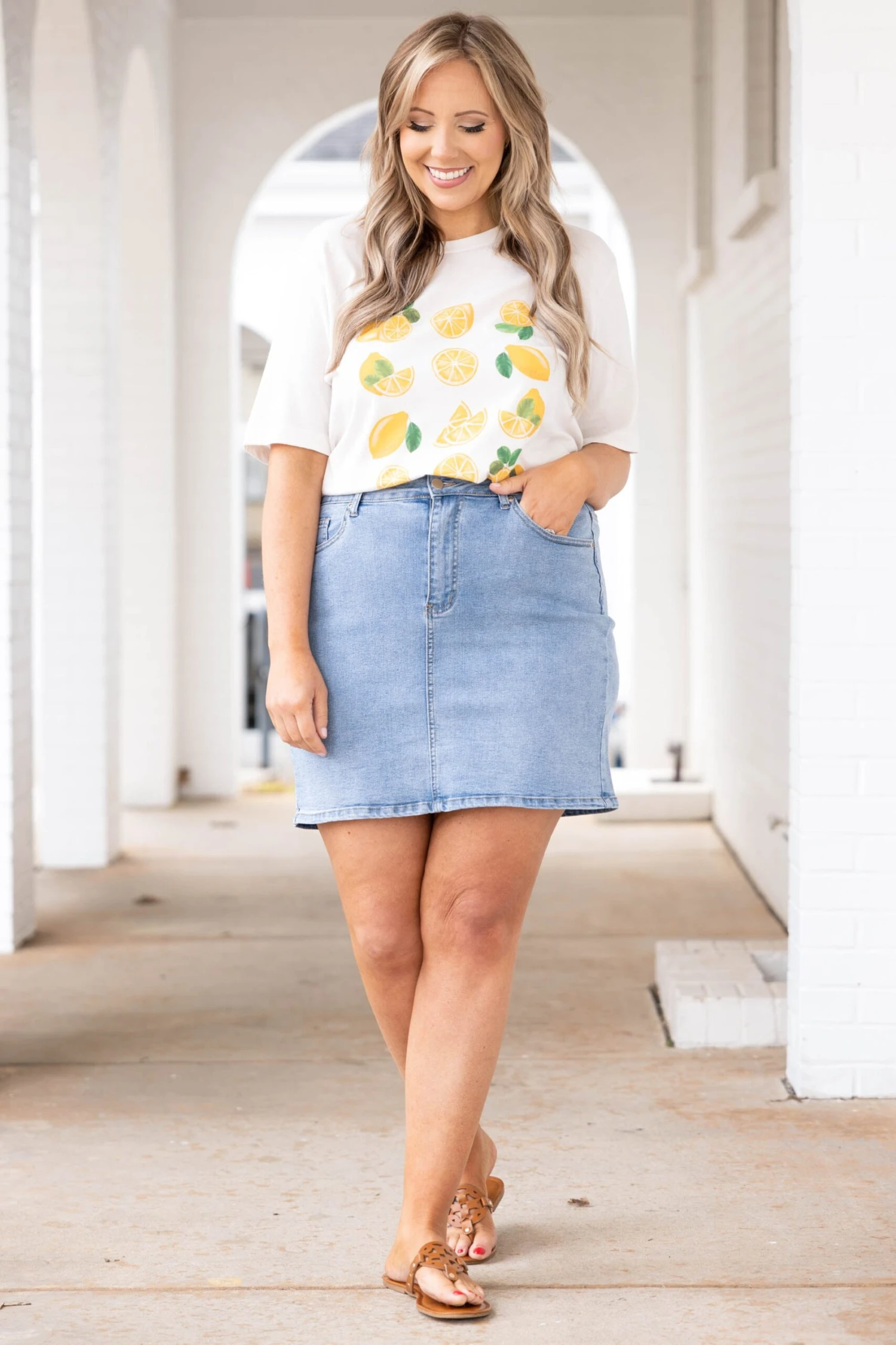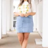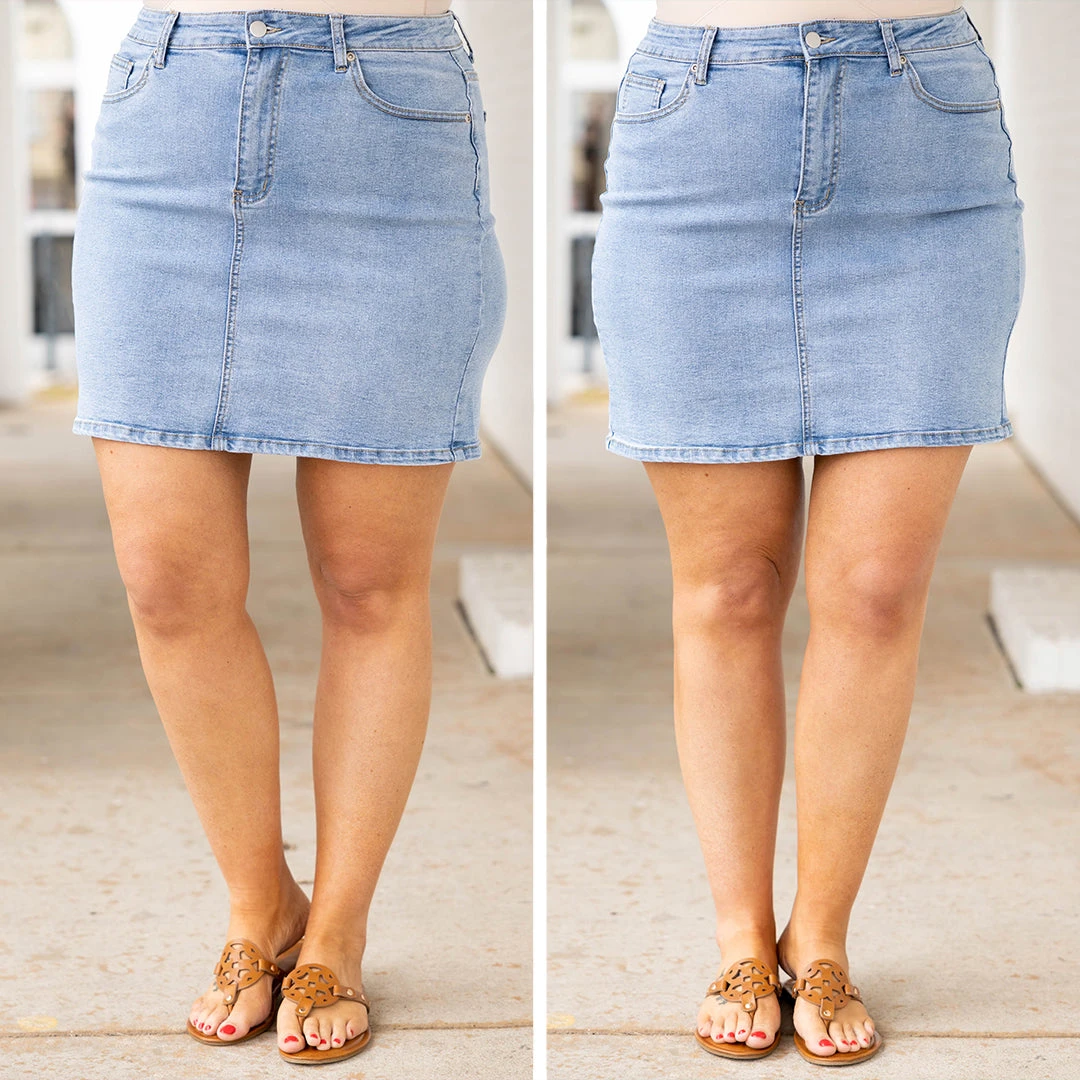We think you would look AMAZING in this lovely skirt! It has a trendy light wash and a flirty length that is just in time for the season! It’s super comfy and pairs well with all of your favorite top and shoes! We see this skirt styled with a cute top and sandals for a classic chic look!