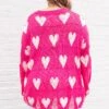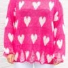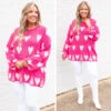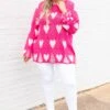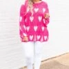 We simply love this gorgeous top! It has a bold fuchsia color with a white heart p[attern that is super chic! The distressed design along the hemline and bottom of the sleeves is super trendy! We see this cutie paired with white denim and booties for the ultimate casual look!