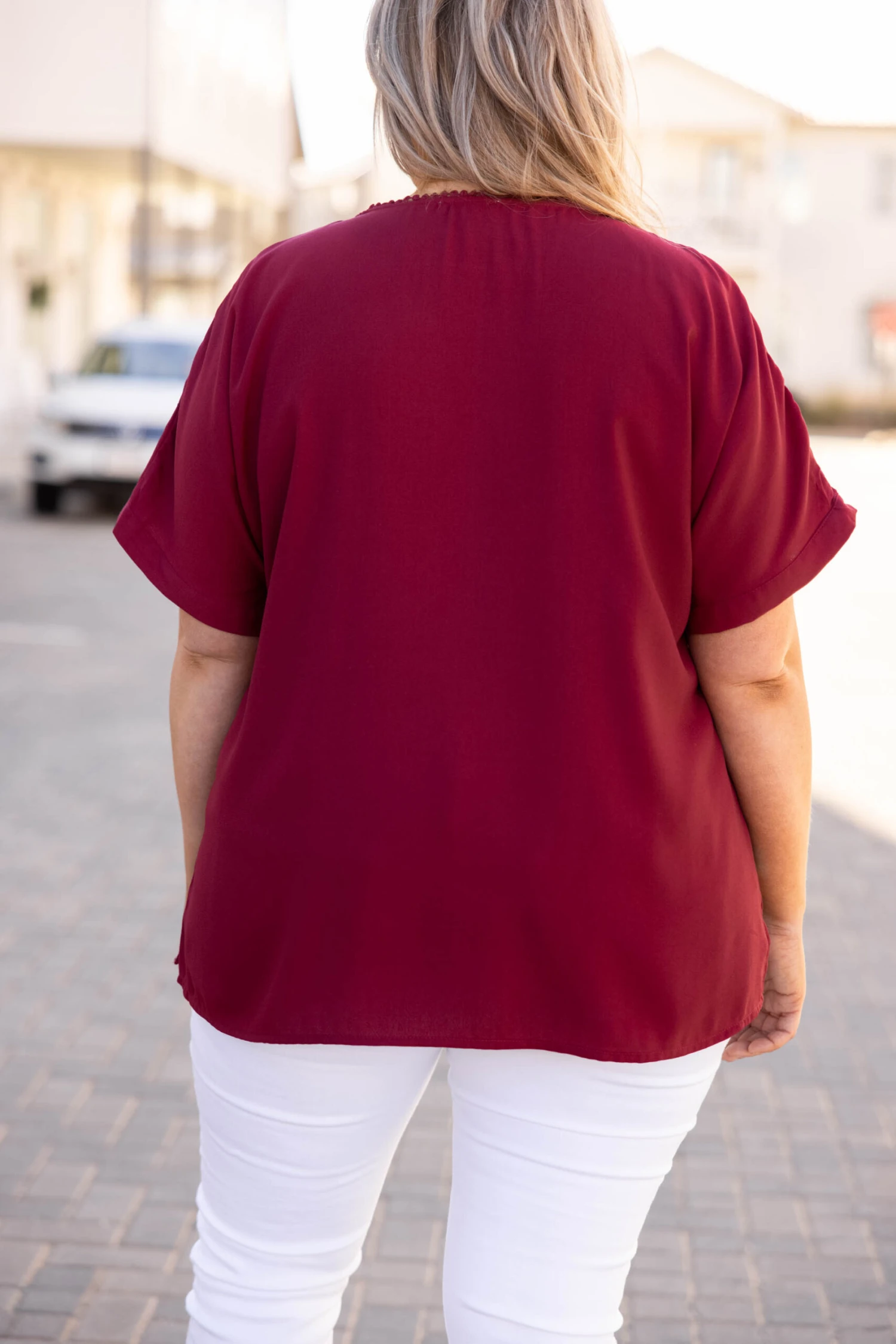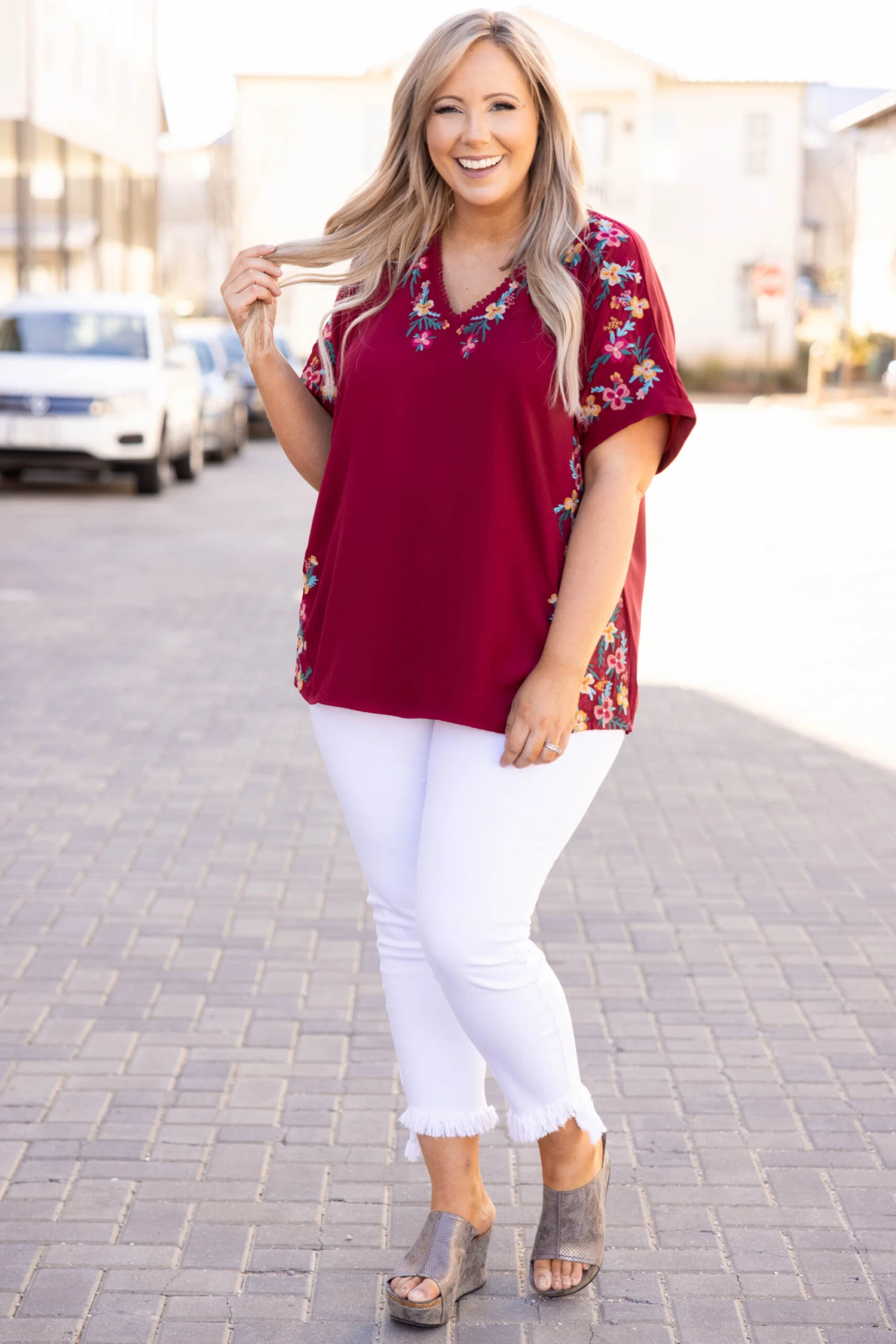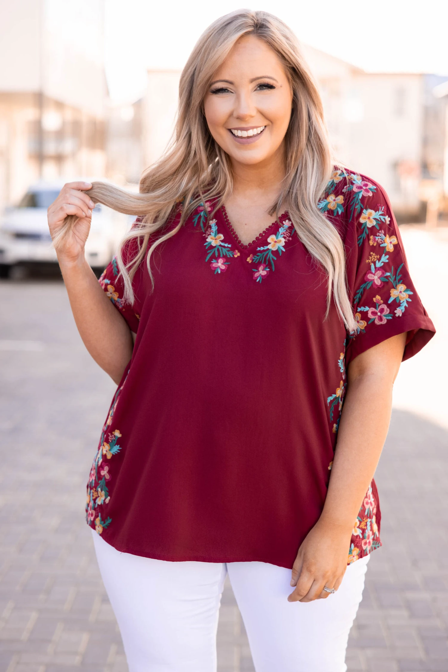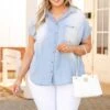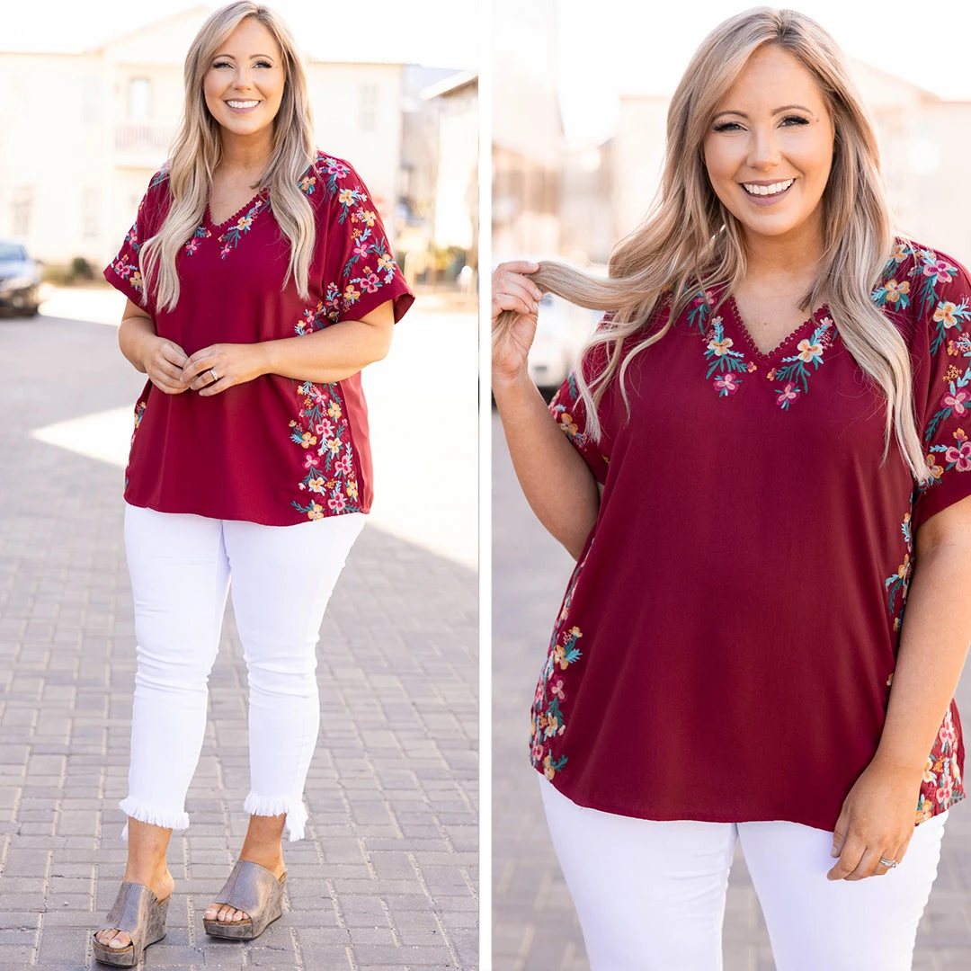 We love this top! It has a pretty embroidered pattern with a neutral color that’s perfect for the season! It’s comfortable for all-day wear has a flowy fit, and features the cutest print on the sleeves! Style this top with skinnies and wedges for an effortlessly chic look!