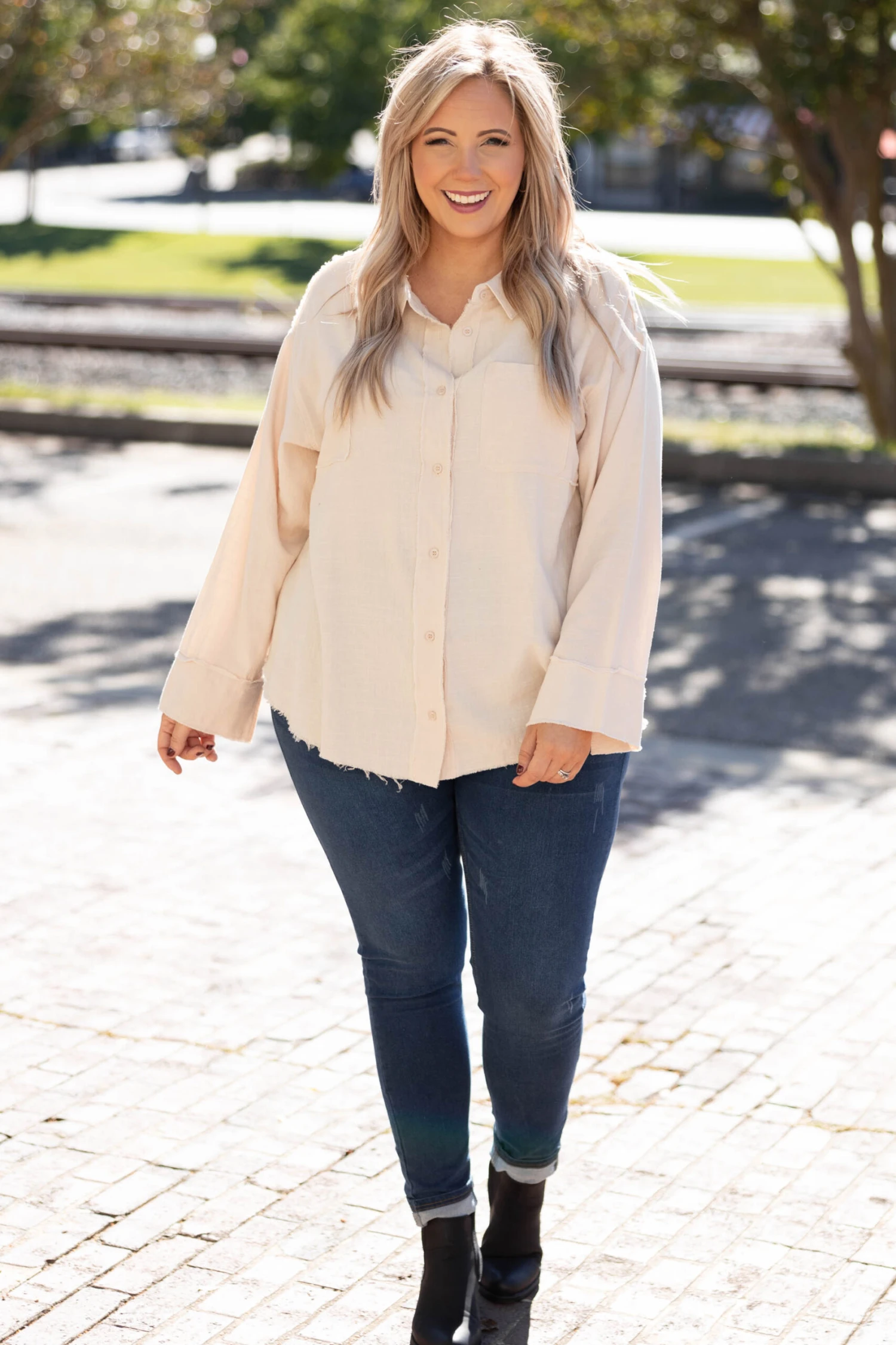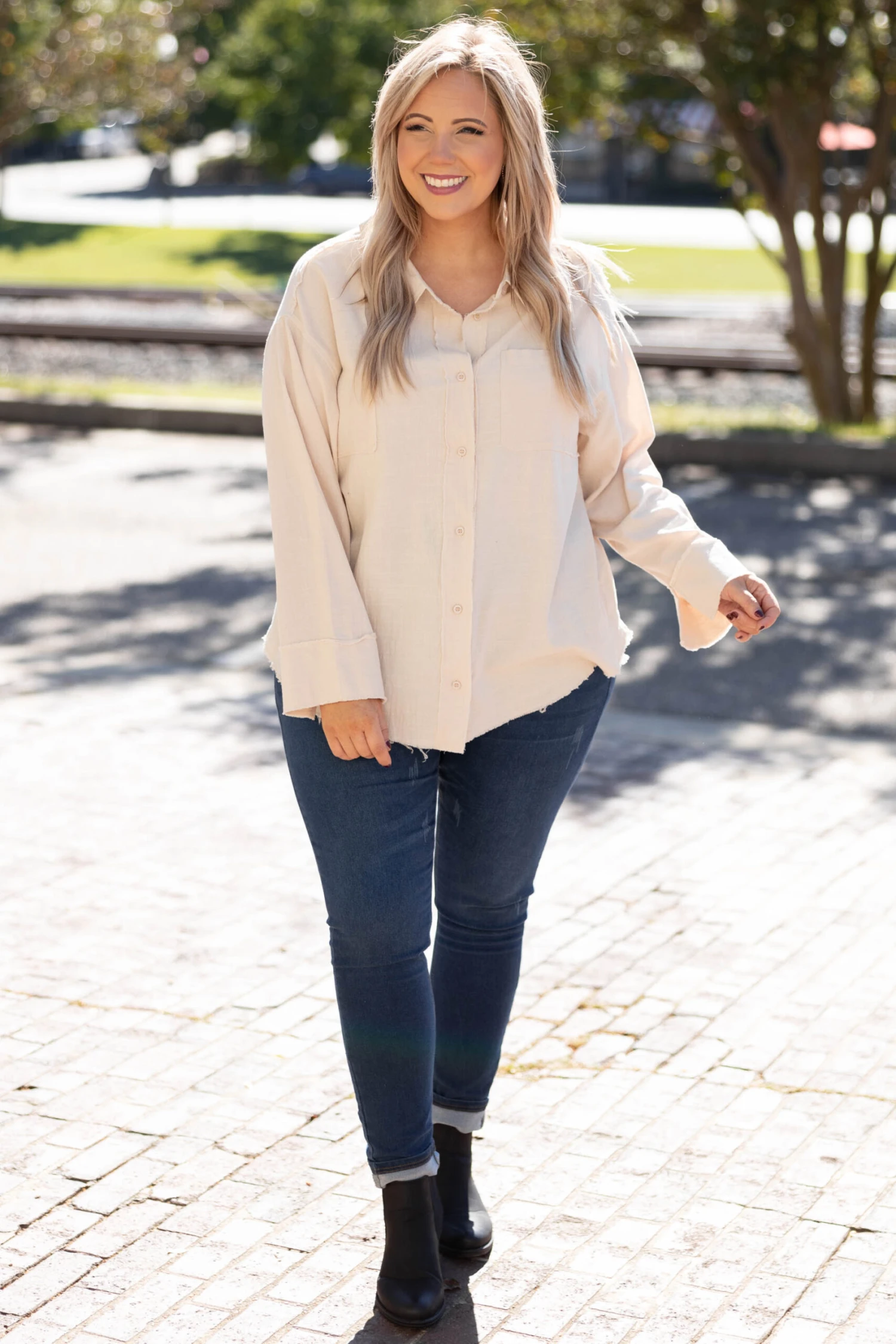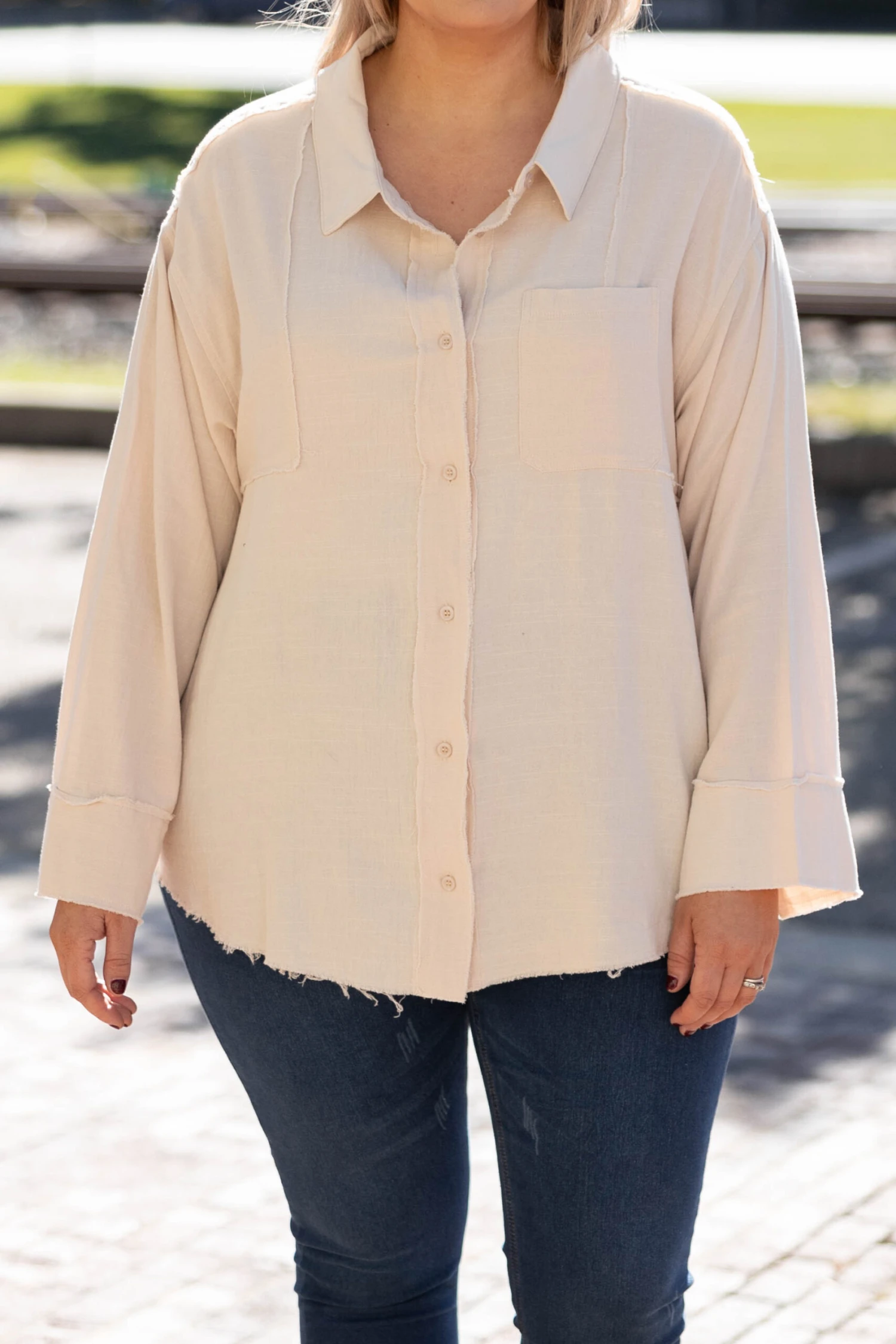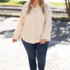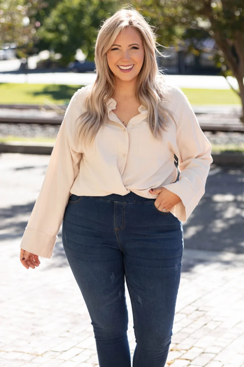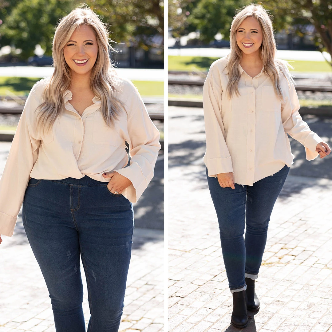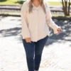 Change out last year’s wardrobe with the addition of this trendy new top! This top has a solid neutral color that’s perfect for the season! It’s comfortable for all day wear, has a flowy fit, and features the cutest button-front design! Simply, pair this top with skinnies and booties for an effortlessly chic look!Â