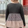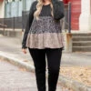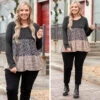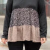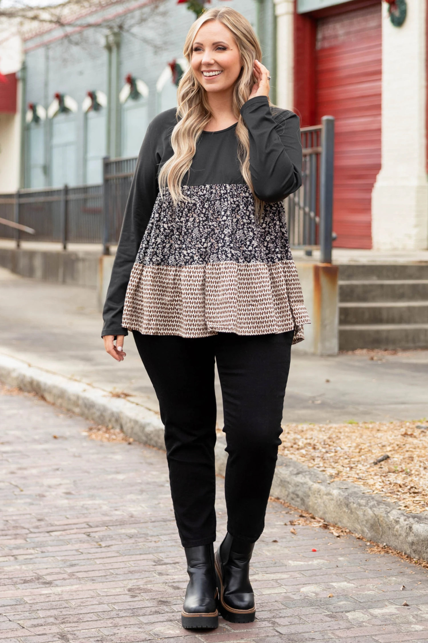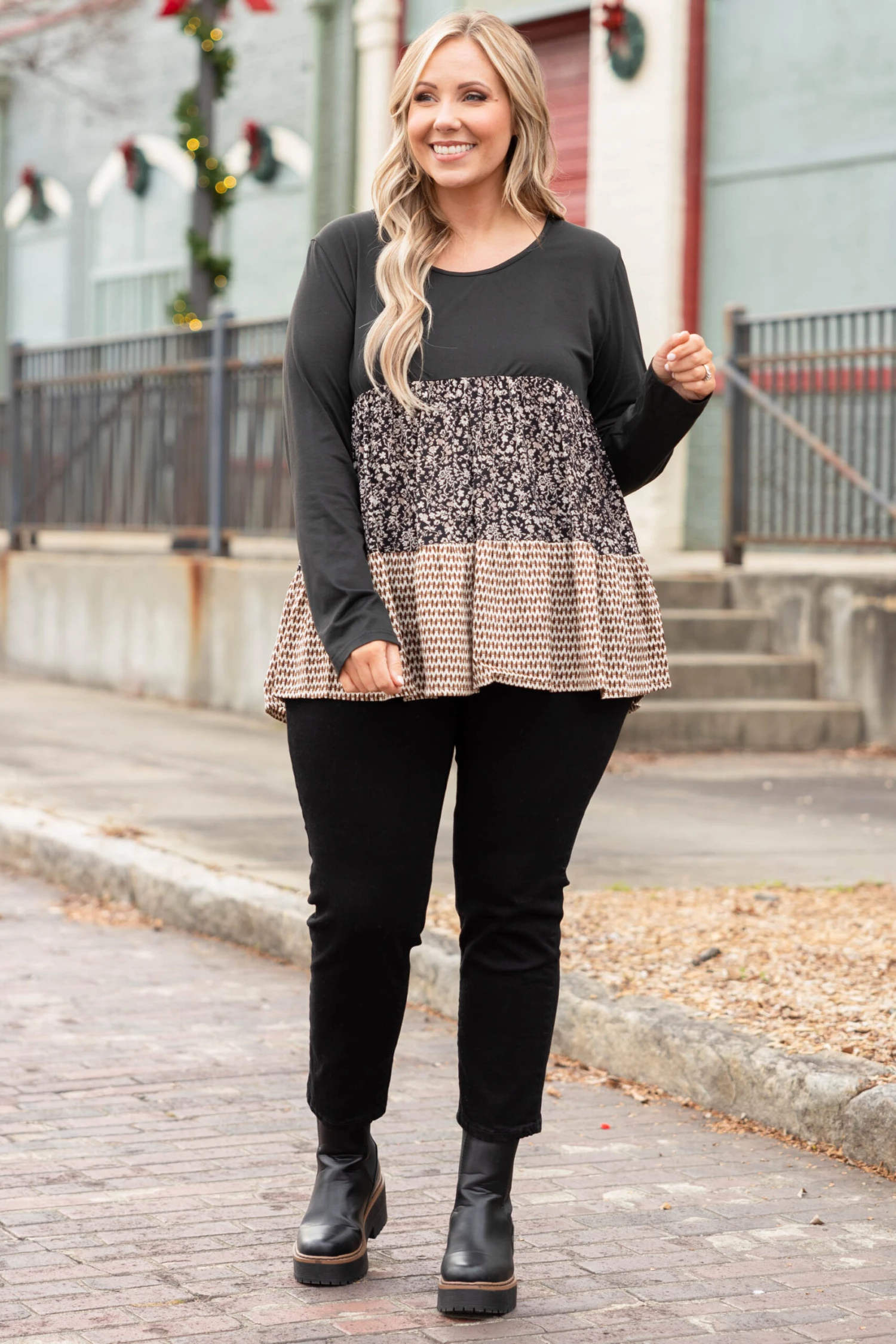 We know that you know you need this top! This top has a black color with a colorblock design that is just in time for the season! The figure flattering fit is perfect to pair with your favorite skinnies or leggings for a casual chic look!