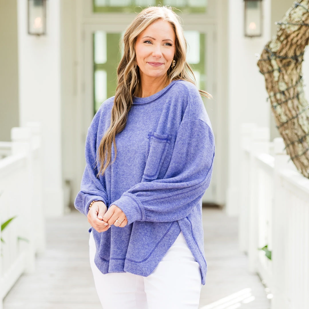 Get cozy with this top in marlin! Made with brushed hacci fabric, this round neck sweater will keep you warm and stylish! The hi-low hemline adds a touch of unique flair to this comfortable top! Perfect for a casual day out or lounging at home!