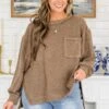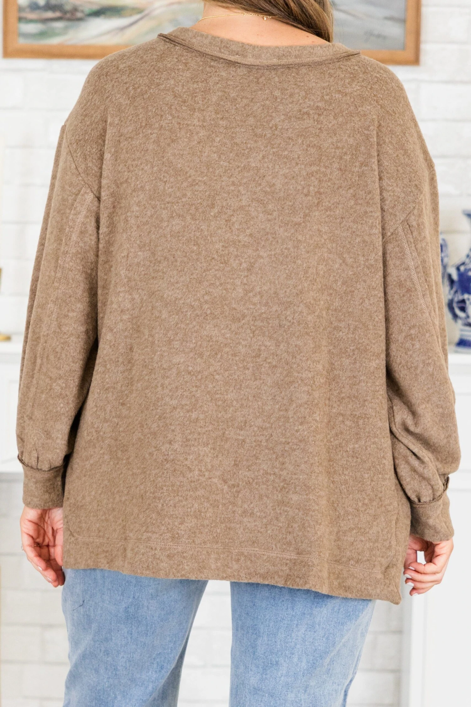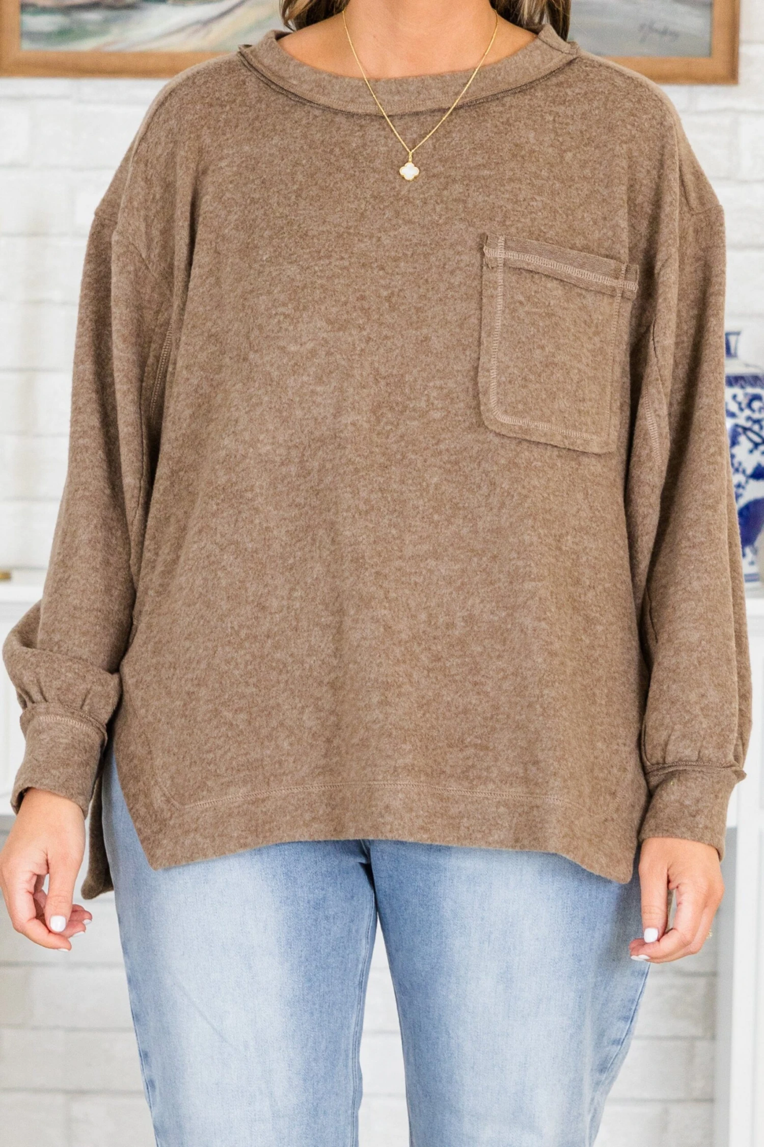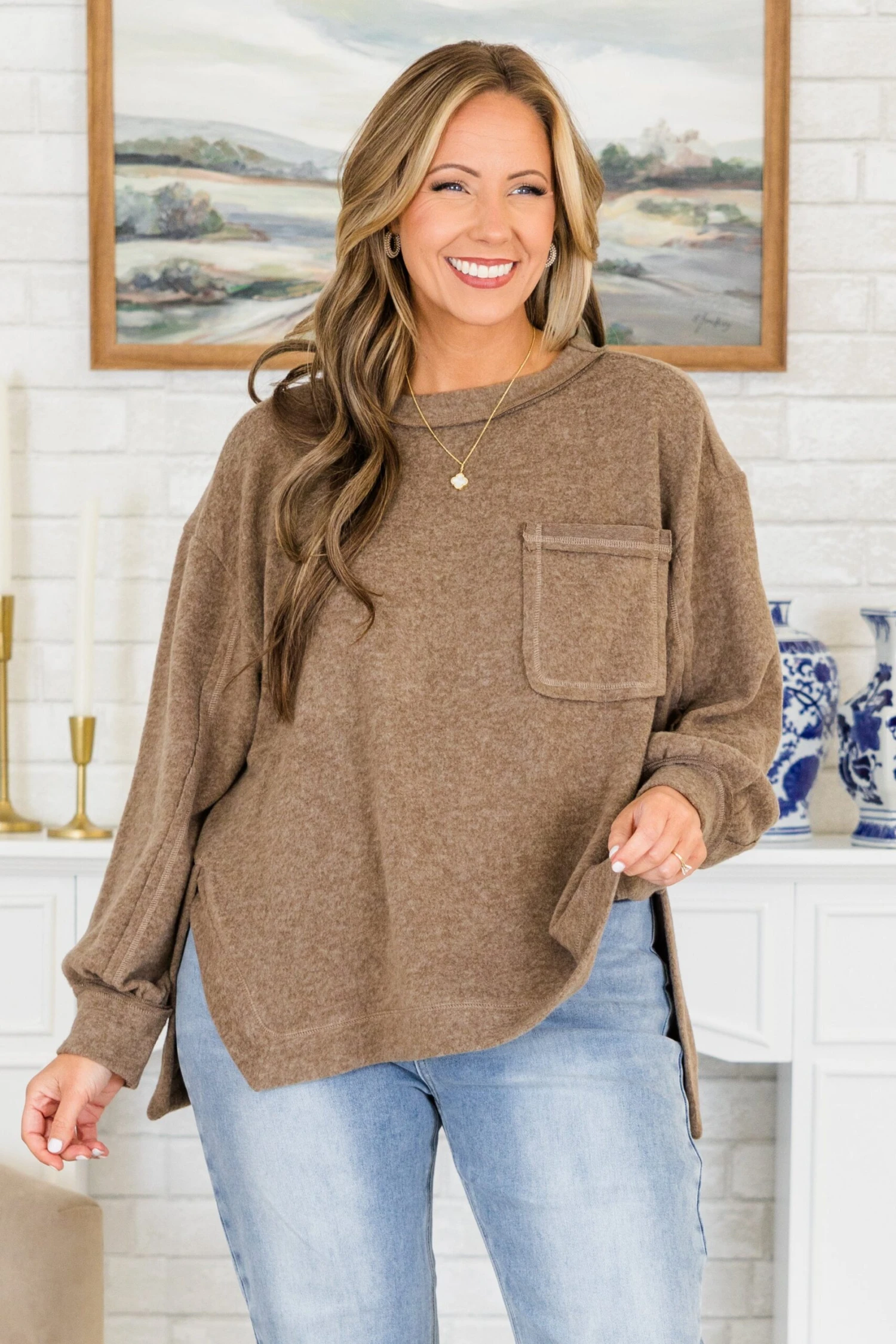 Get cozy with this top in mocha! Made with brushed hacci fabric, this round neck sweater will keep you warm and stylish! The hi-low hemline adds a touch of unique flair to this comfortable top! Perfect for a casual day out or lounging at home!