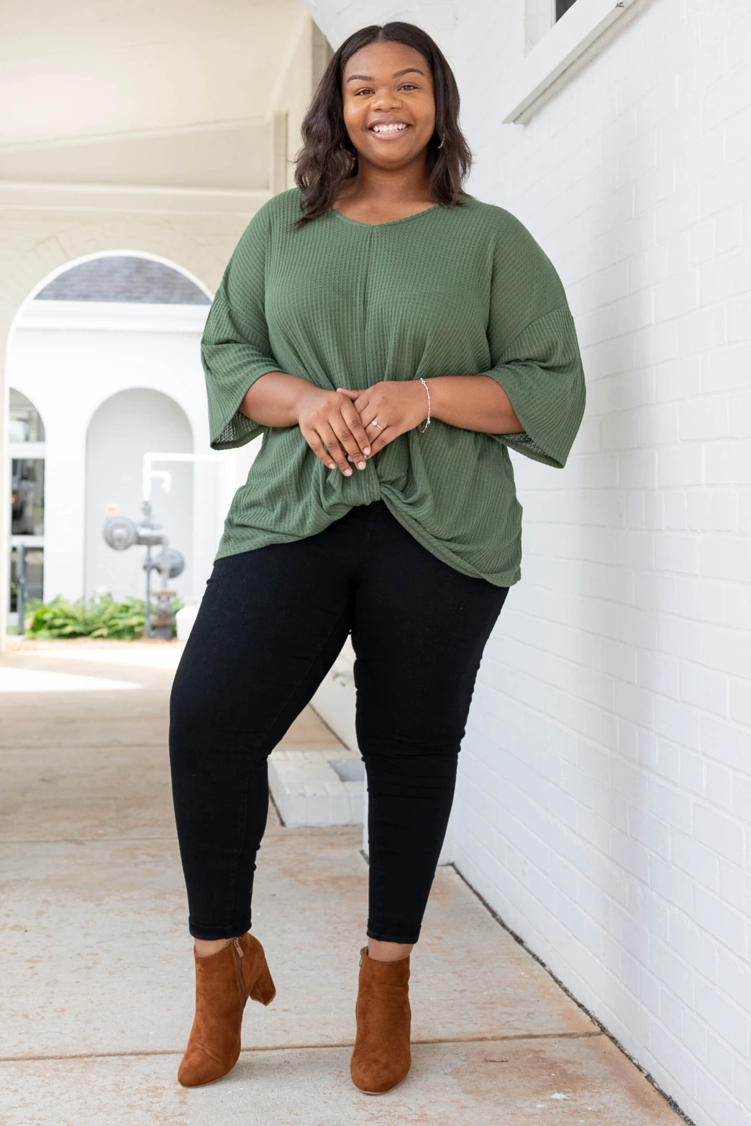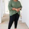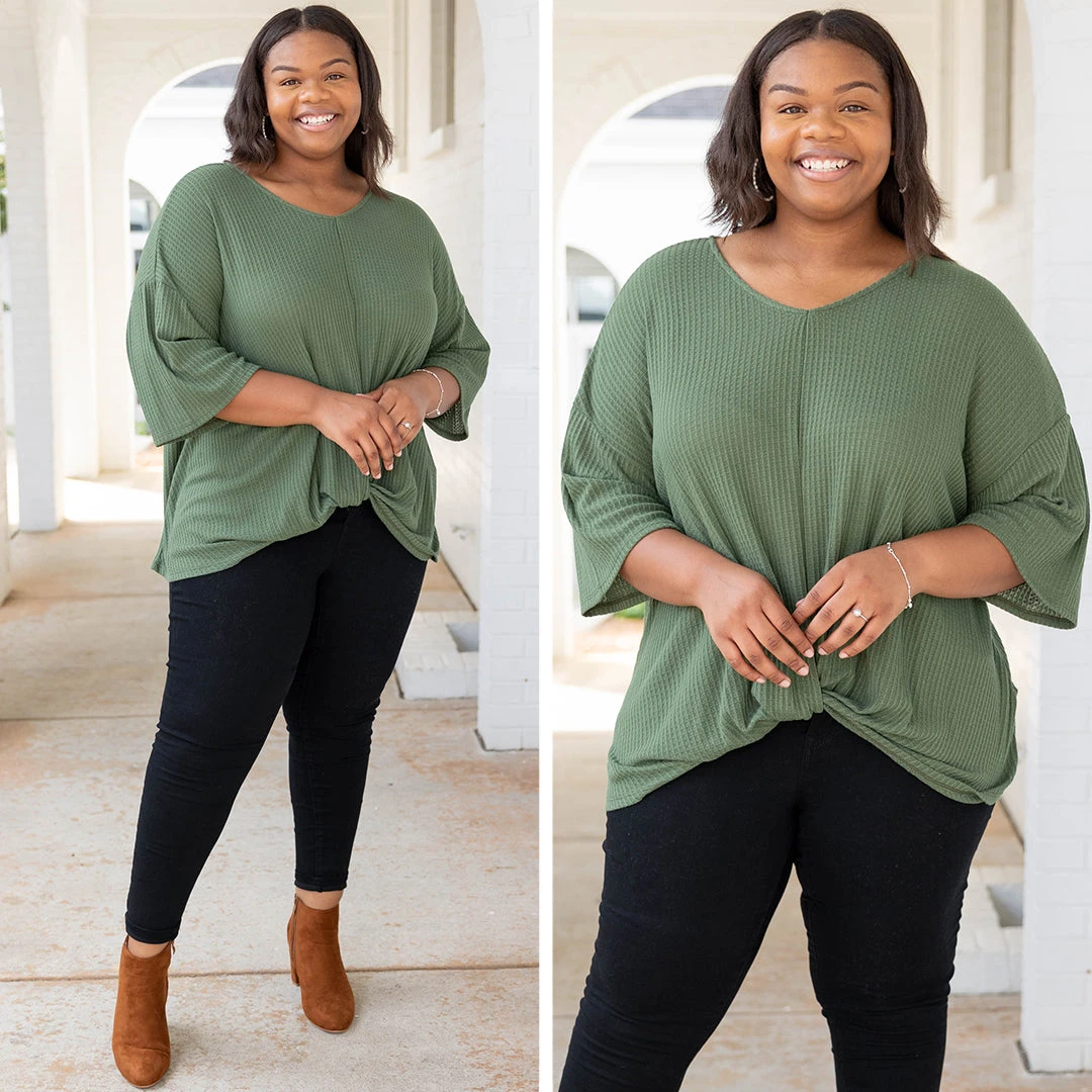 This cute top has stolen our hearts! It has a gorgeous olive color, a dreamy soft fabric, and an oversized fit you will love! Oh and that little knot detail is SO trendy! Wear it casual with skinnies and slides or dress it up with a statement necklace, skinnies, and wedges!