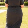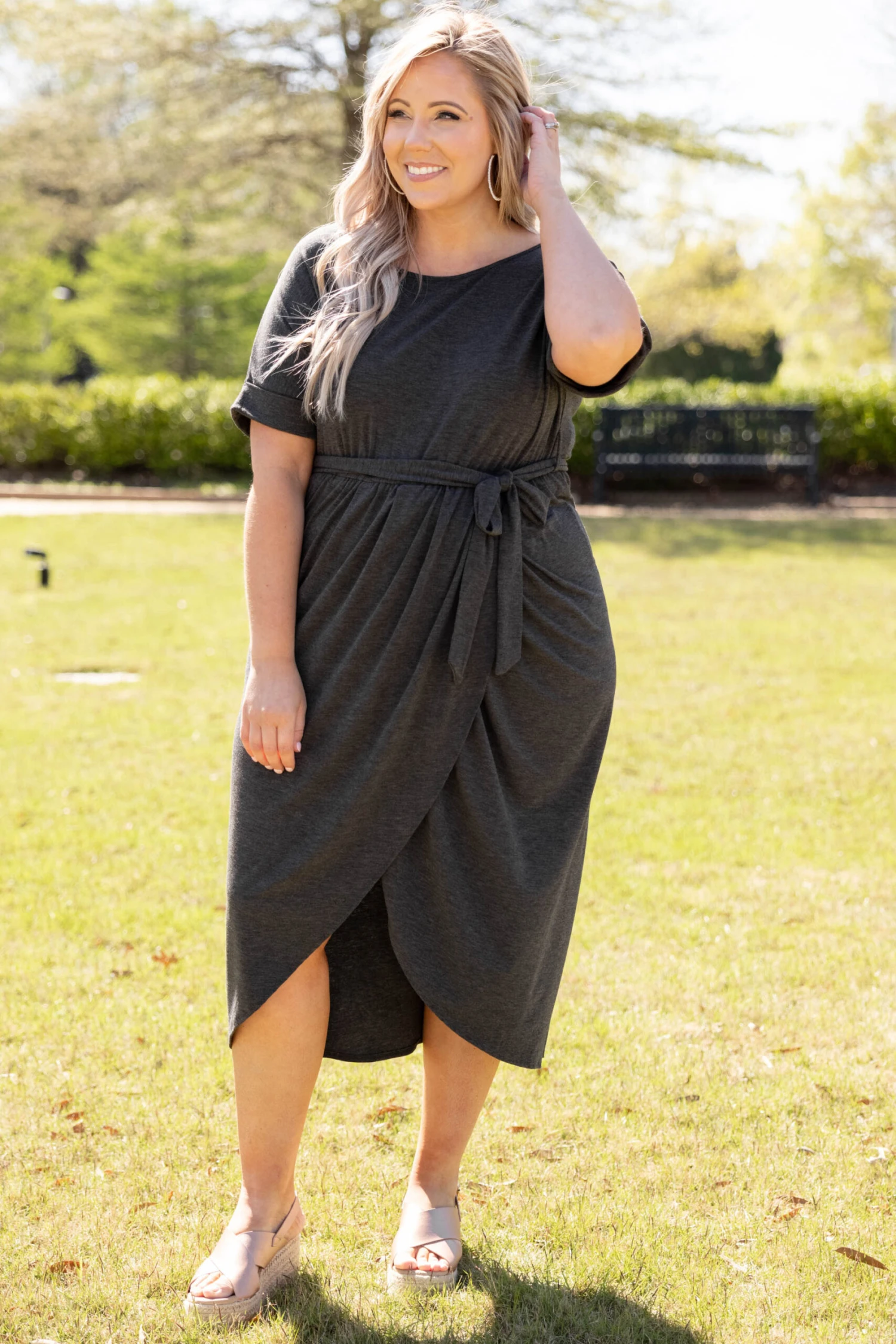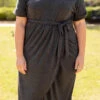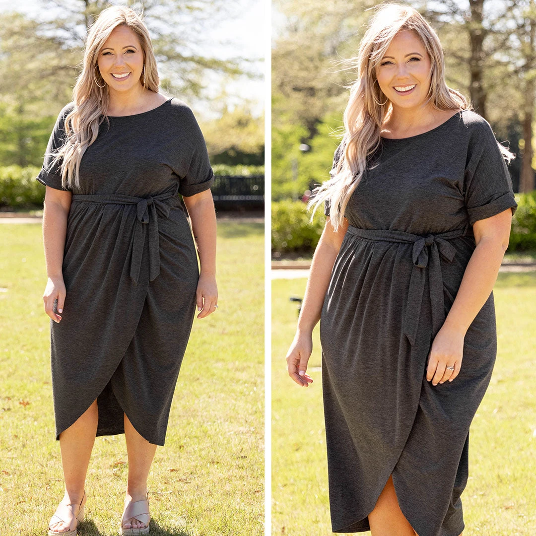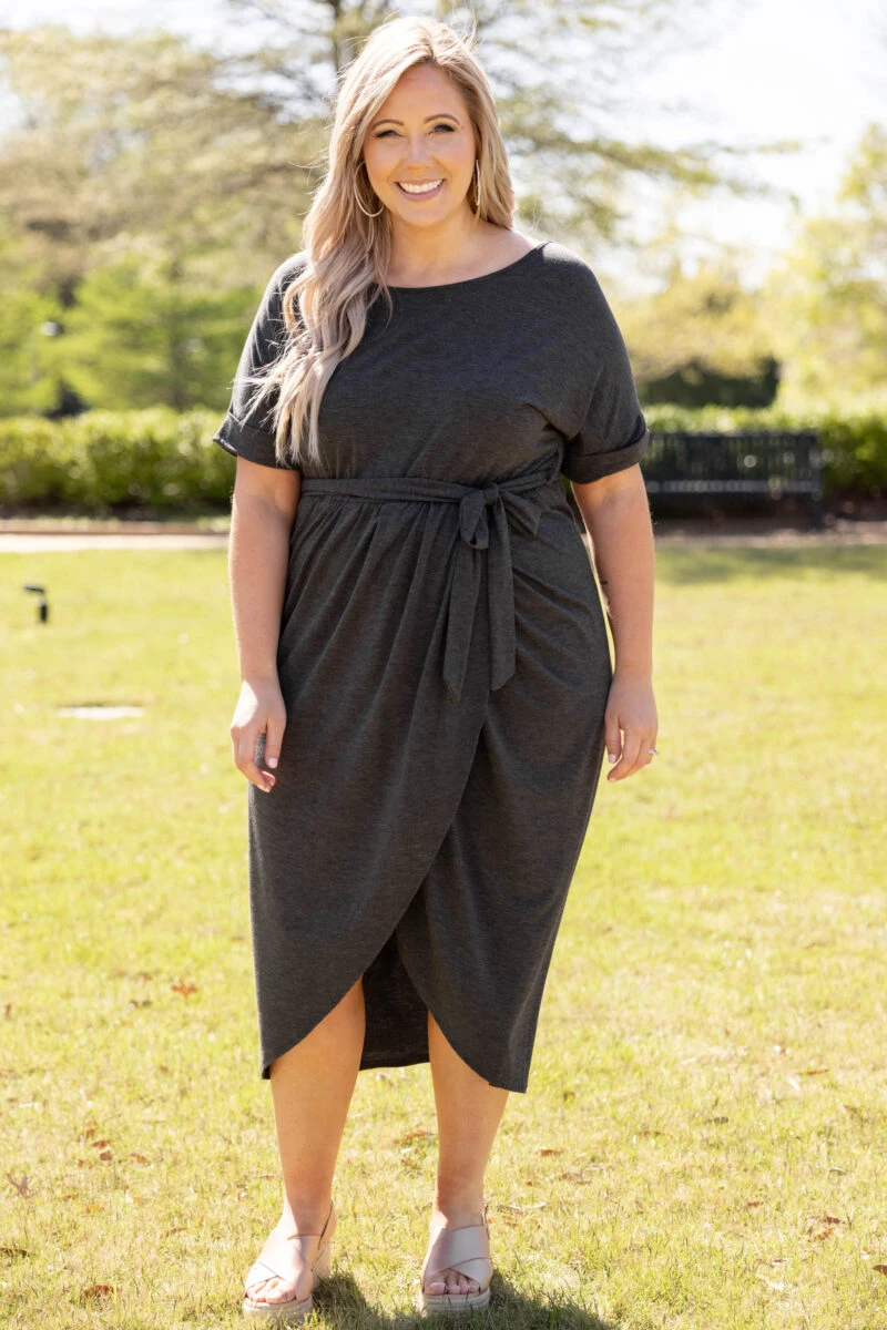 Leave them all speechless in this stunning dress! It’s a must-have for the season! It has a beautiful charcoal color and a super flattering fit. It’s light and breezy, making it perfect for both day and night! Style it with a layered necklace and wedges to complete the look!