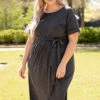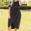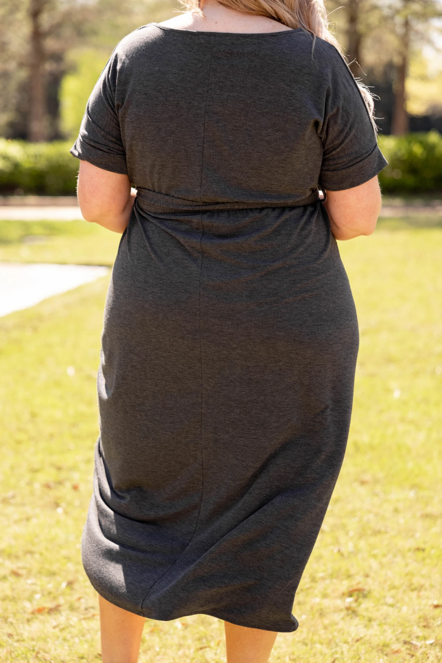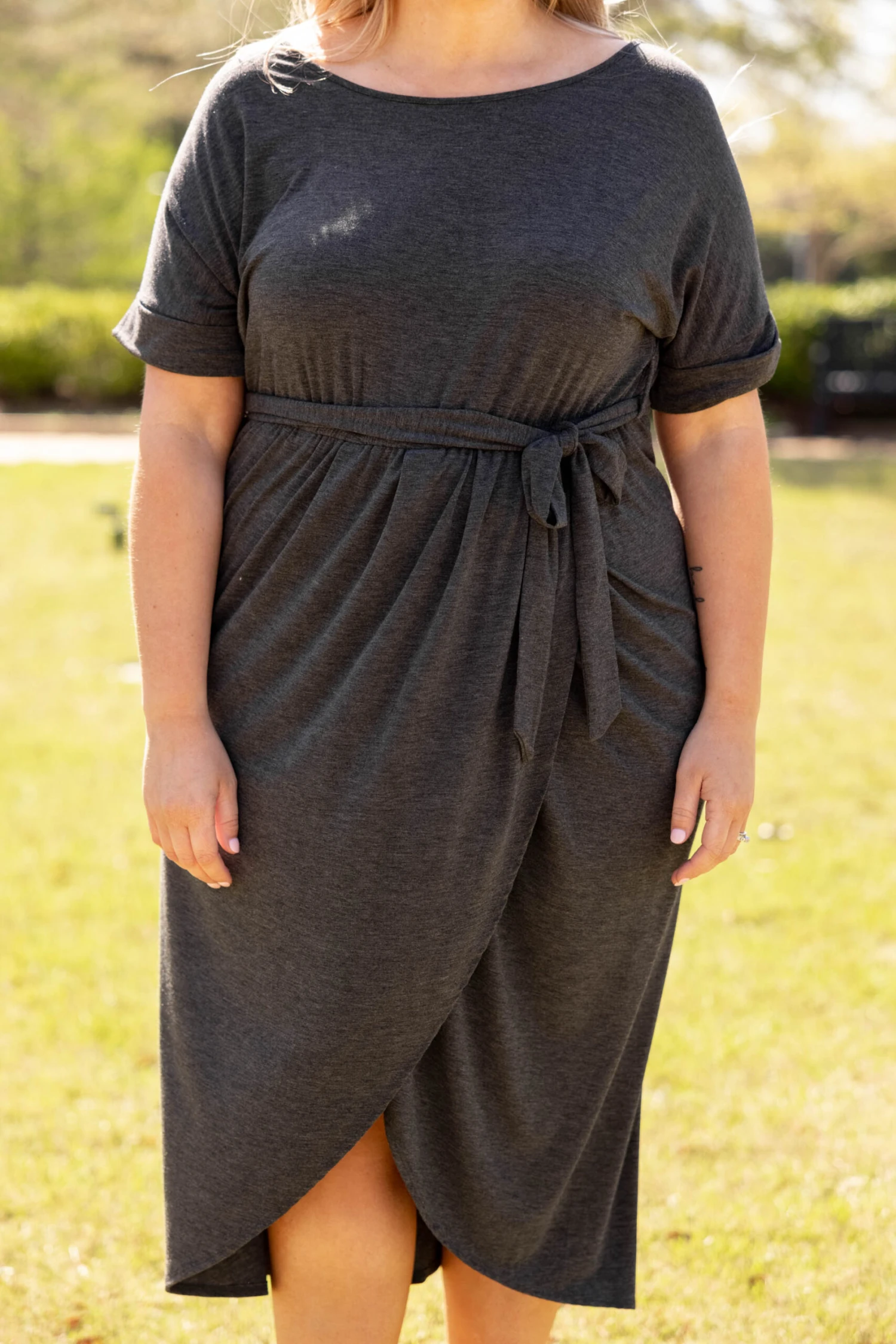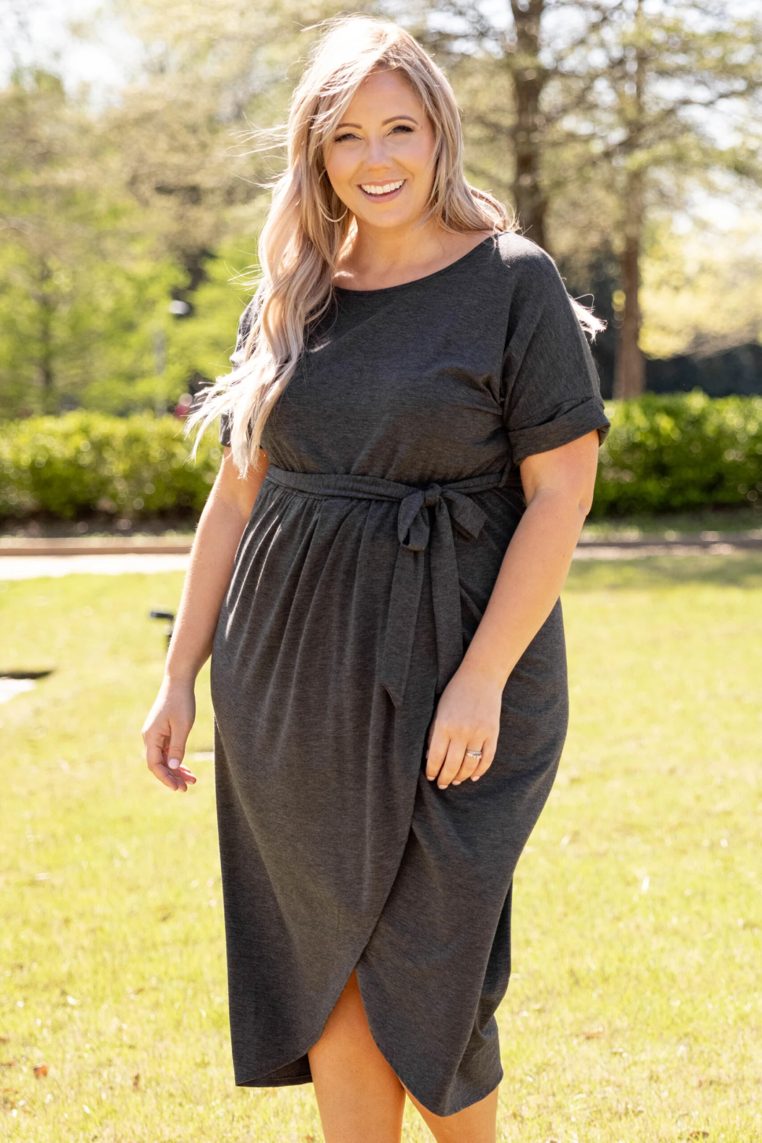 Leave them all speechless in this stunning dress! It’s a must-have for the season! It has a beautiful charcoal color and a super flattering fit. It’s light and breezy, making it perfect for both day and night! Style it with a layered necklace and wedges to complete the look!