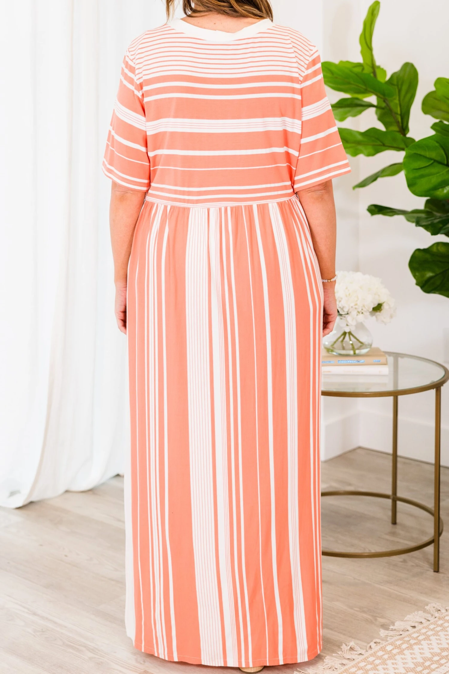 This dress is the one for you! It boasts a charming stripe pattern and a stunning coral white color! This maxi dress combines versatility and style for a perfect addition to your wardrobe! Experience the ultimate blend of comfort and elegance with this must-have piece!