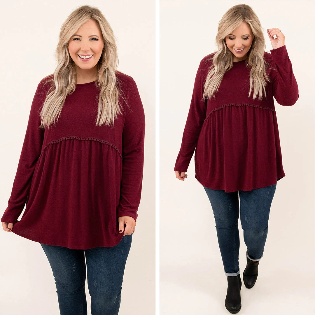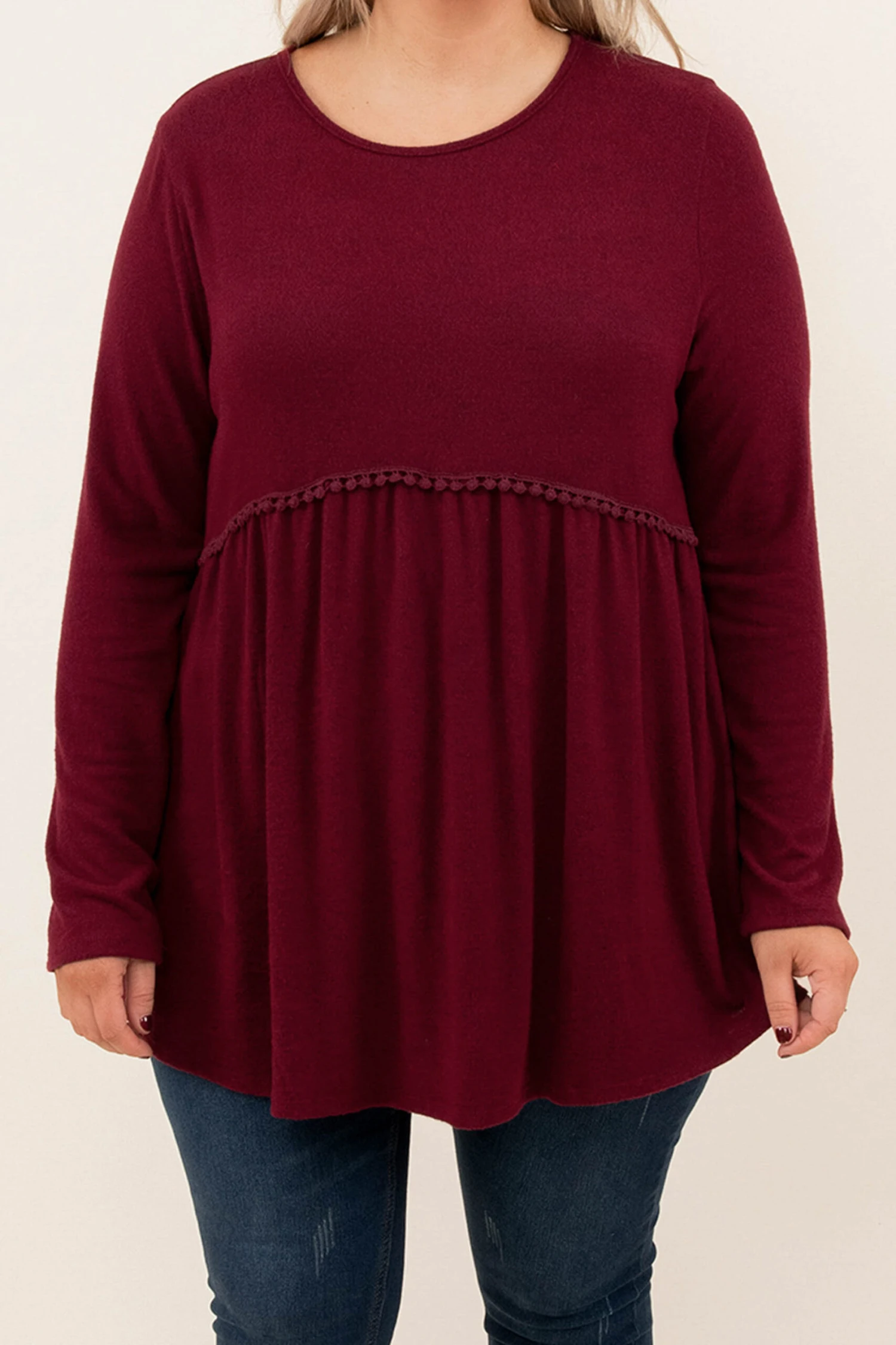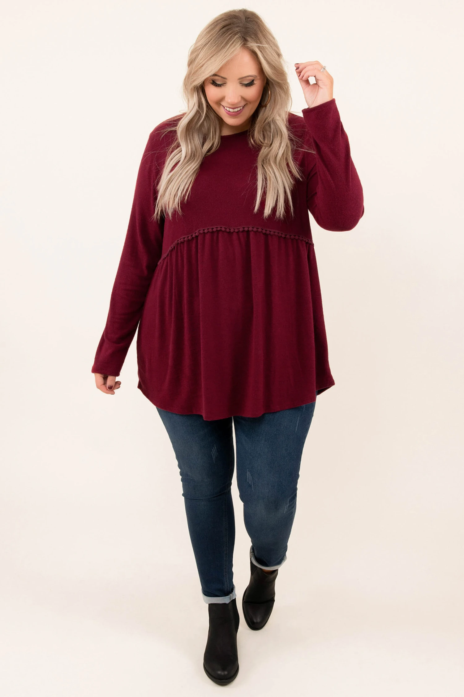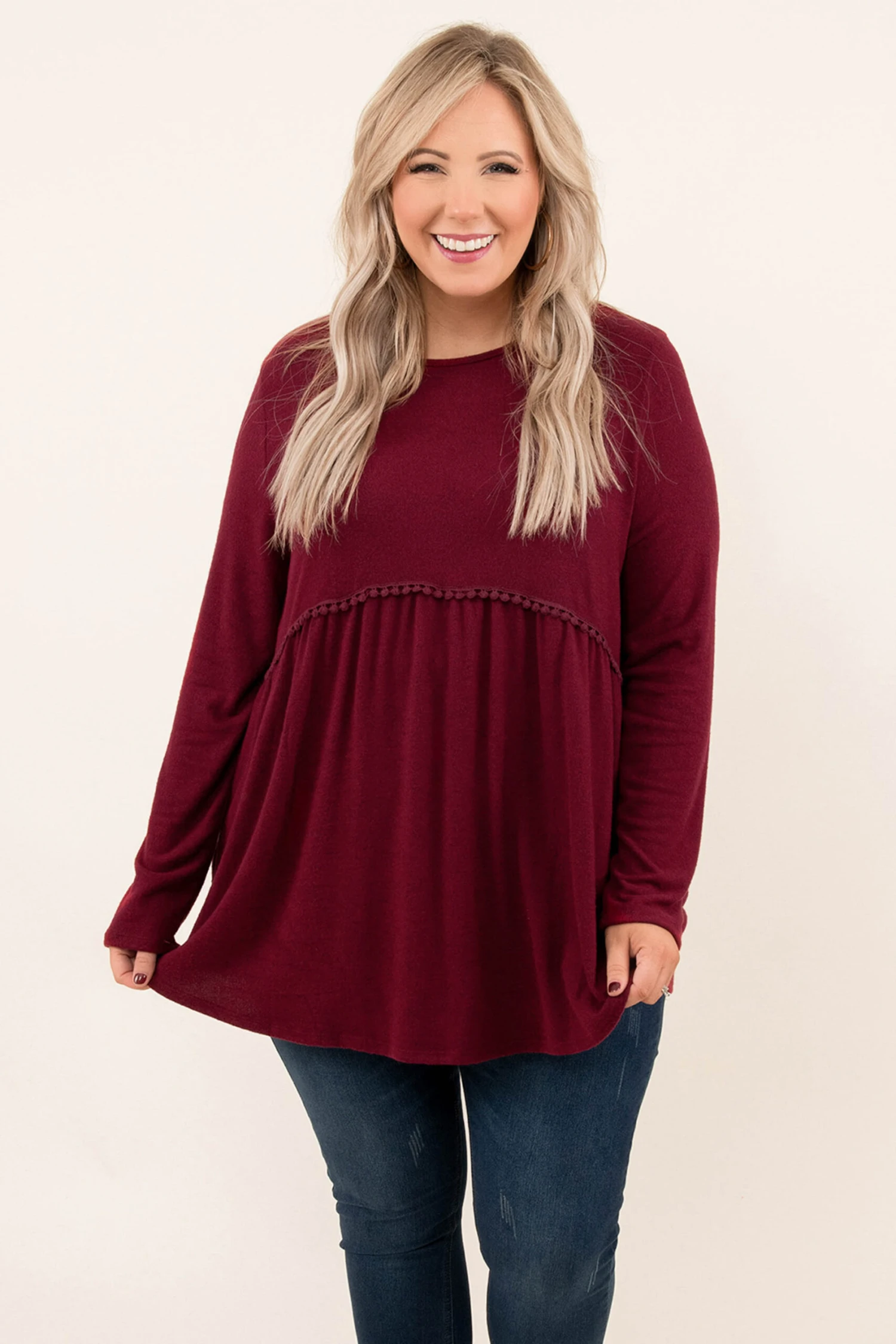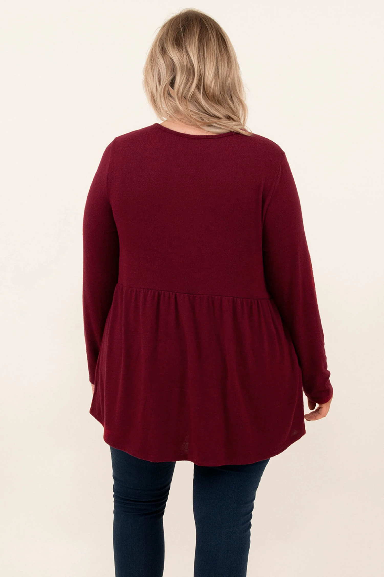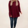 Don’t miss your chance to get this top! The bold burgundy red is perfect to style for any occasion! It’s comfortable for all-day wear, is flattering for all body types, and would look great with any pair of jeans! Just add your favorite shoes and accessories for a chic and stylish look!