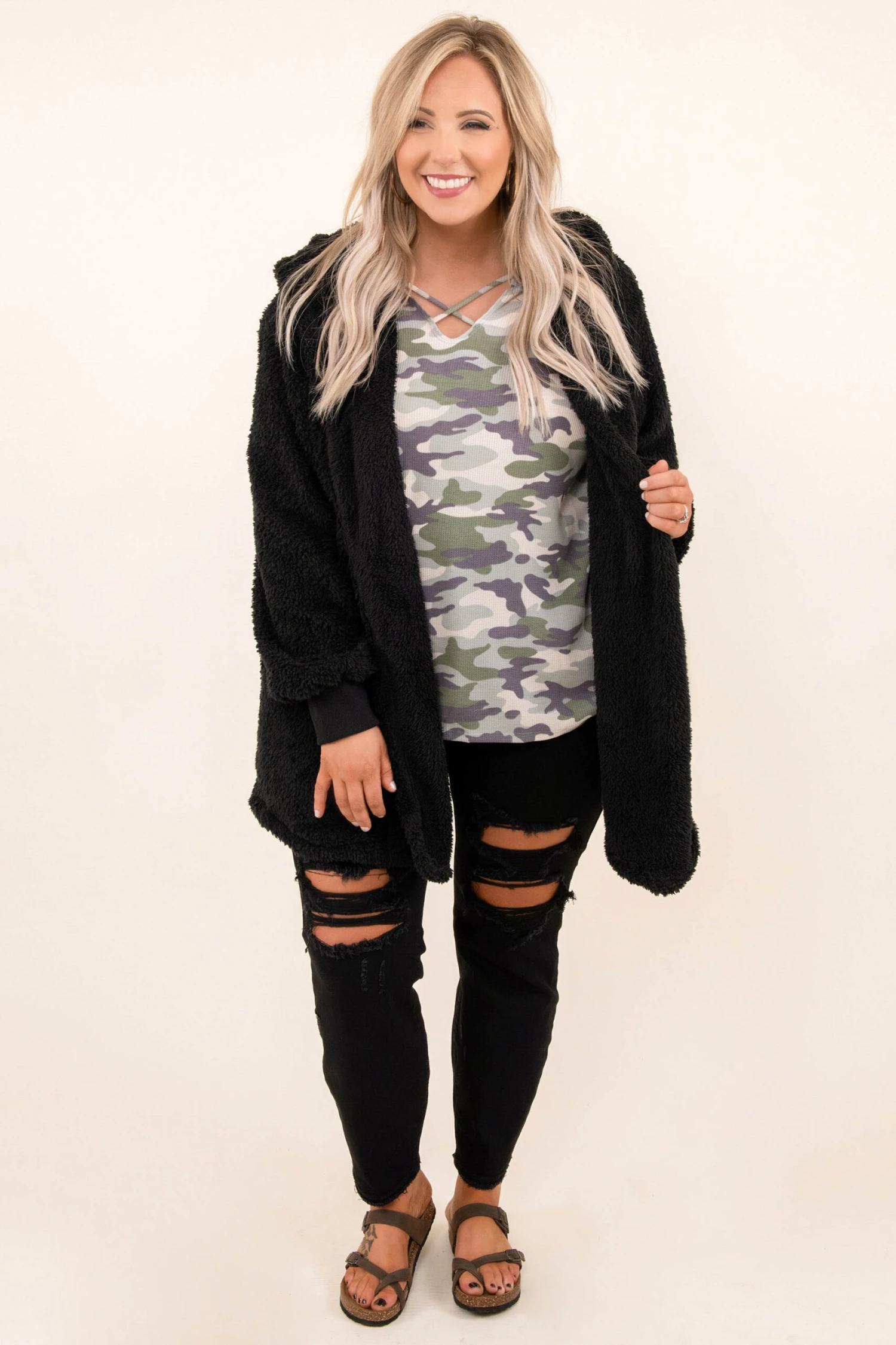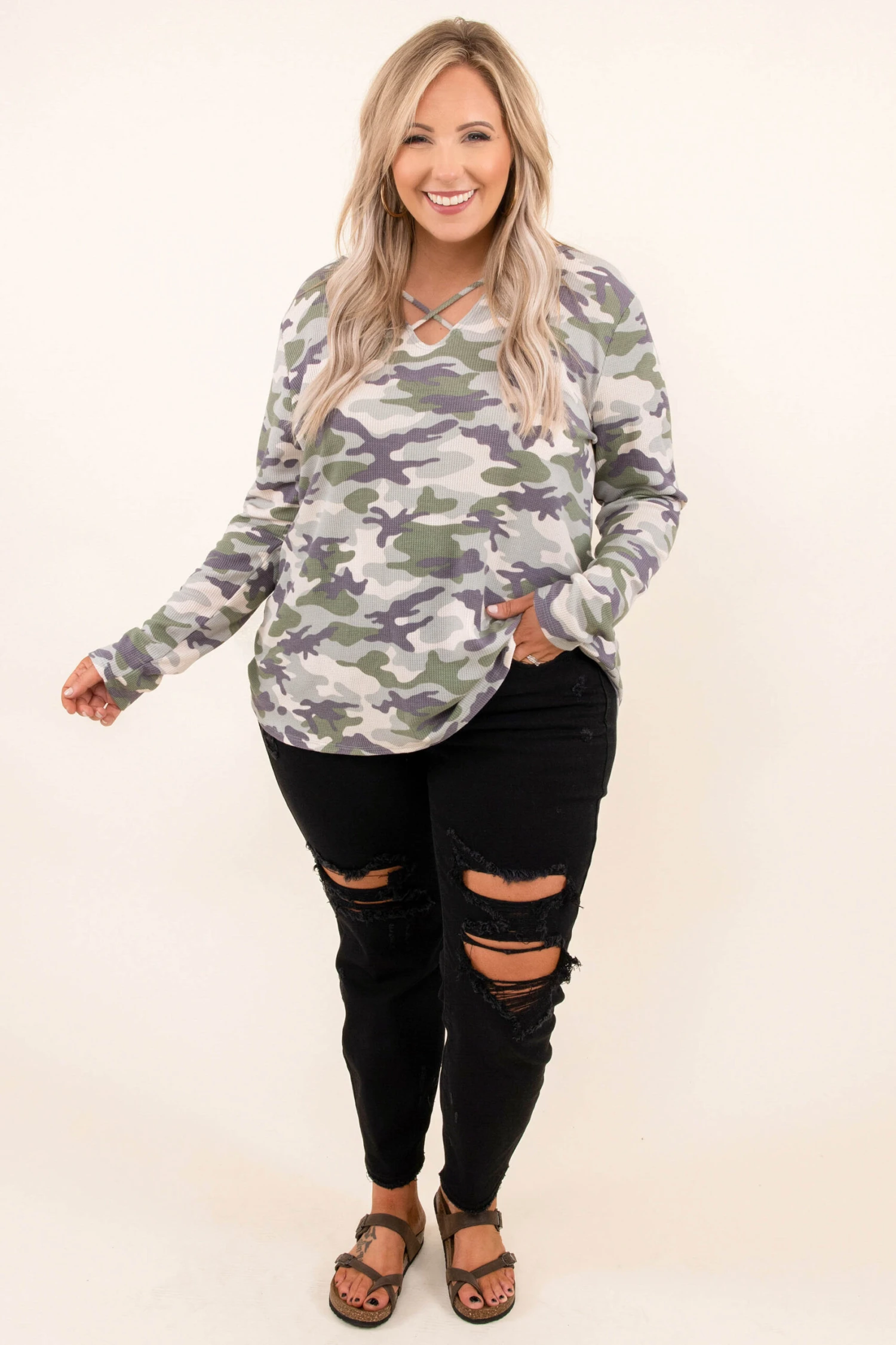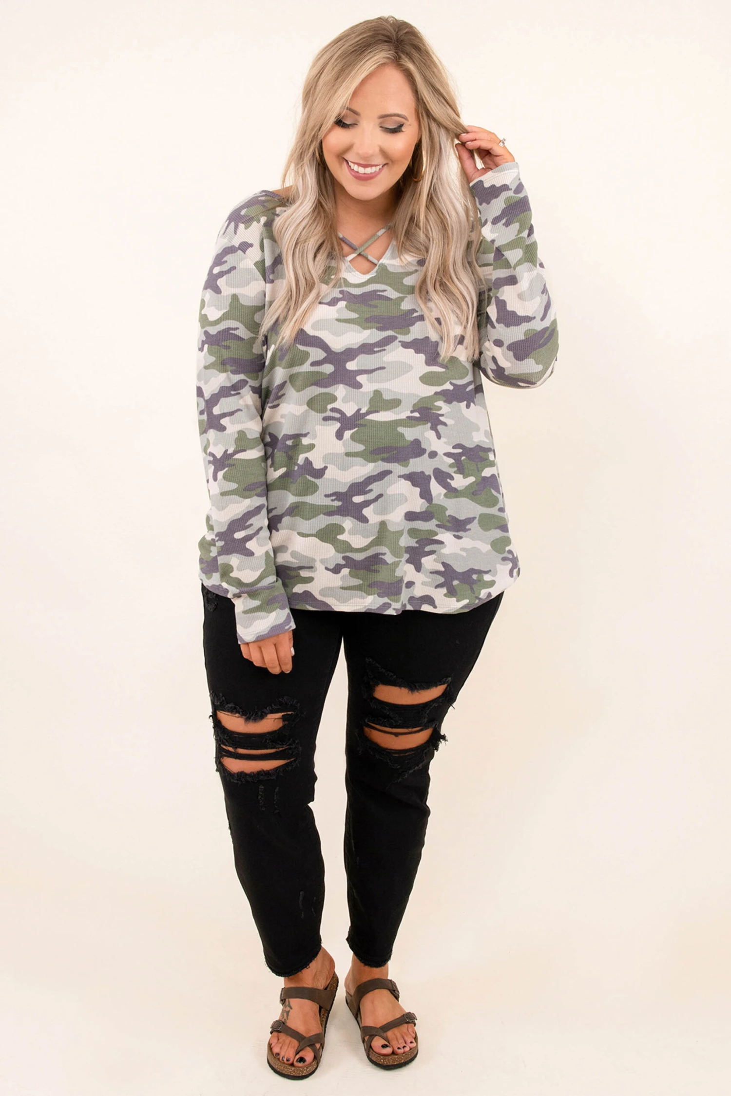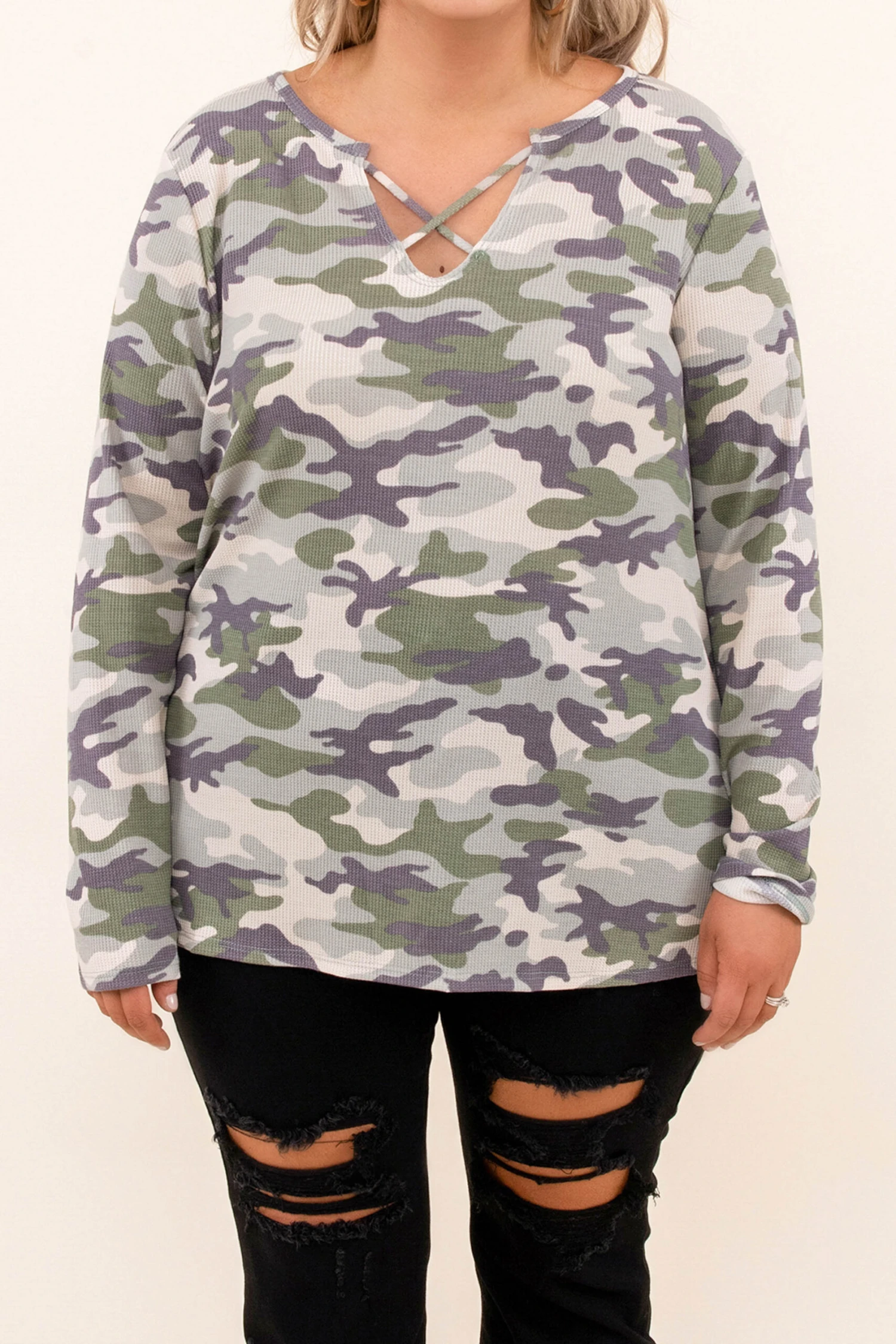 Go on now, go and walk out the door looking super stylish! This top has a camouflage print pattern with neutral colors you can style for every occasion! It’s comfortable for all-day wear, has a figure-flattering fit, and features the cutest criss-cross! Pair this top with skinnies for an effortlessly chic look!