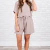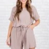 Get in a hurry to grab this beauty! This romper has a neutral ash mocha color with a stretchy, flirty fit that is so sweet! You can dress this romper up with some cute accessories and heels or keep it casual with some sneakers for a classic chic look!