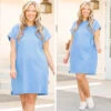 We are in awe of the beauty if this dress! It is the perfect combination of comfort & functionality! The soft denim-blue fabric drapes comfortably & is equipped with functional pockets to hold your belongings! A great piece for every wardrobe!