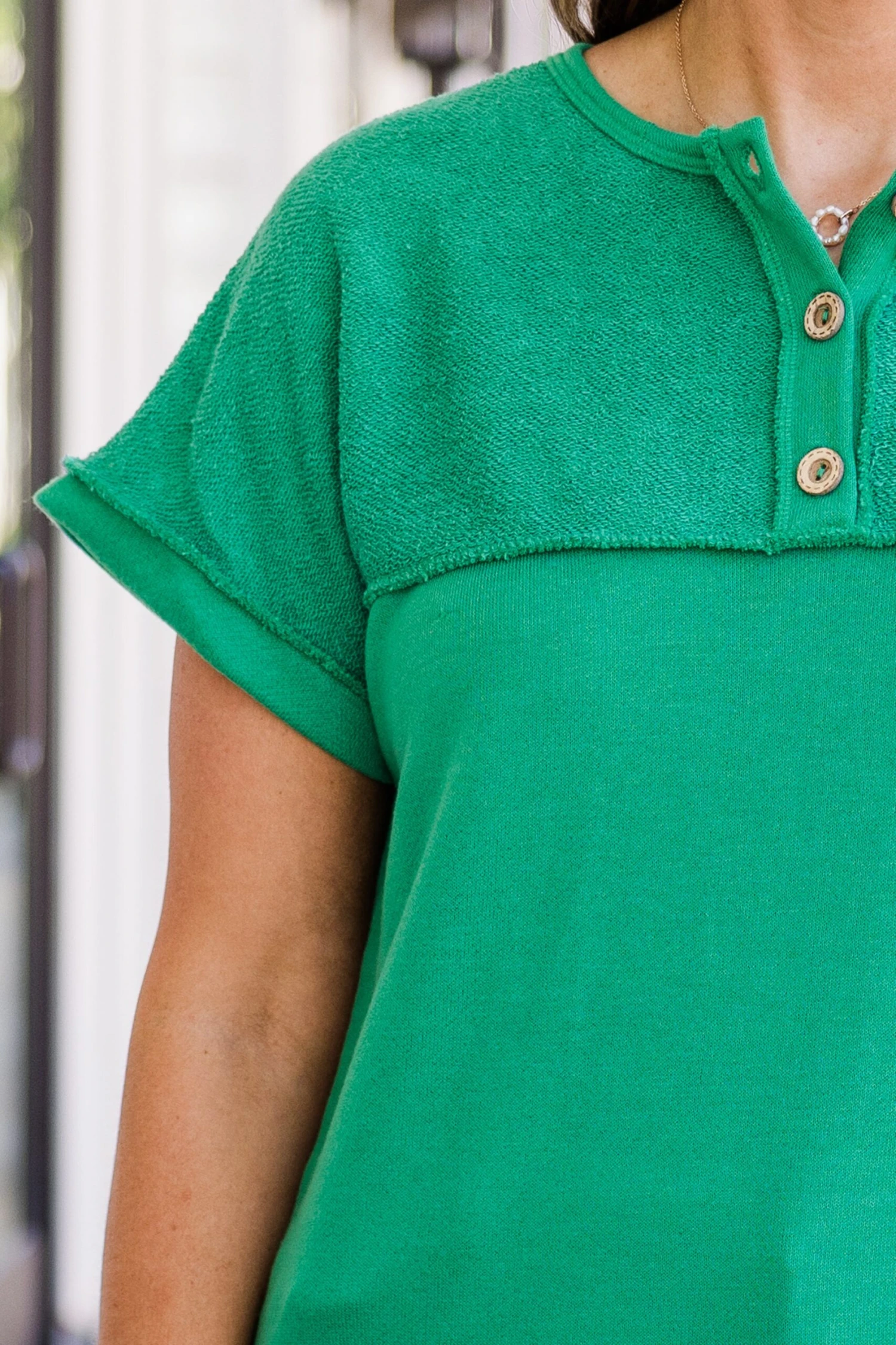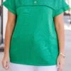 Get ready to rock your style with this top! In a pretty kelly green color, this top features a unique contrast fabric and functional buttons! Dress it up or down for any occasion! In due time, this top will become your go-to piece for effortless style!