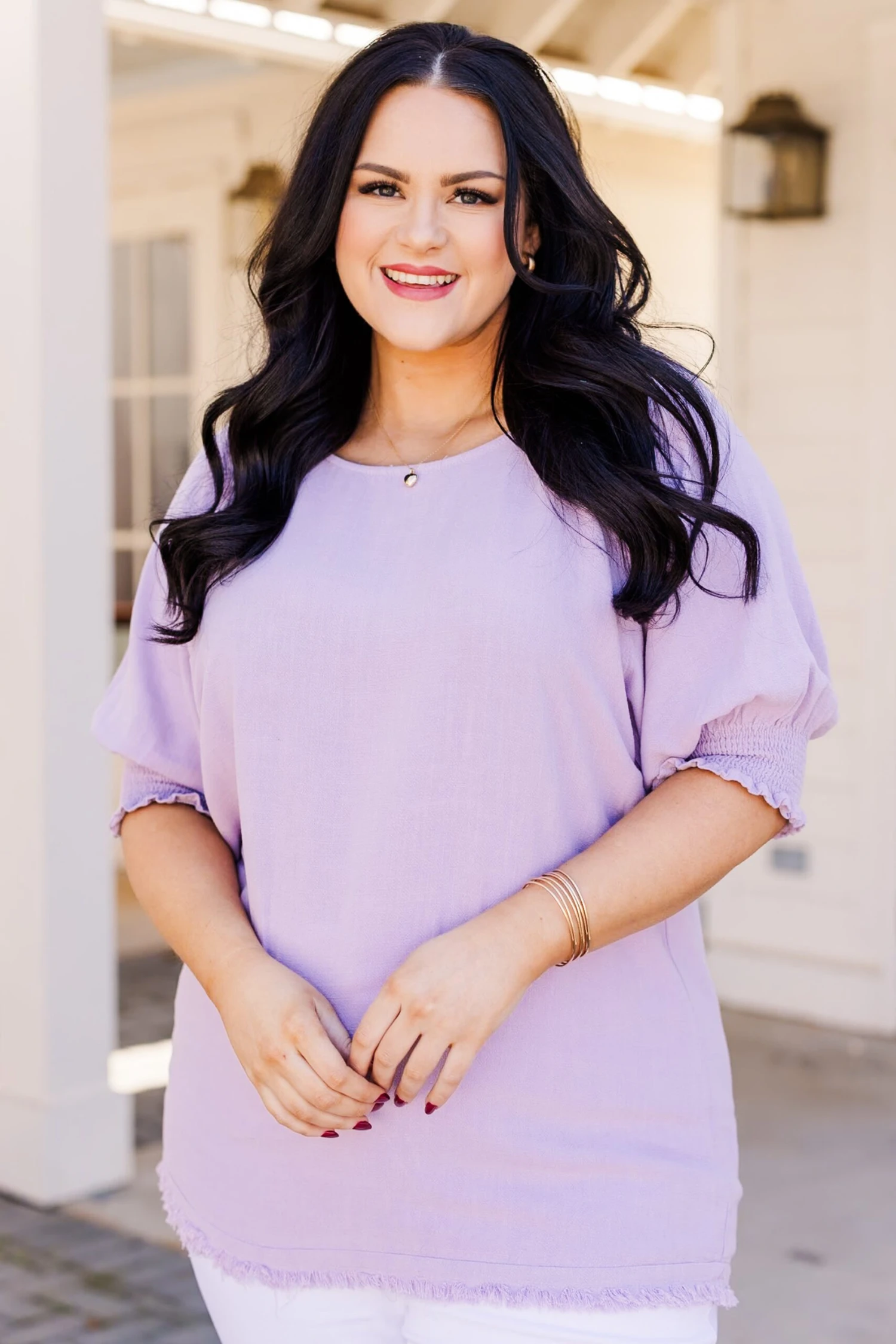 Enjoy the fab style of this beautiful top! It boasts a frayed hemline, smocking detail on the sleeves, and a gorgeous color that is perfect for a casual day out! Pair it with white denim and heels for a classic and chic look!
