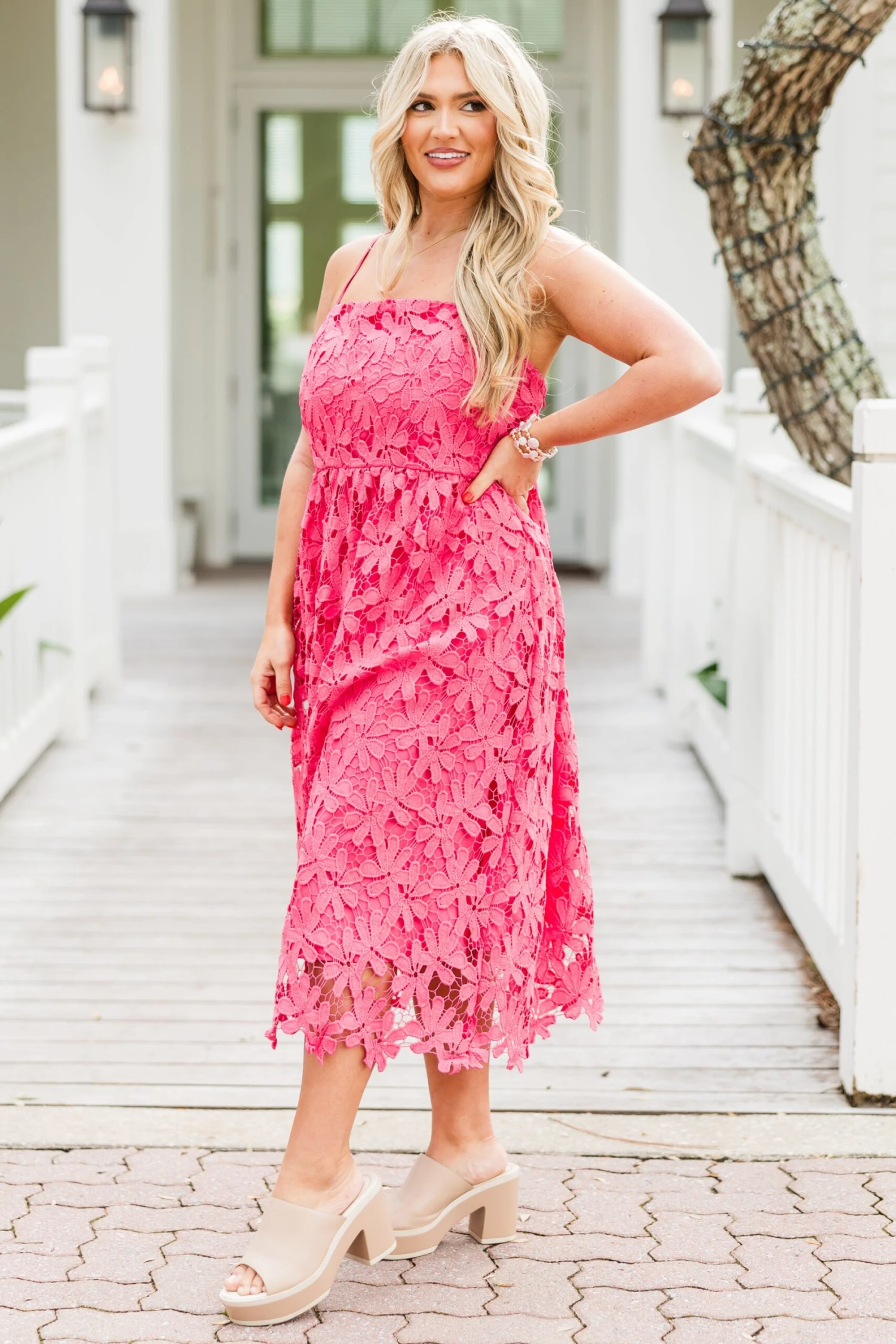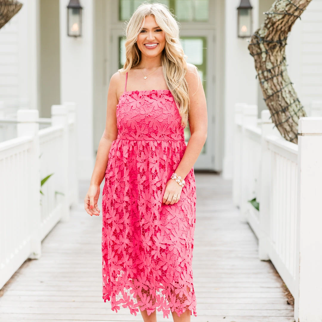 With a chic and timeless pink lace design, this midi dress is the perfect choice for any special occasion! Featuring adjustable spaghetti straps and a square neckline, this dress exudes sophistication and elegance! Turn heads and make a statement by pairing it with your favorite clutch and heels!