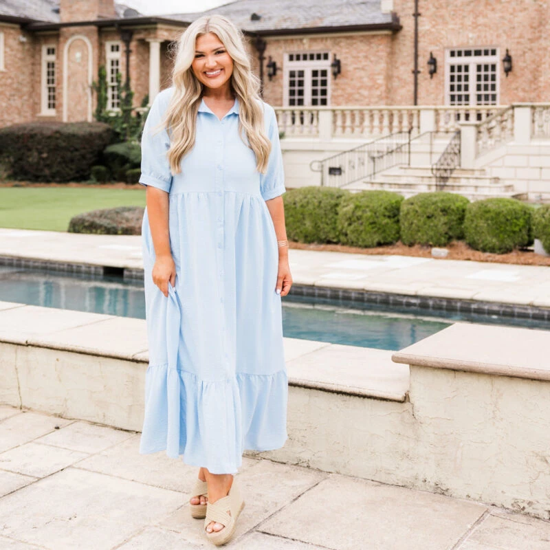 You’ll always be in your happy place while wearing this beauty! Featuring a perfect maxi length and a pretty blue color, this dress is designed with a button up front for a classic touch! Be the picture of effortless fashion and comfort in this classic cutie!