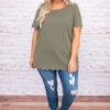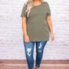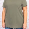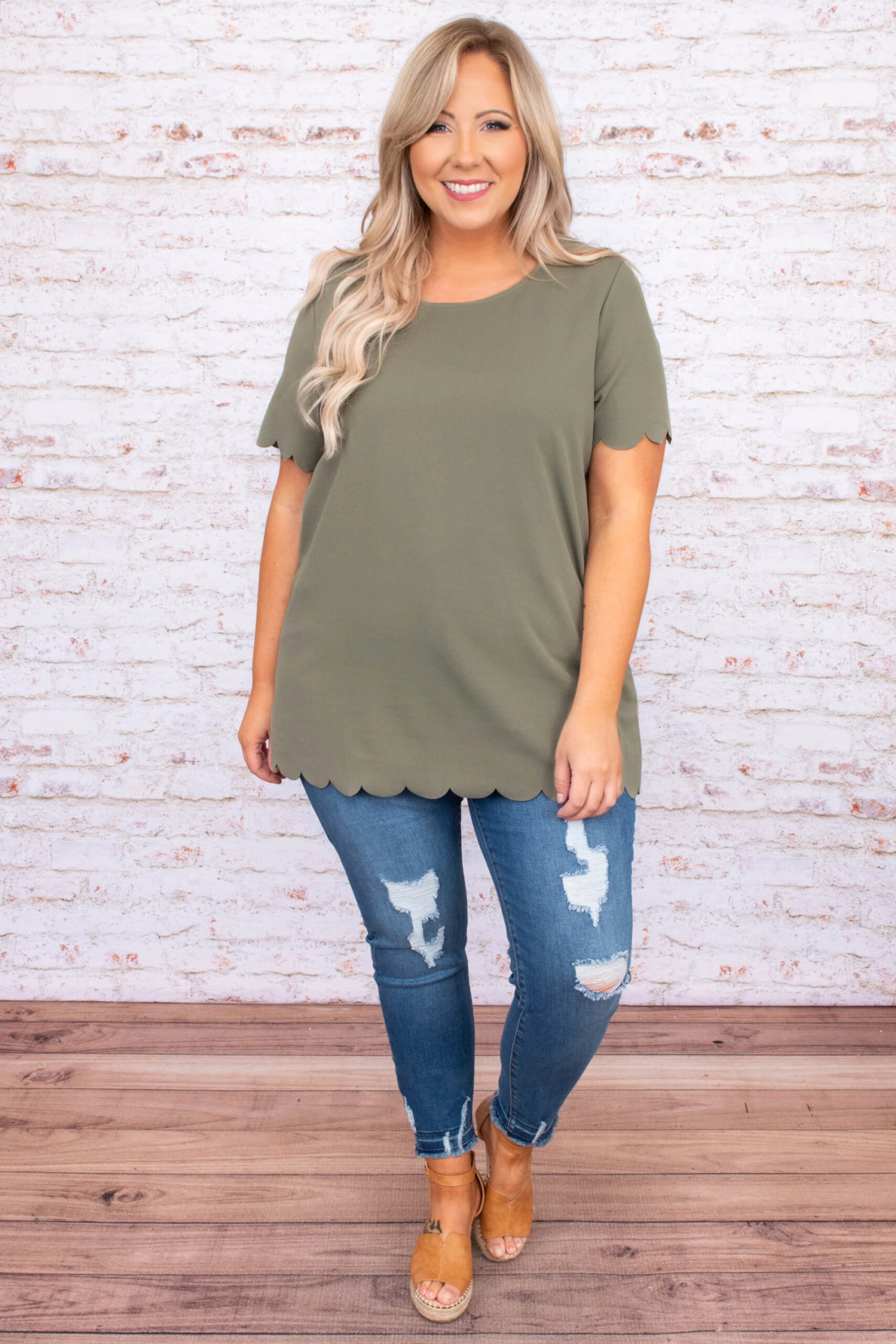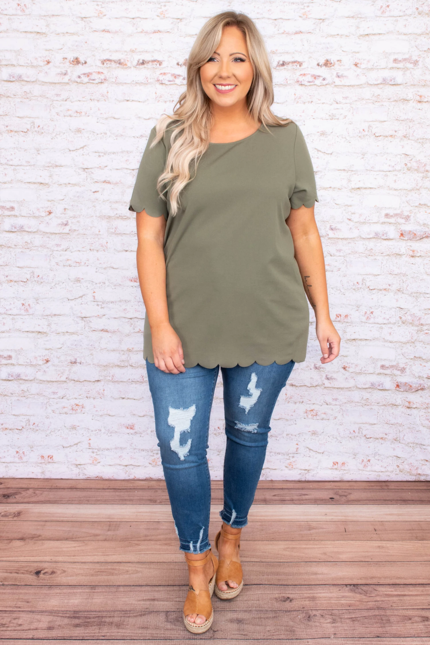 This top is incredibly beautiful! It has a beautiful green color and sweet scallop hem! It’s great for work and play!! Style it with a bold necklace and white skinnies for a super chic outfit!