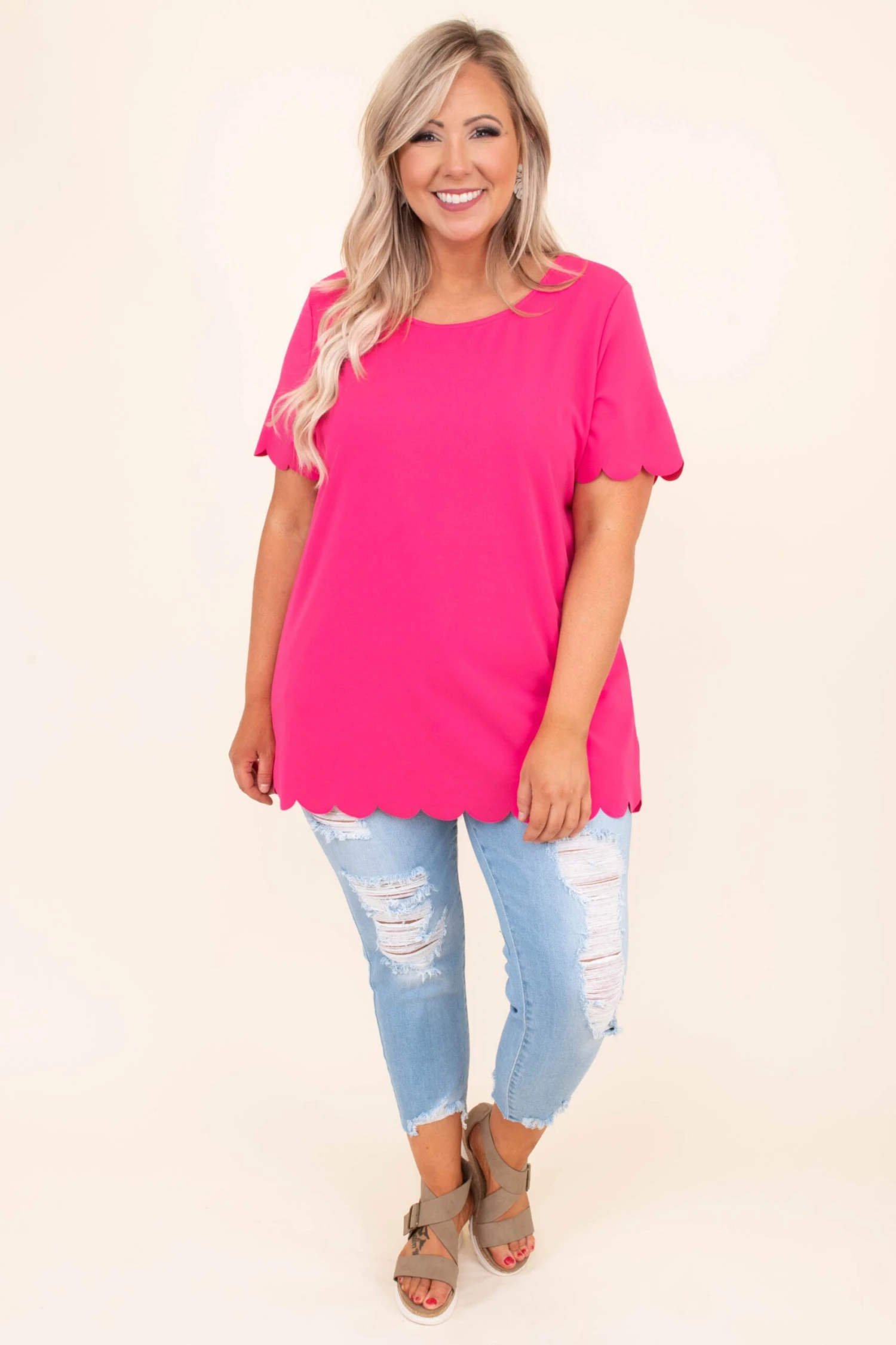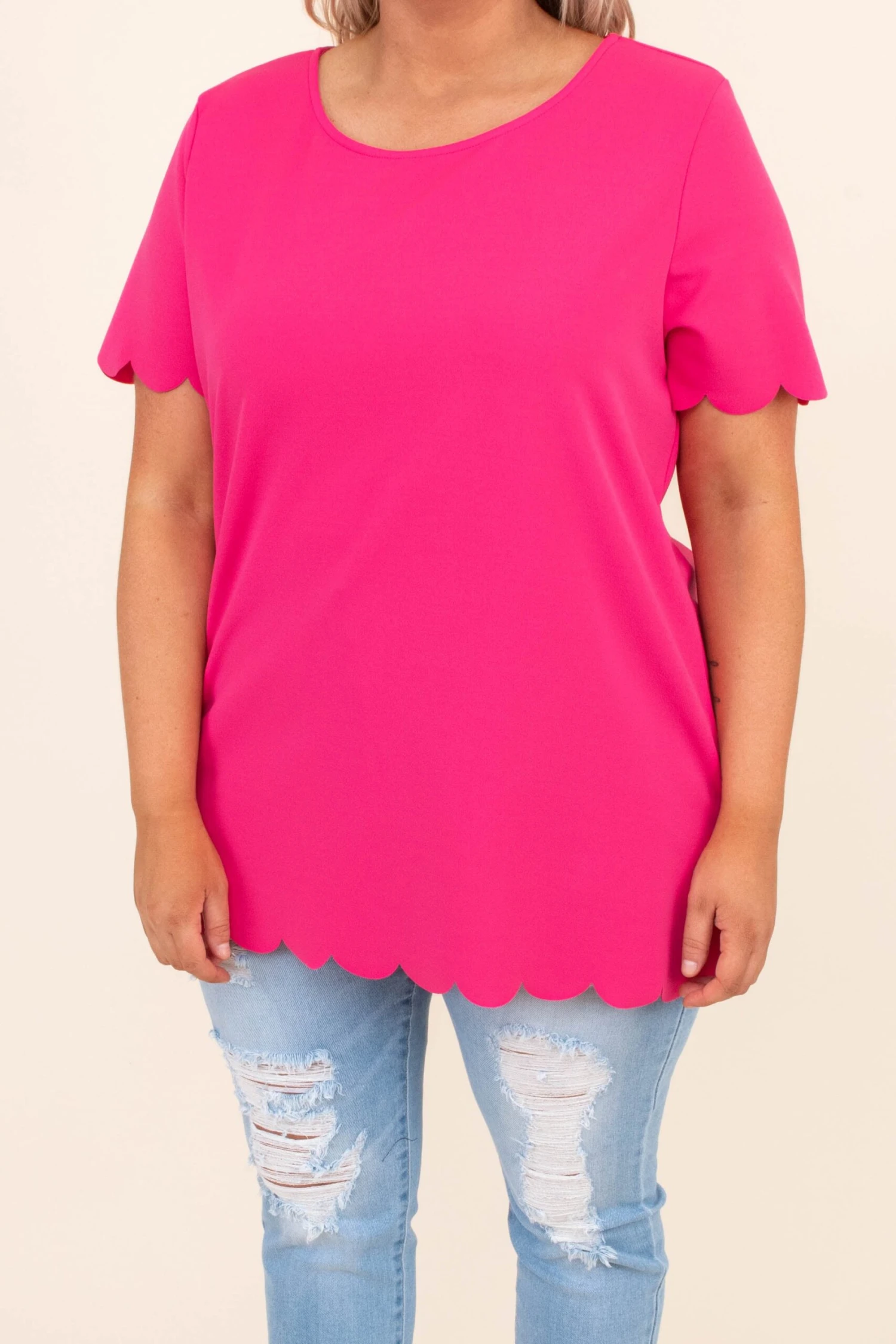 This top is incredibly beautiful! It has a beautiful pink color and sweet scallop hem! It’s great for work and play!! Style it with a bold necklace and white skinnies for a super chic outfit!
