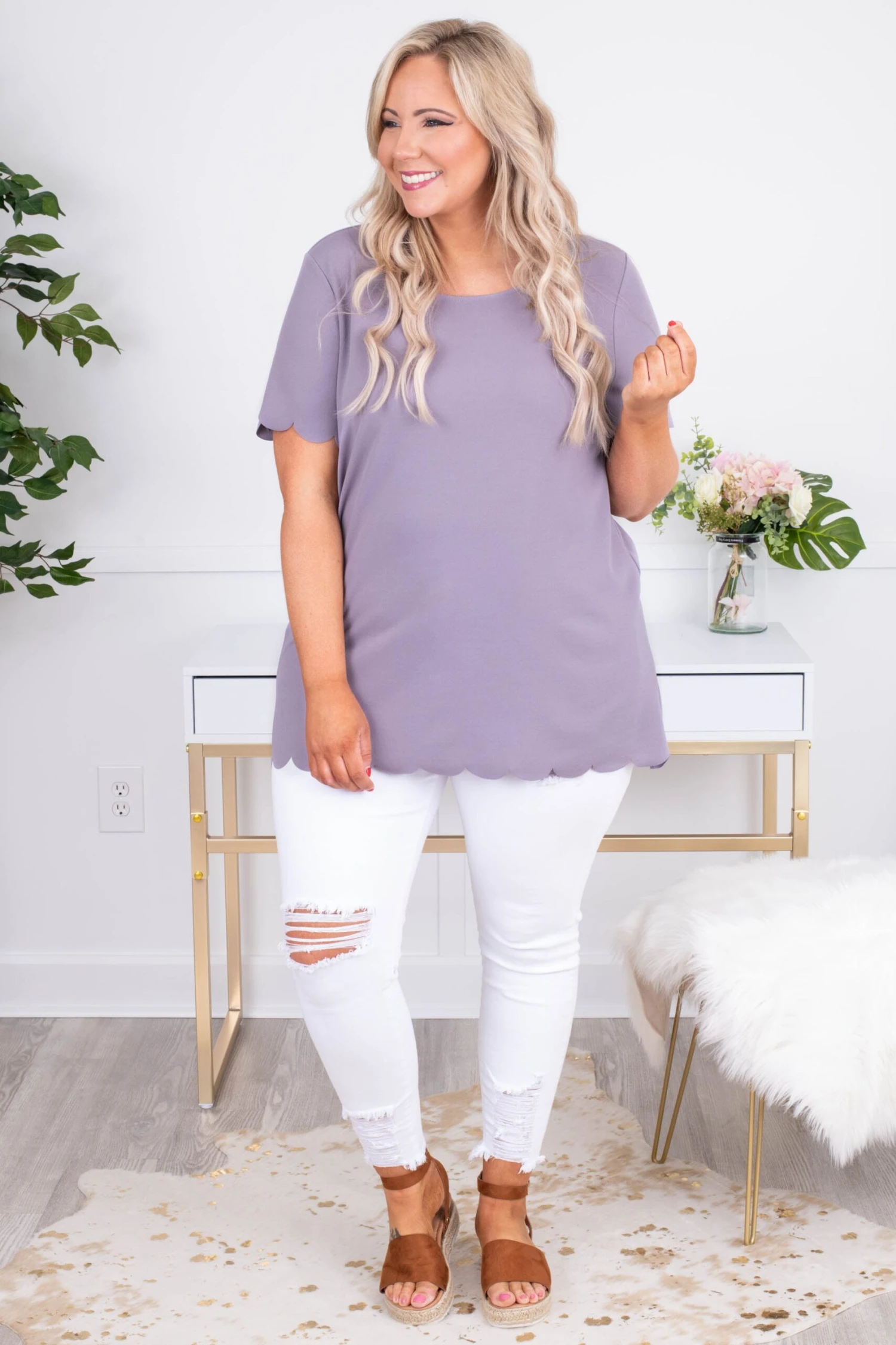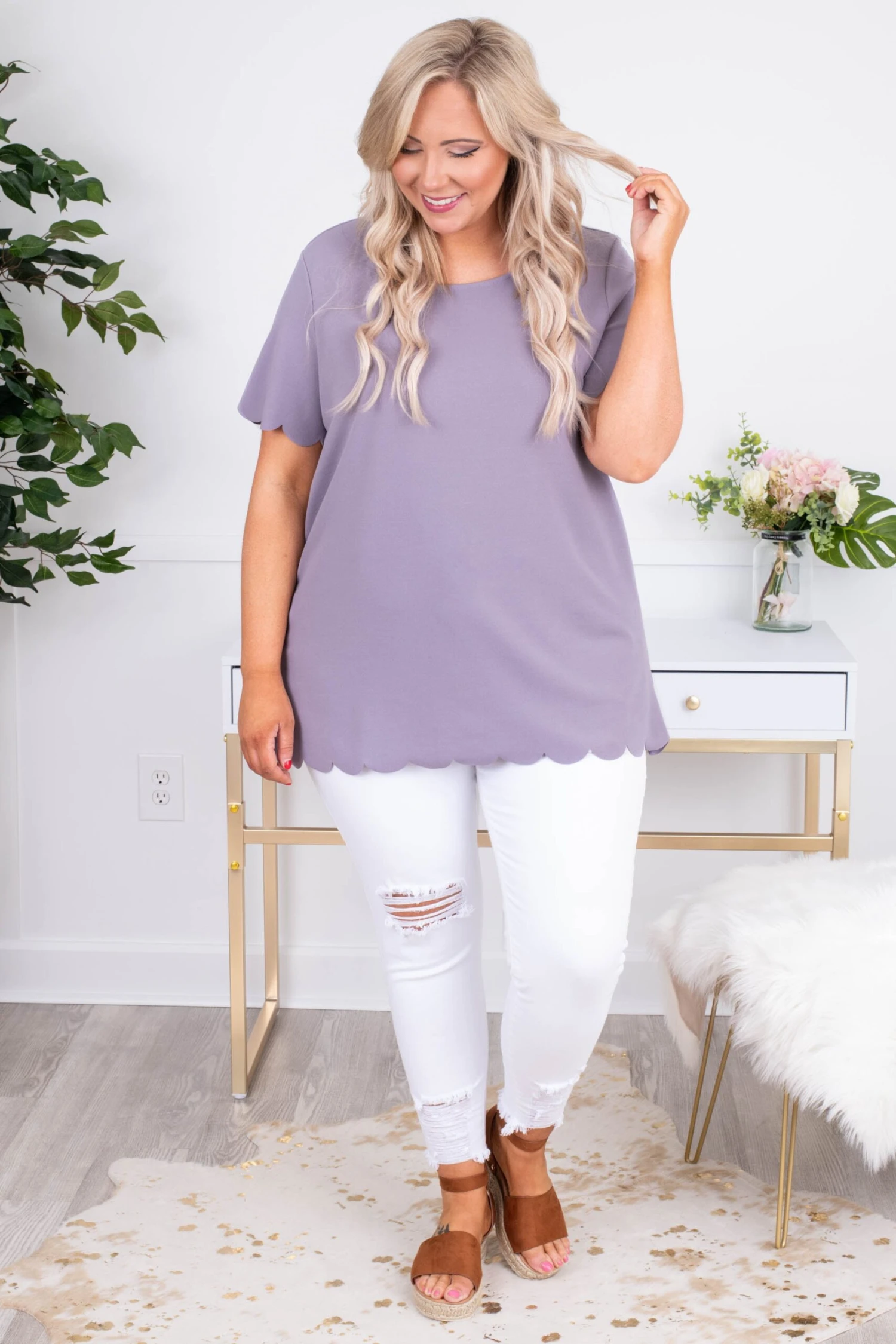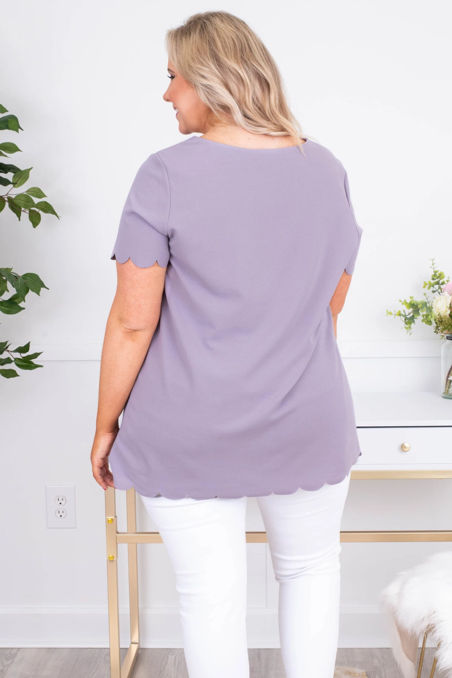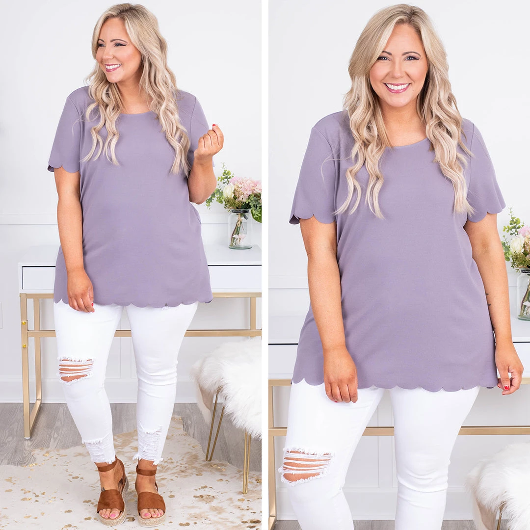 This top is incredibly beautiful! It has a beautiful lavender color and sweet scallop hem! It’s great for work and play!! Style it with a bold necklace and white skinnies for a super chic outfit!