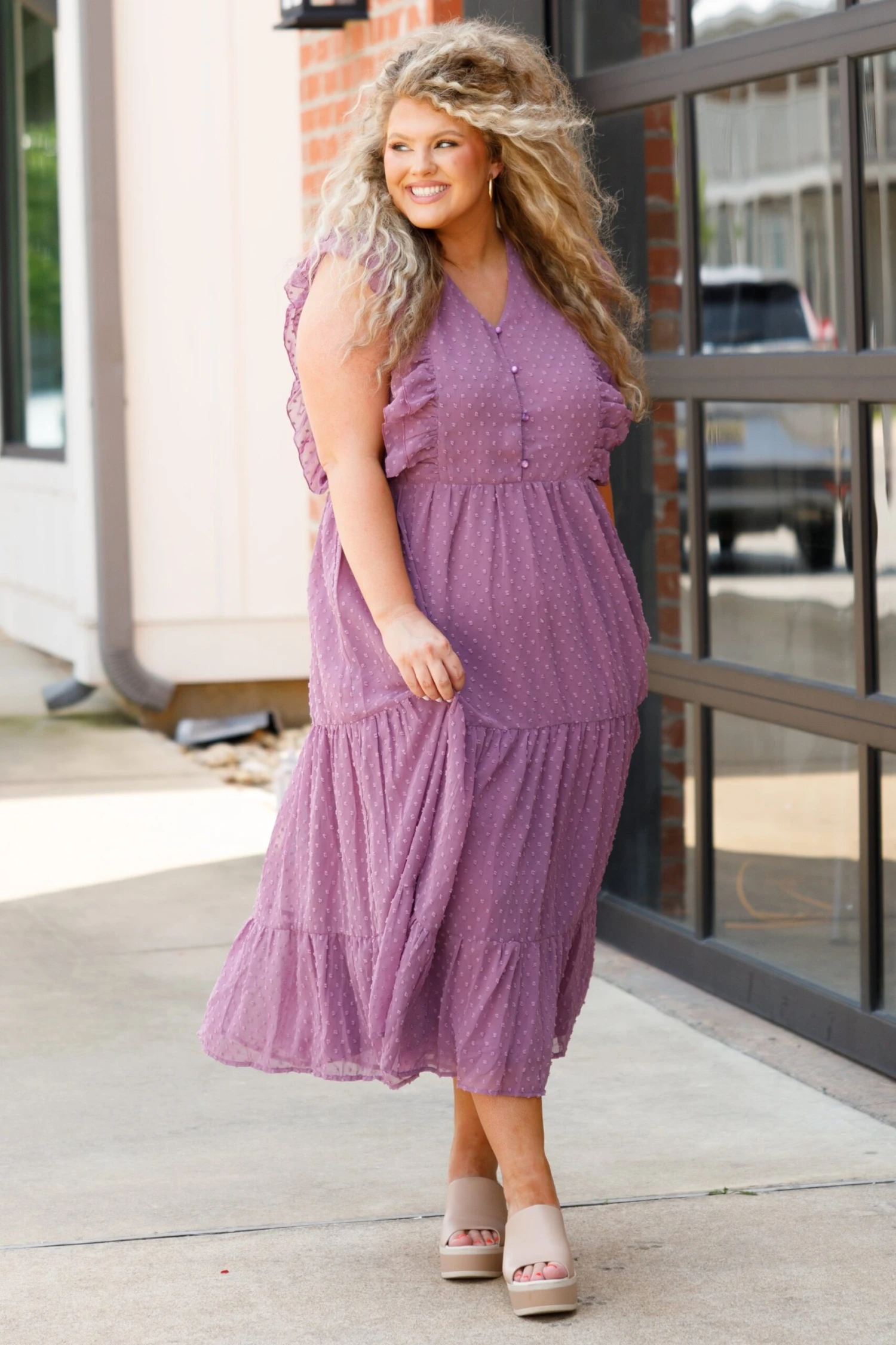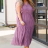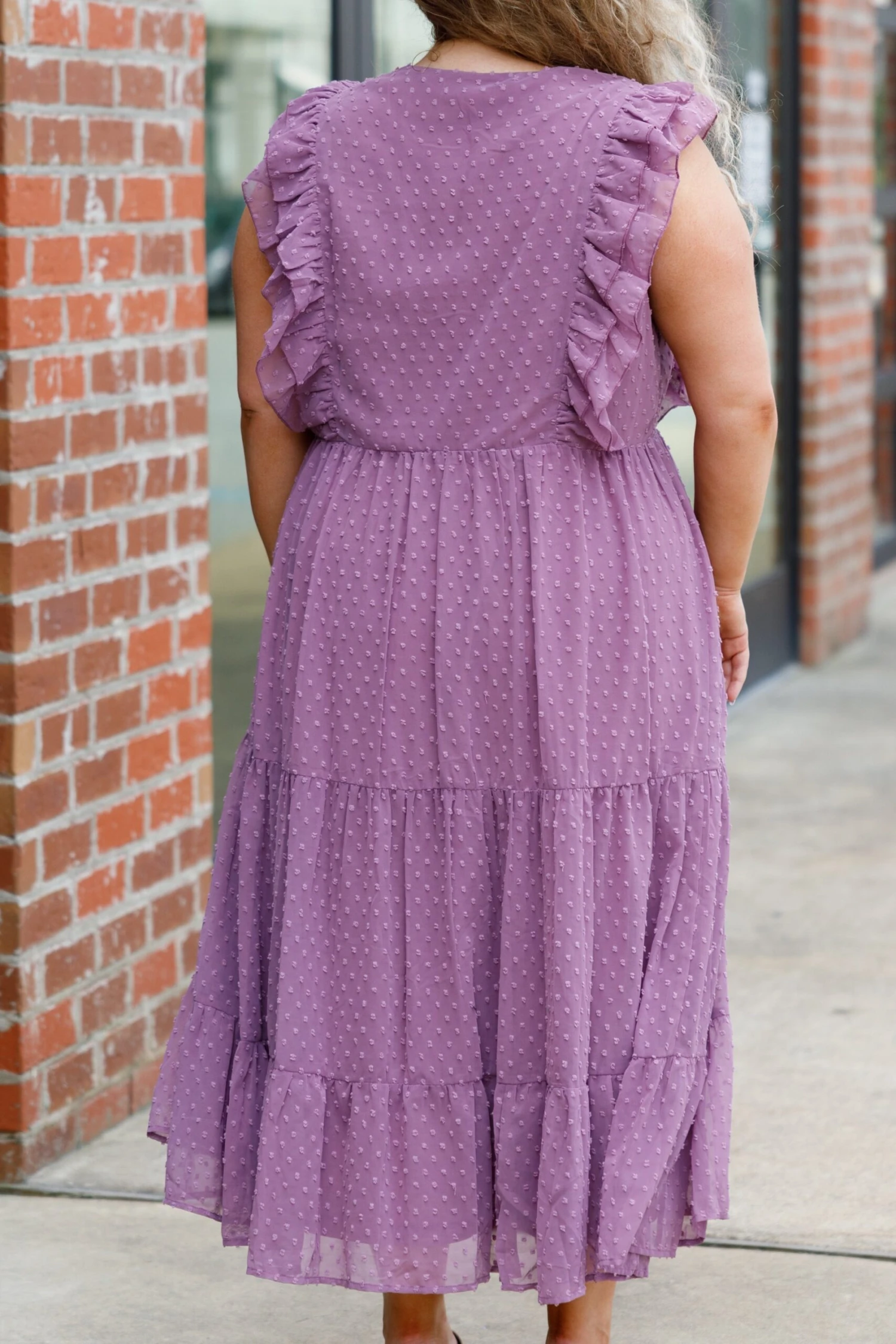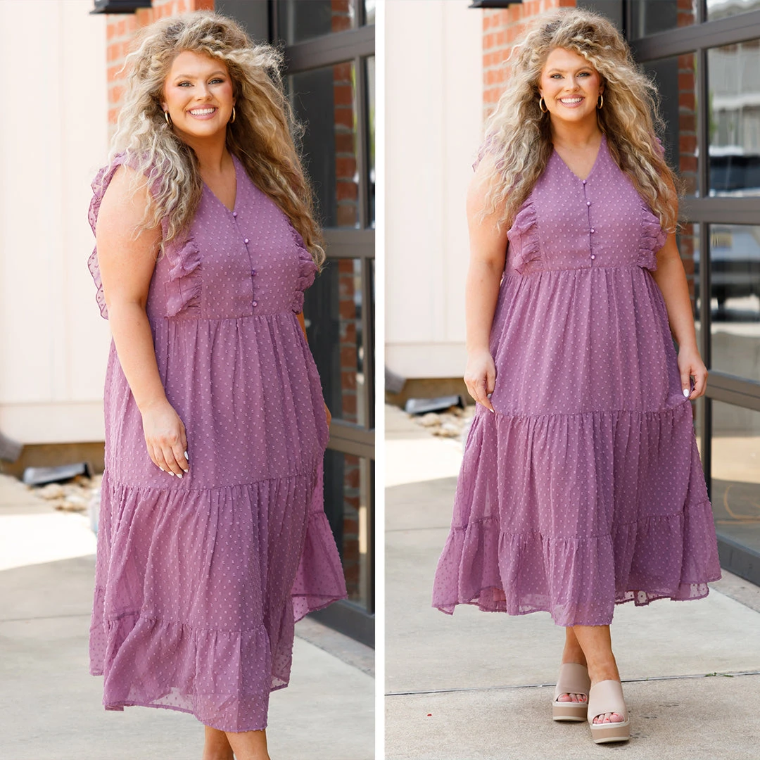 This gorgeous dress is perfect for every occasion! Its beautiful purple color and polka dot pattern create an eye-catching look, ideal for any event! Flutter sleeves and a perfect midi length make this dress comfortable and flattering! Show off your style with this elegant, timeless piece!