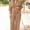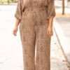 Take a step on the wild side with this fierce jumpsuit! This jumpsuit has a mesmerizing camel color and trendy leopard print perfect for the season! The sweet ruffled neckline and bubble sleeves are just what you need to add a touch of flare to your wardrobe! Style this jumpsuit with some cute accessories and booties for an effortlessly chic look!