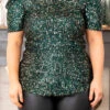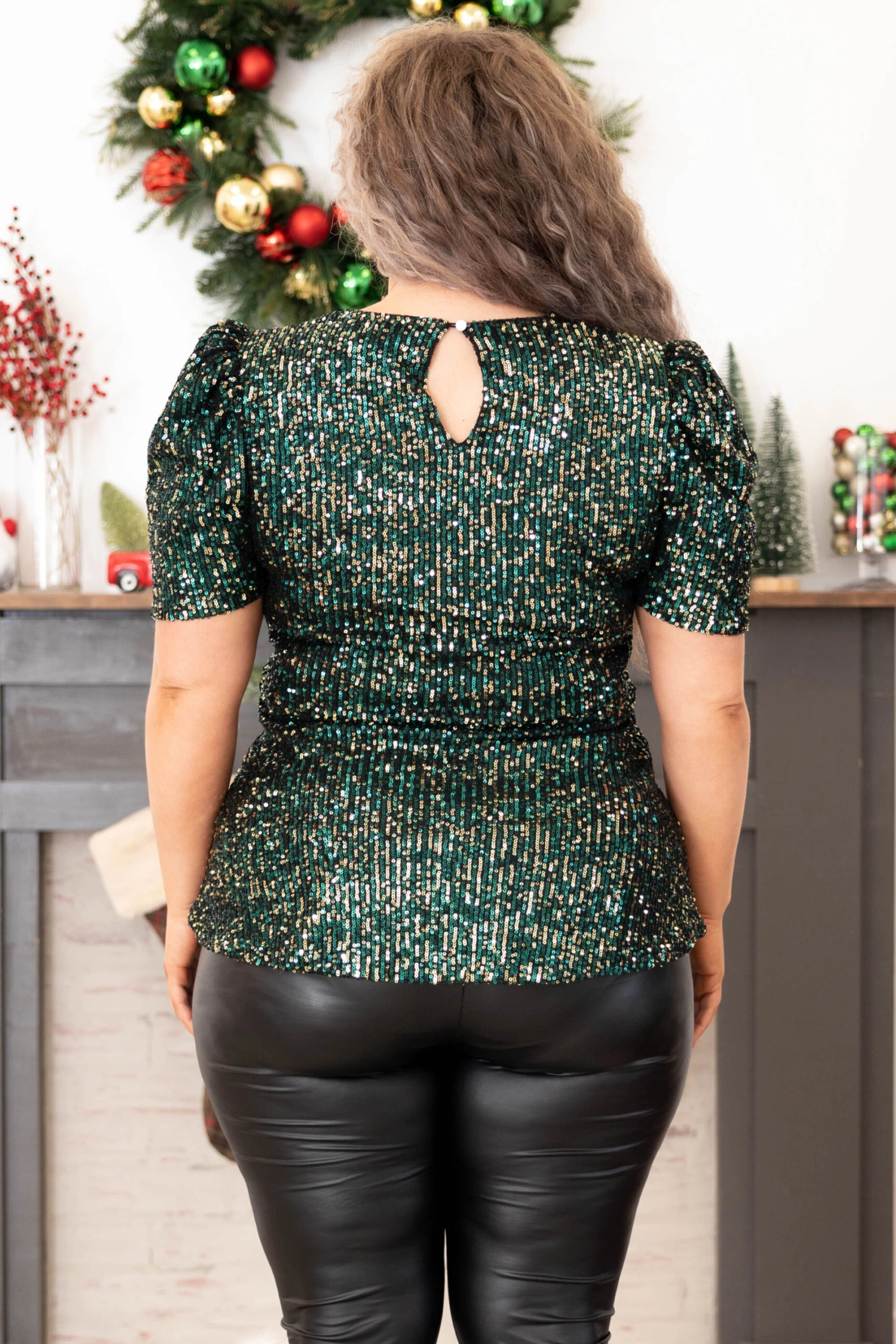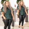 This top is simply irresistible! The beautiful emerald green color and sequin design is just in time for the season! The puff shoulder and figure flattering fit is just what you need for your next holiday event! Style this top with some faux leather leggings and heels for a classy chic look!