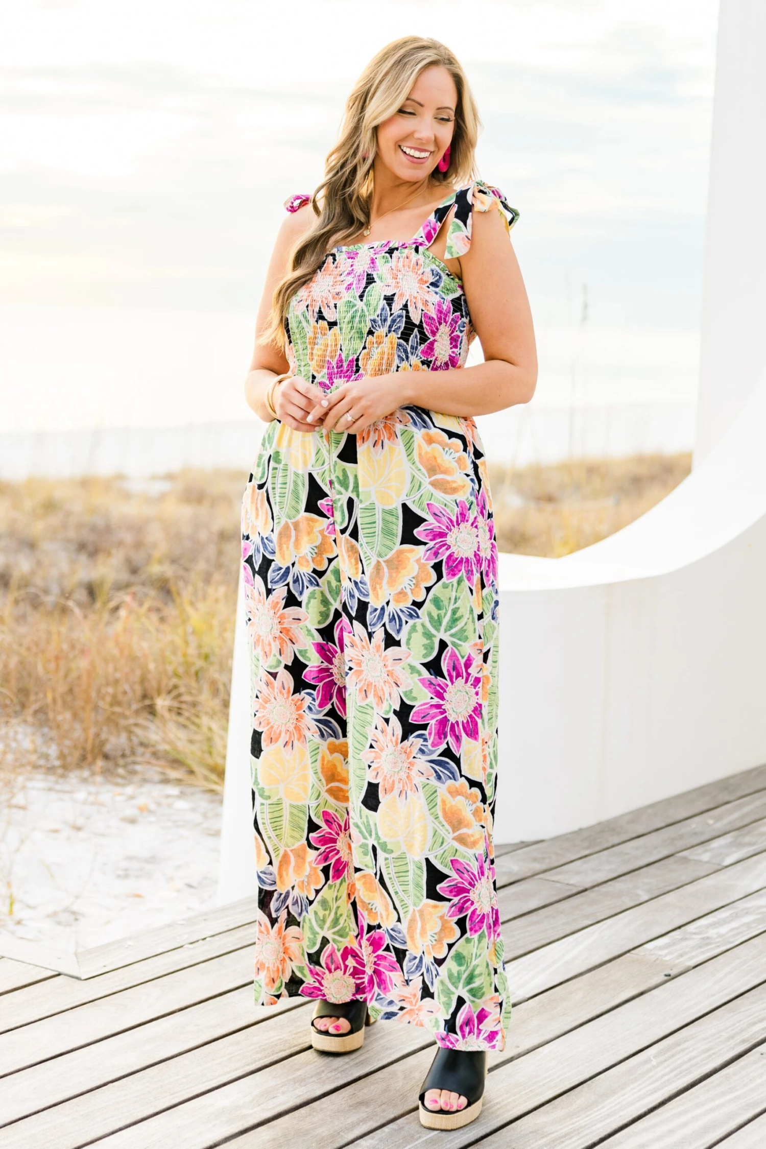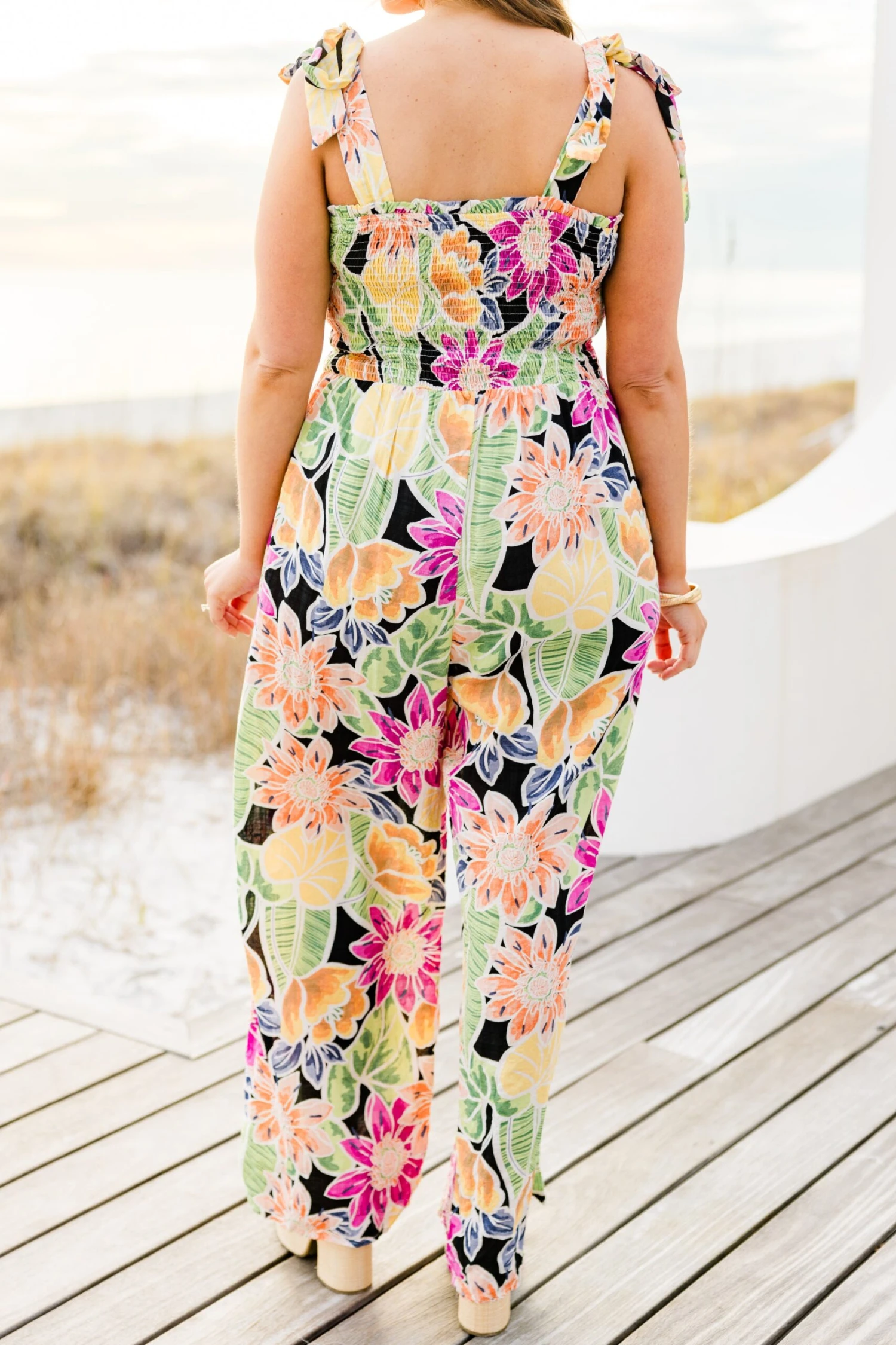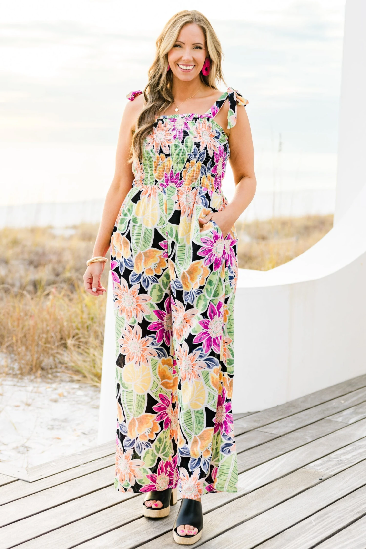 Effortlessly chic, the Island Allure Jumpsuit in black boasts adjustable tie straps and functional pockets for added convenience! The smocked bodice and vibrant tropical floral print make it a must-have for any island getaway! Say aloha to style and practicality with this versatile jumpsuit!