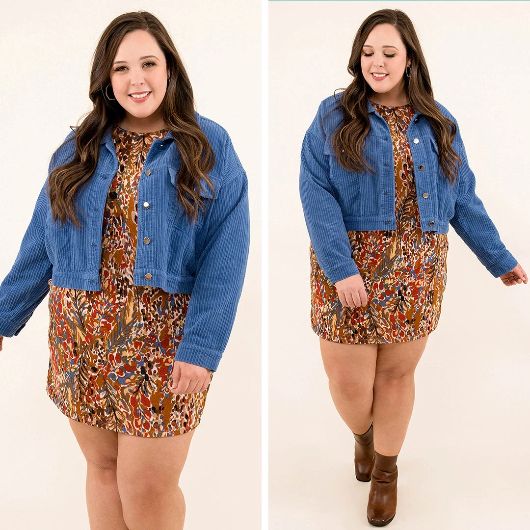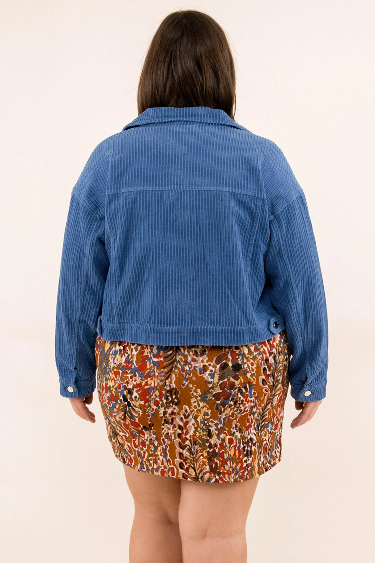 This jacket was made for you! It has a cropped length, a cool blue color and a trendy striped texture. Style this over a fun dress or top for a chic look this season!