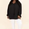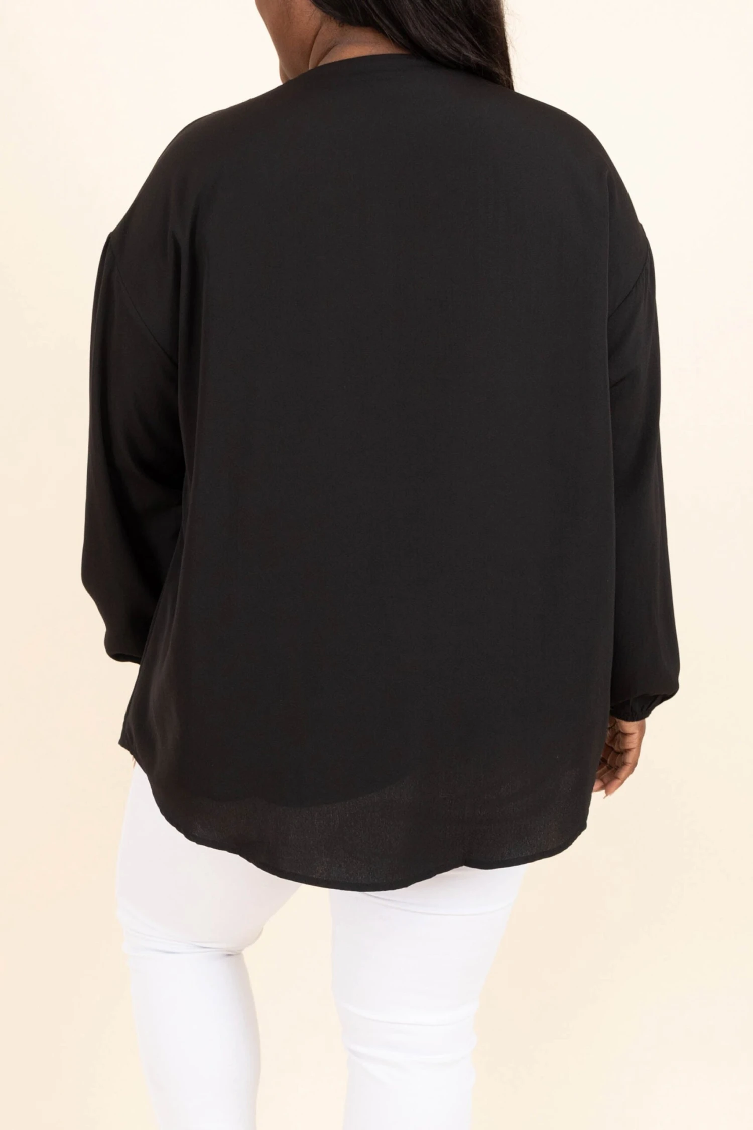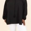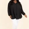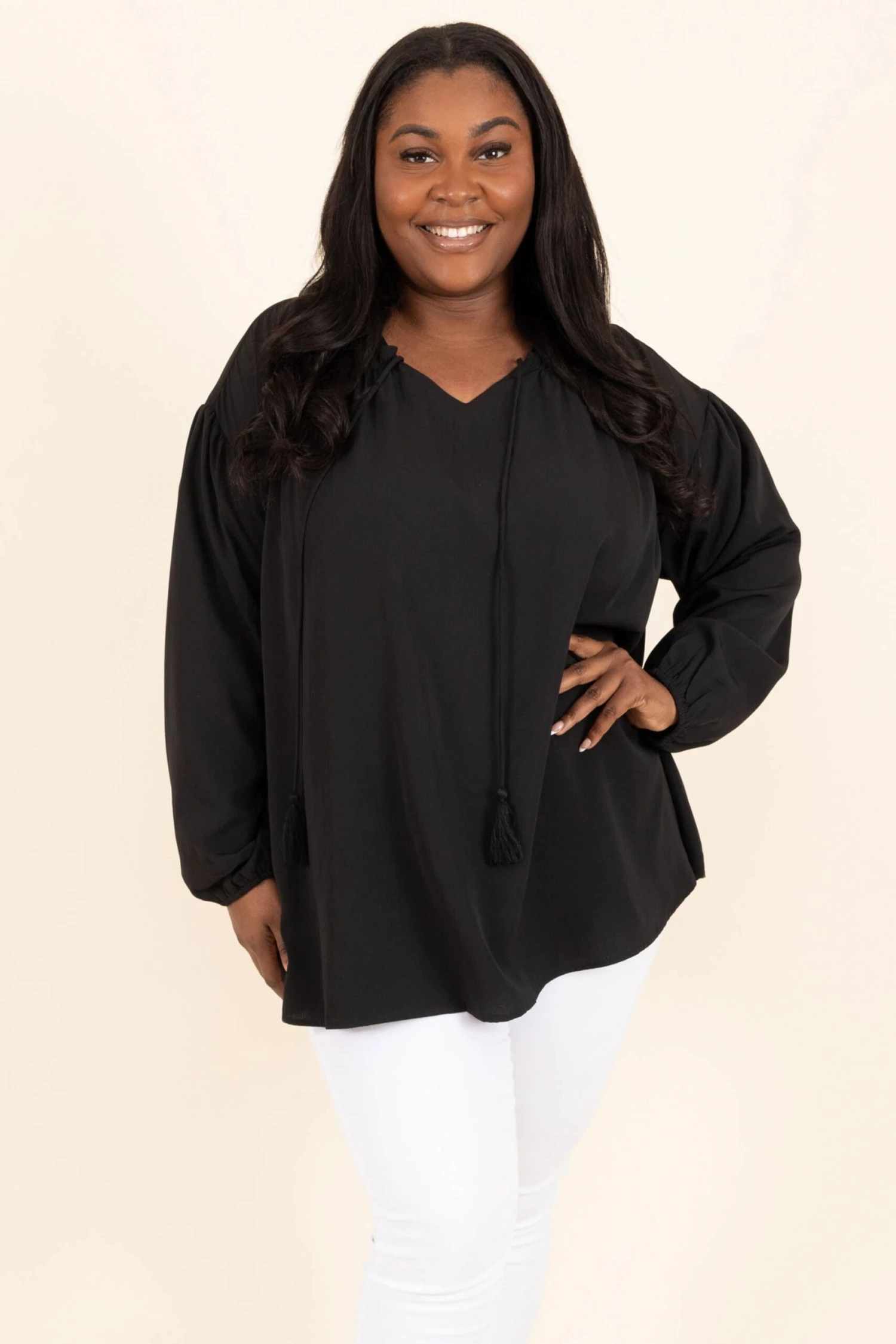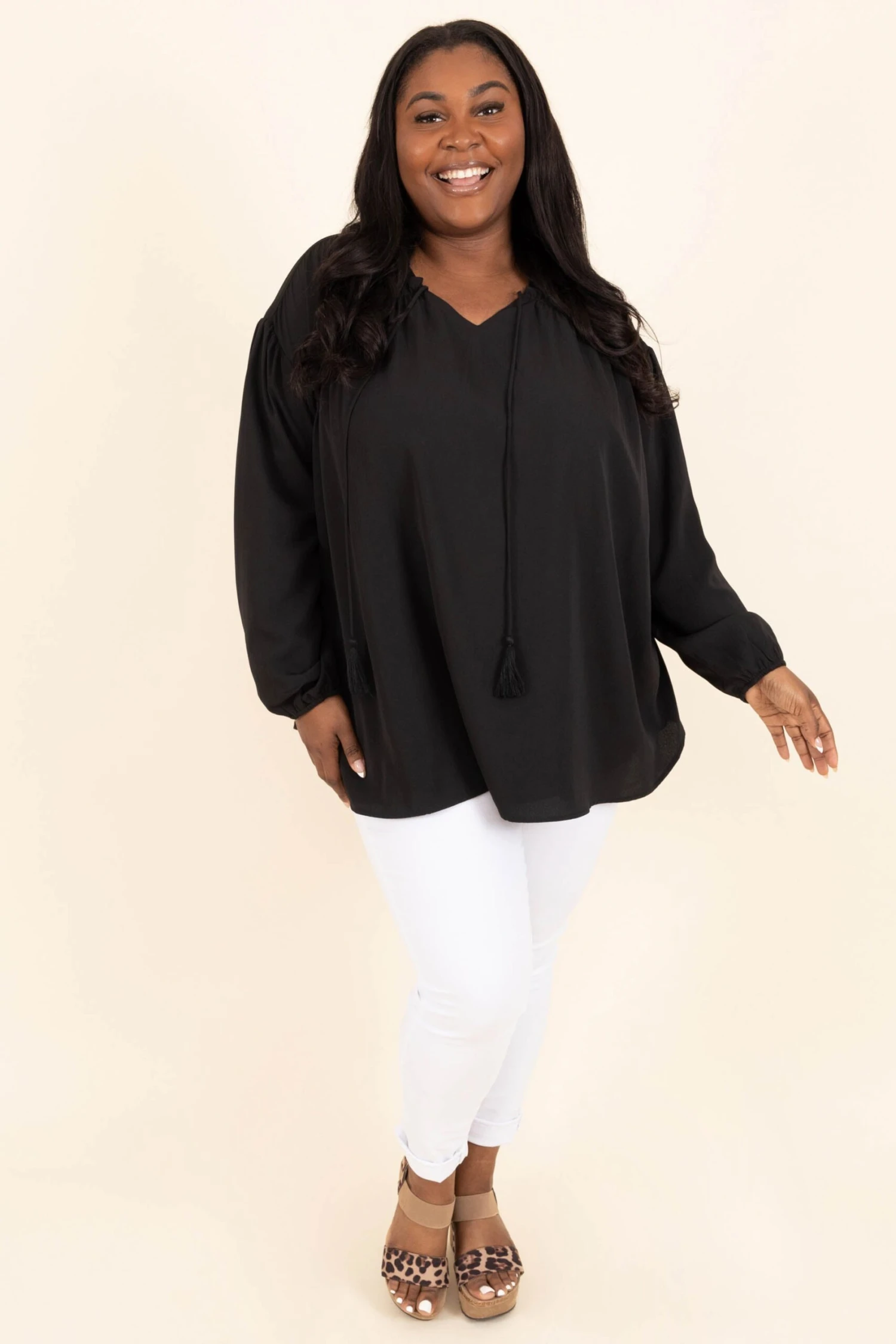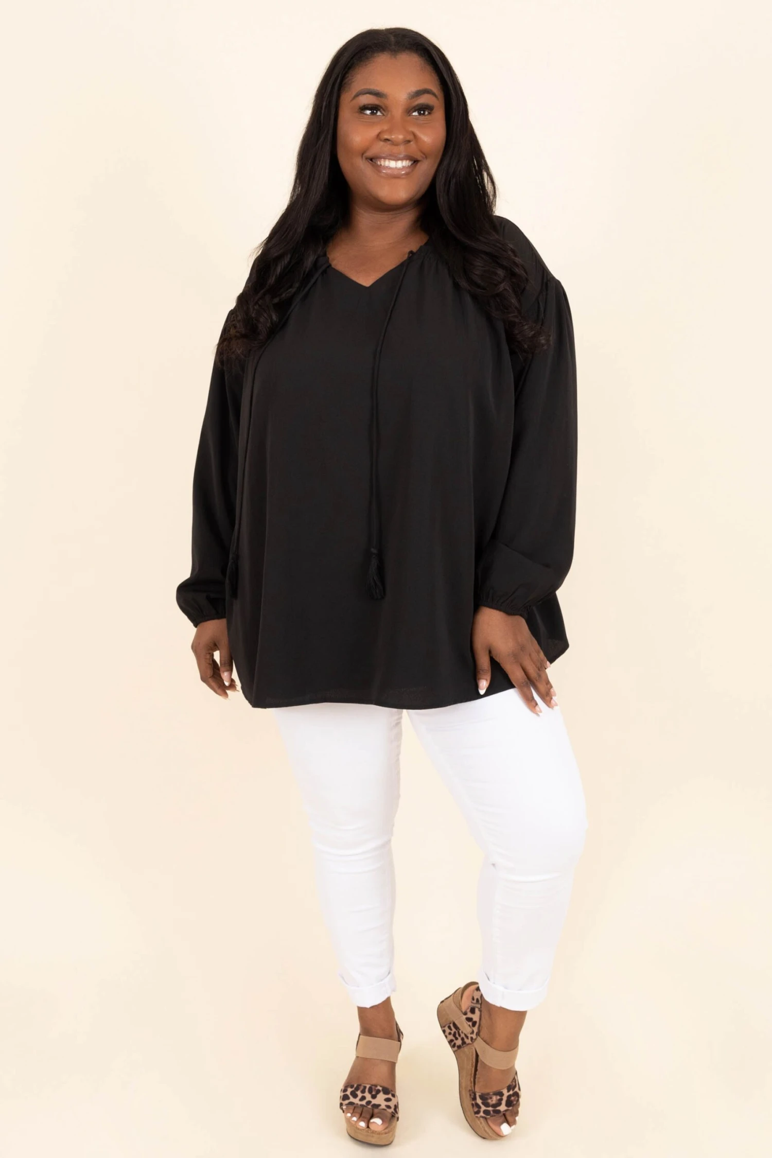 Step out in style while wearing this cutie! This top has a neutral black color that is so easy to pair with all of your faves throughout the season! The adorable tassel tie and flowy fit is the perfect combo for your new favorite top! Style this top with some skinnies or patterned pants for a sassy chic look!