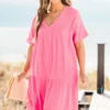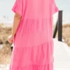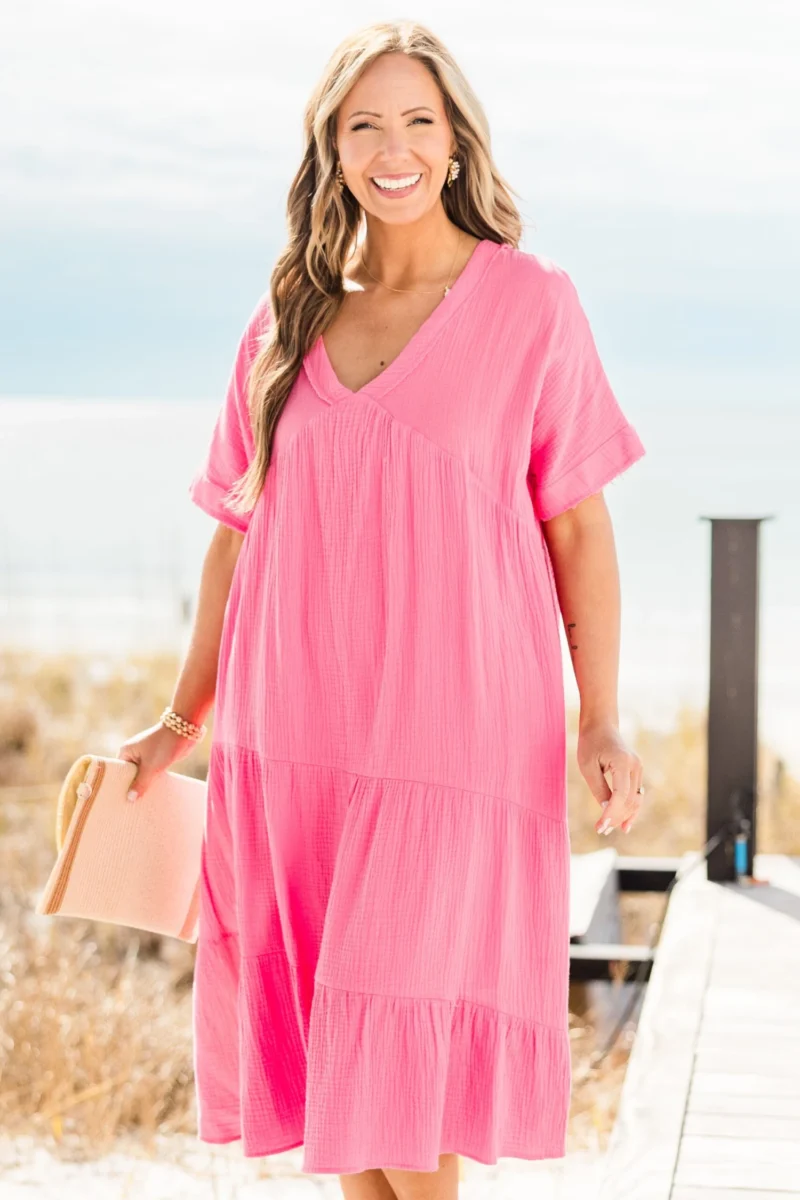 Be the belle of the ball in this dress! Made from airy gauze, this midi dress features a trendy tiered skirt, a flattering v-neck, and functional pockets! Perfect for any occasion, dress it up or down for a look that’s both chic and practical!