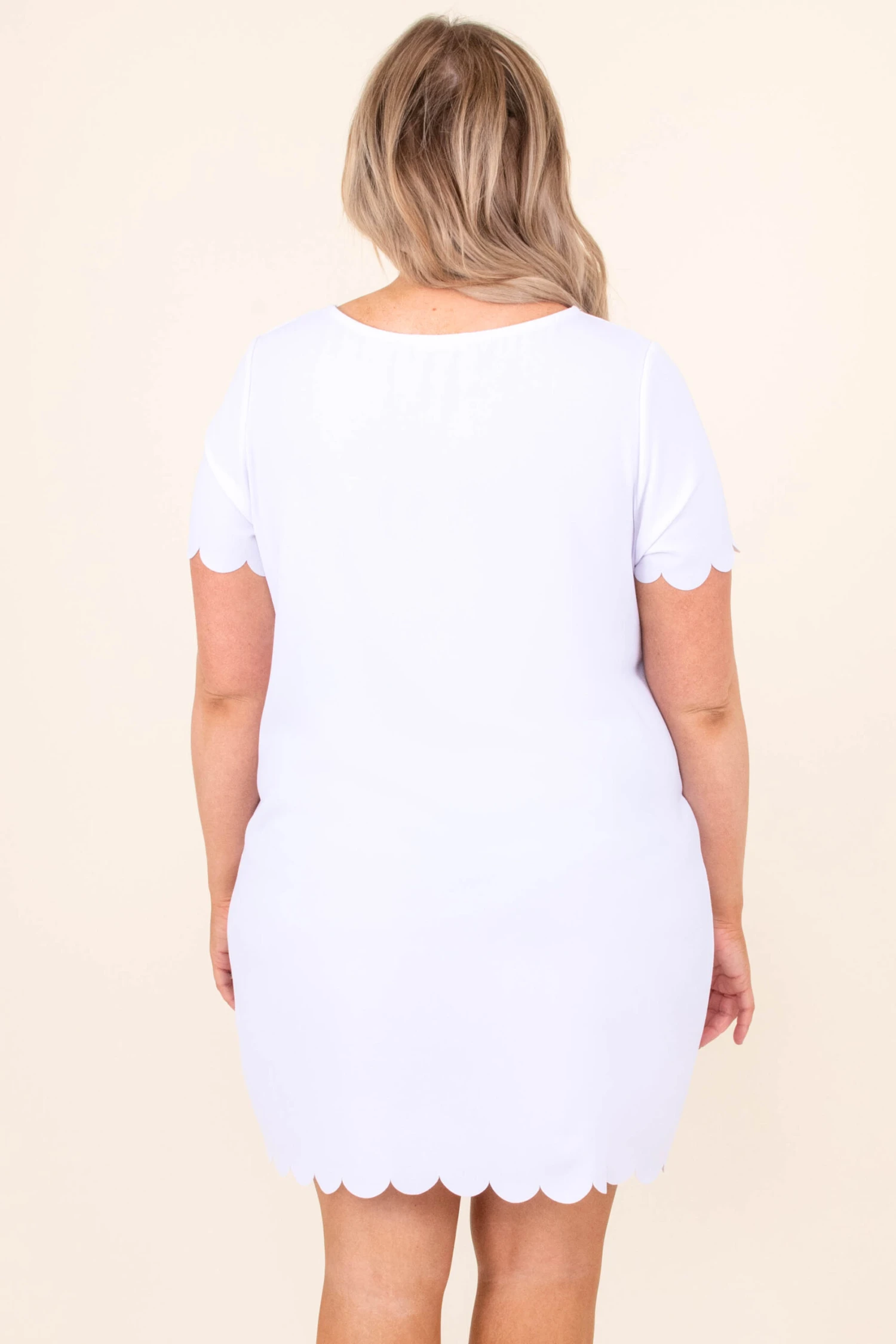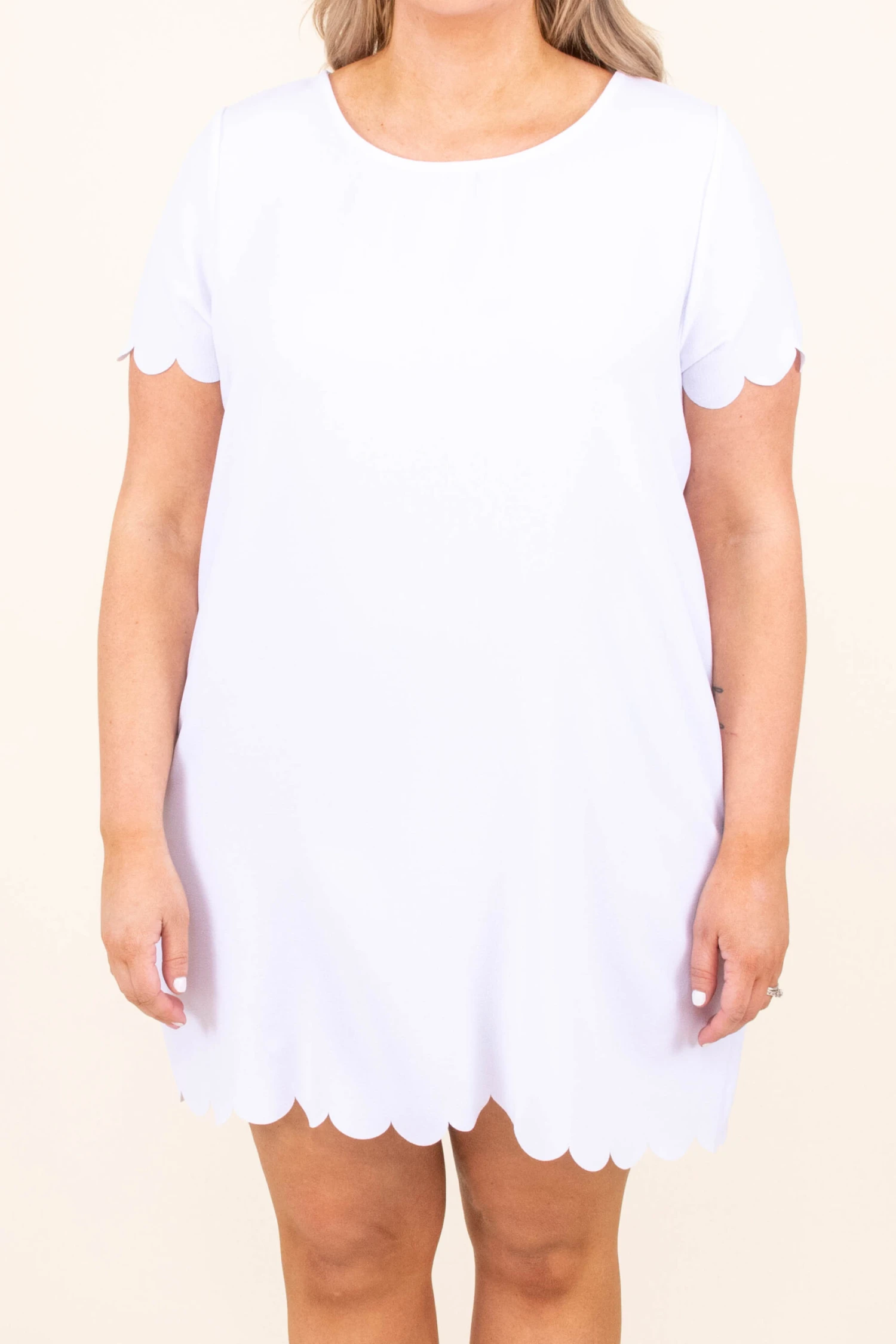 Make a grand entrance in this dress! It has a classic white color you can dress up or down for every occasion! It’s comfortable for all-day wear, has a figure-flattering fit, and features the cutest scoop neck with scalloped detailing! Style this dress with booties or heels for your next event! Â