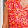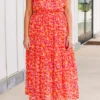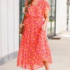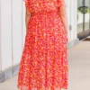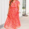 Discover the perfect blend of elegance and playfulness with our Keep ‘Em Guessing Dress in tangerine! Featuring a striking metallic floral print, this ruffle maxi dress is designed with a flattering v-neckline, elastic waistband, and flutter sleeves! Make a bold statement in this must-have dress!