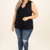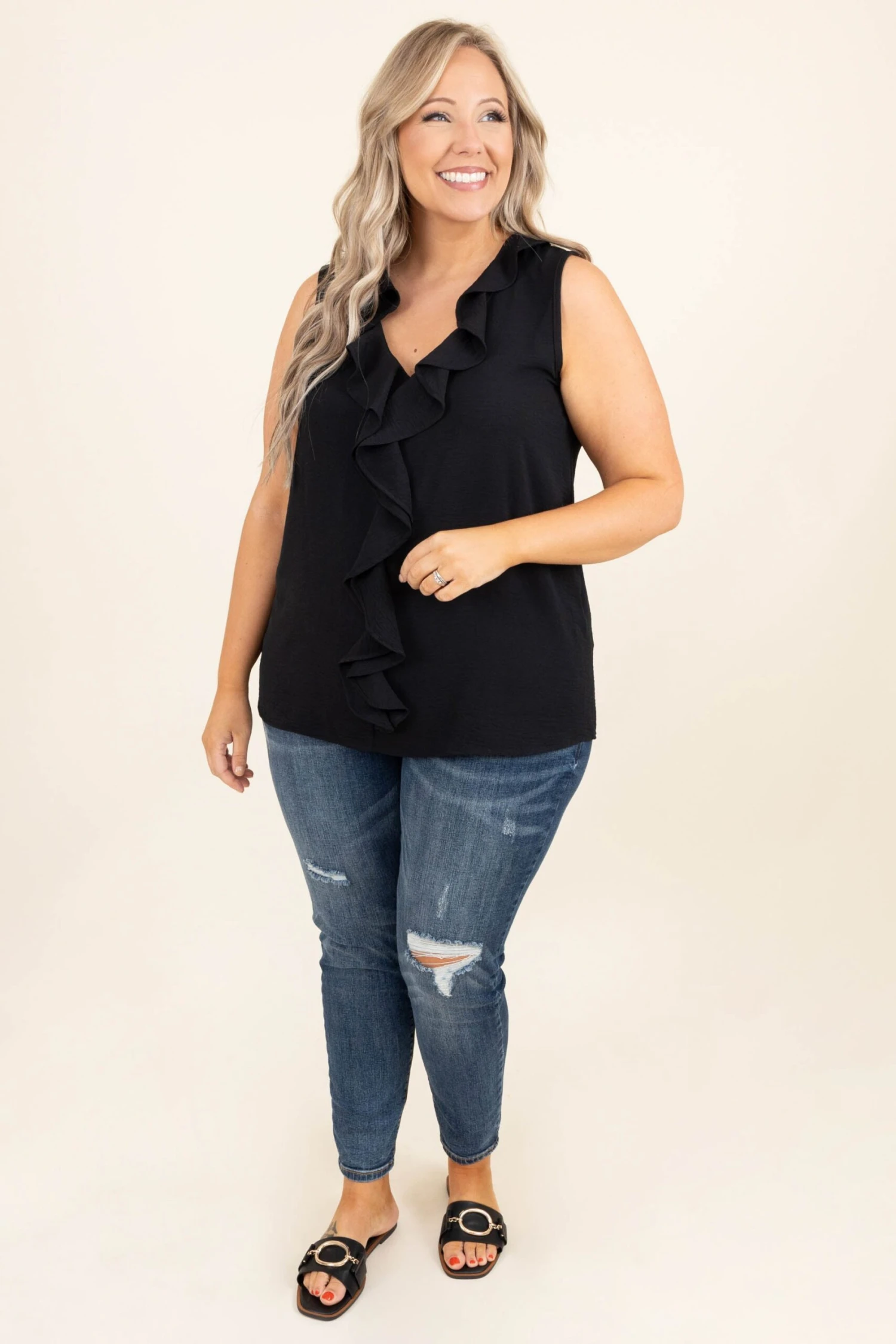 Shine as bright as the stars in this top! This cutie has a solid black color with a fun ruffle on the collar that gives it a feminine feel! The material has a slight crepe texture and the tank style will keep you cool on the hot days! Style this with some skinnies and sandals for a classic look!