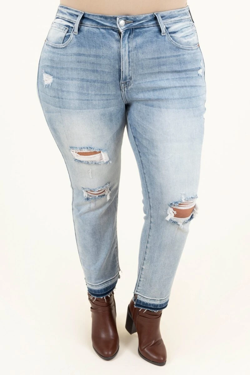 Kick back and relax in these comfy jeans! These jeans have a lovely light wash with a trendy distressed pattern on the front! The stretchy material and figure flattering fit are perfect for every day, all day wear! Style these jeans with all your favorite tops this season for a classic, chic look!
