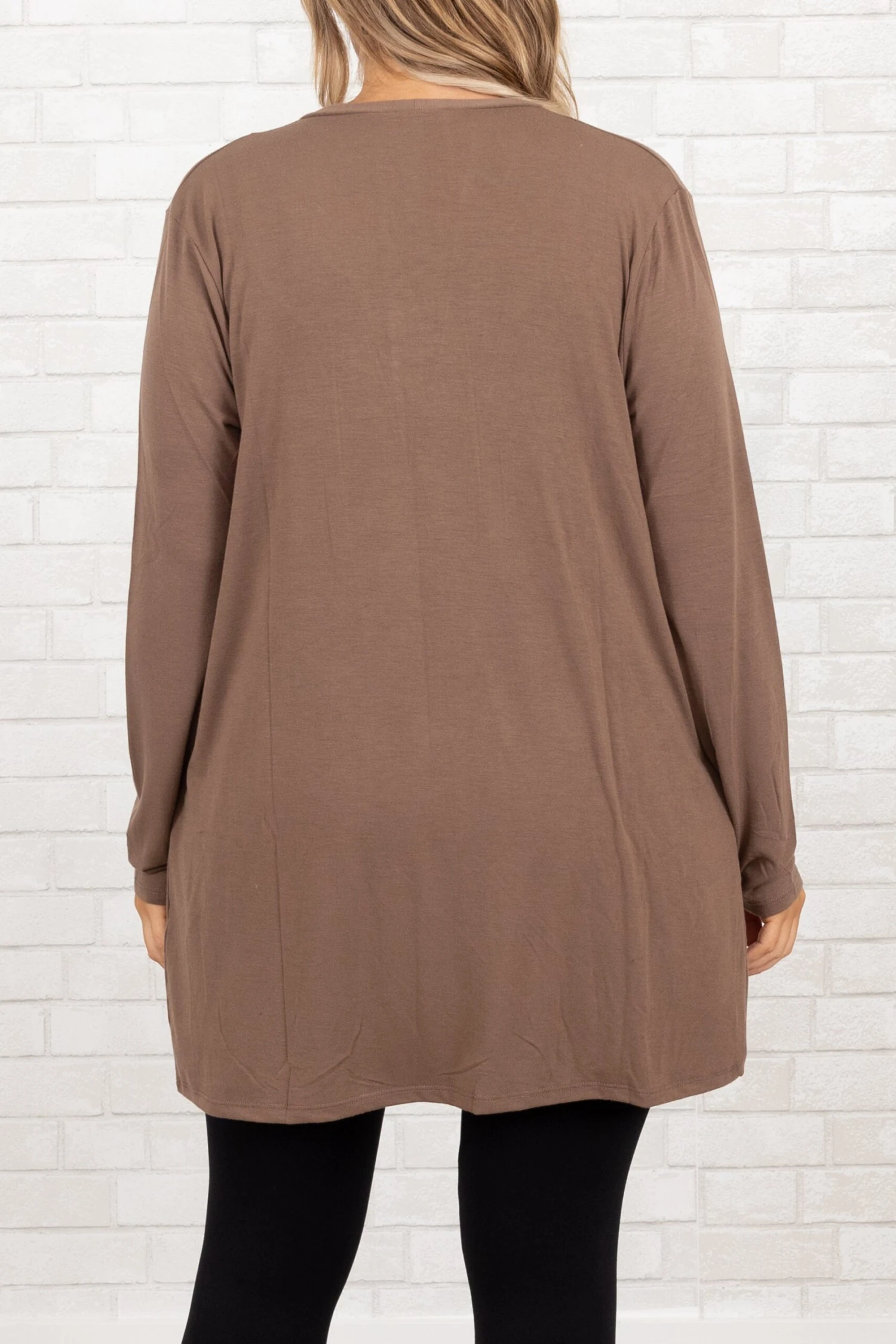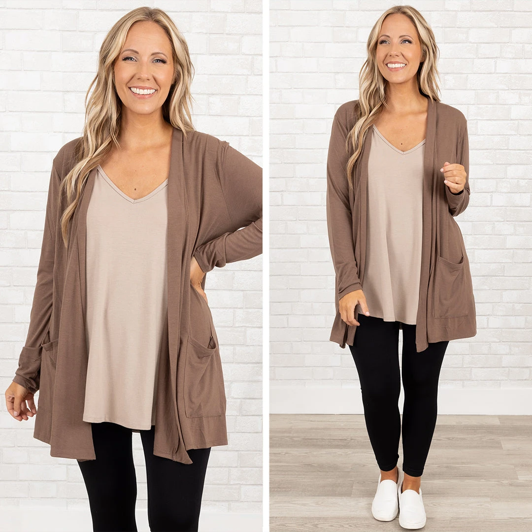 We are simply in love with this beautiful cardi! This gorgeous, mocha cardigan features figure-flattering fit, lightweight fabric, and functional pockets that you’ll adore! The perfect layering piece for the season, it’s sure to become a staple in any wardrobe!