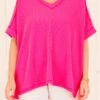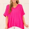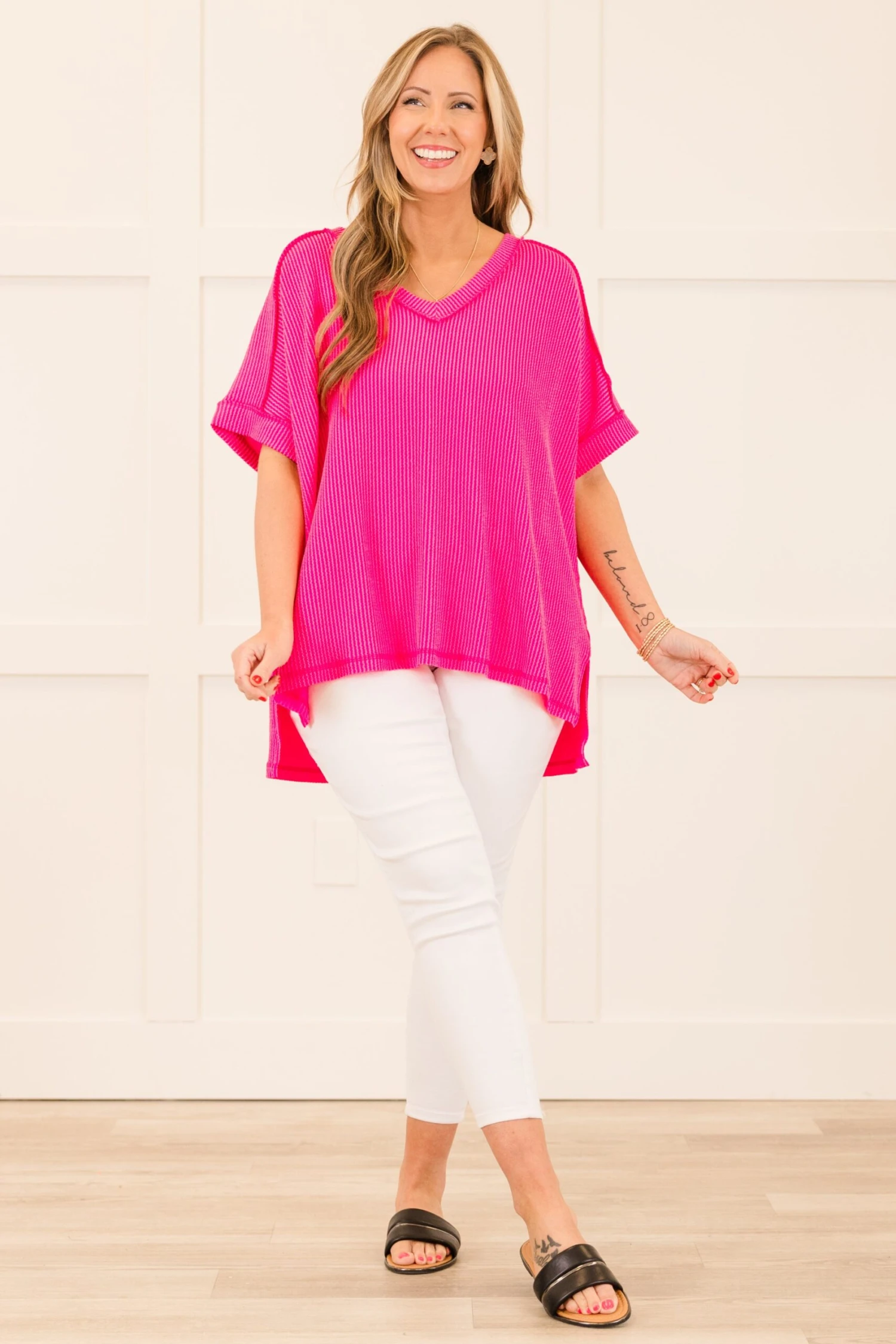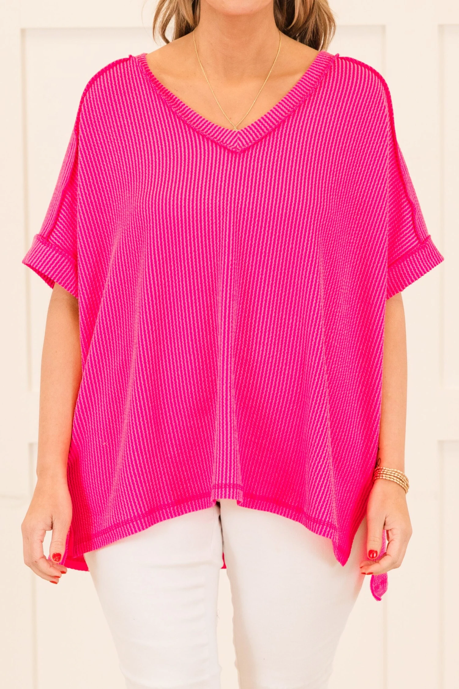 This top is a must-have addition to any wardrobe! Featuring a playful corded rib design, short sleeves, a stylish hi-low hemline and v-neck, this neon hot pink top adds a touch of fun to your everyday look! Perfect for any occasion, it’s the ultimate blend of comfort and style!