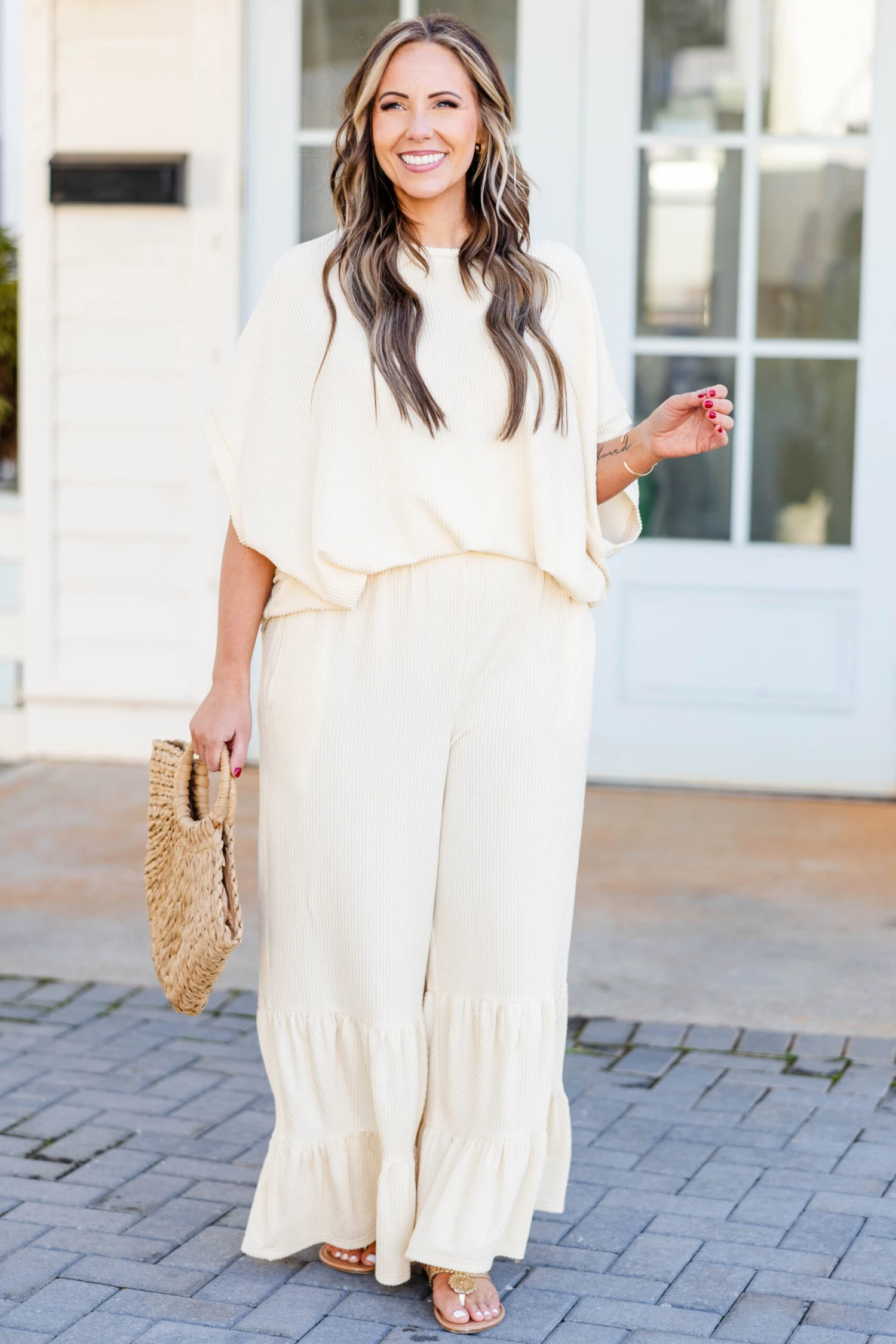 Crafted with a flare design and textured style, these FAB pants in oatmeal provide a comfy and flowy fit! The neutral color makes it perfect for any casual day out! Elevate your style with this must-have essential!