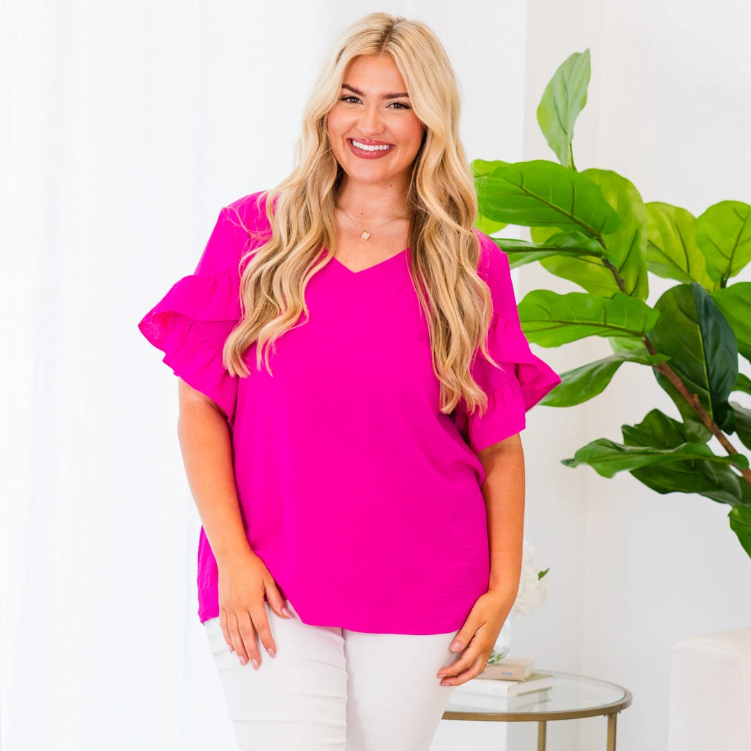 Indulge in bold fashion with the Lacewing Top in magenta! Featuring playful ruffle sleeves, this top is perfect for a brunch date! Add a pop of color to any outfit and make a statement with this unique piece!