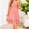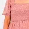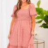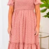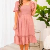 This dress will have you looking like a princess! The mauve color makes the black polka dot design really pop! The smocked bodice will hold you in in all the right areas and the puff sleeves are so fun! Style this with some sandals for the sweetest look!