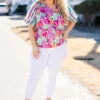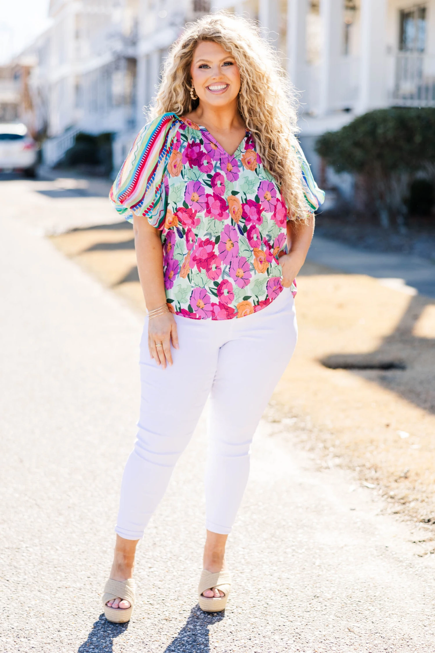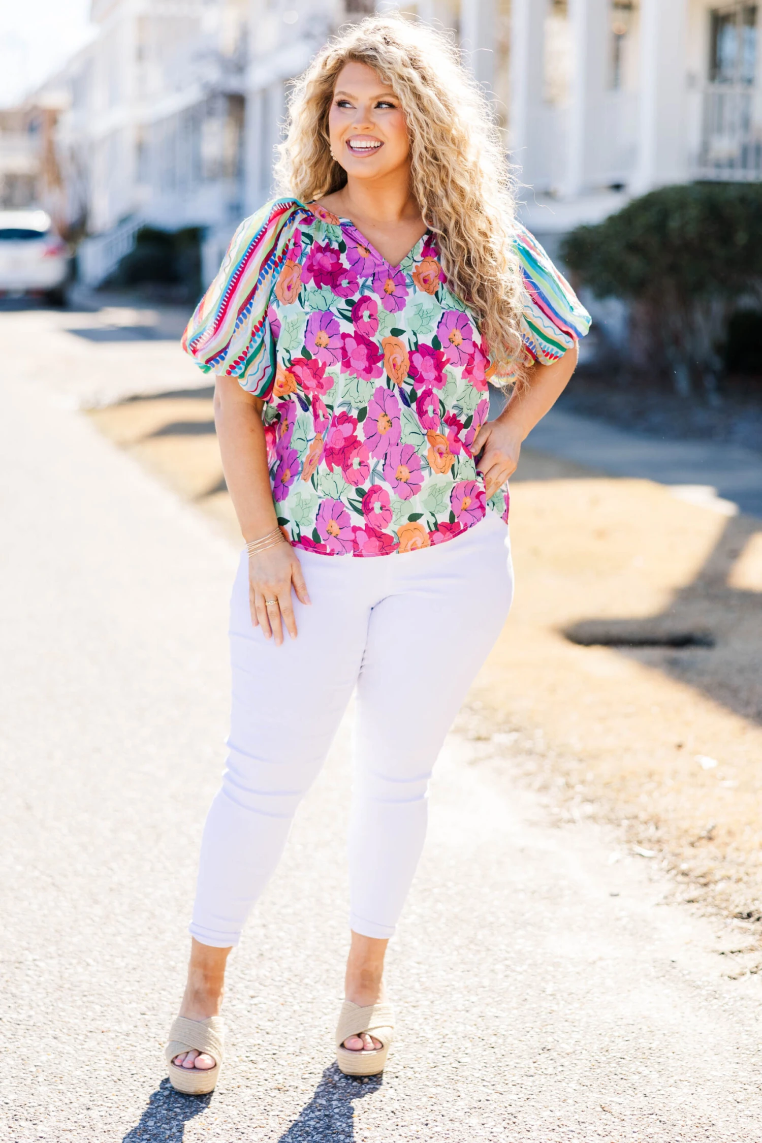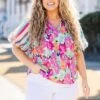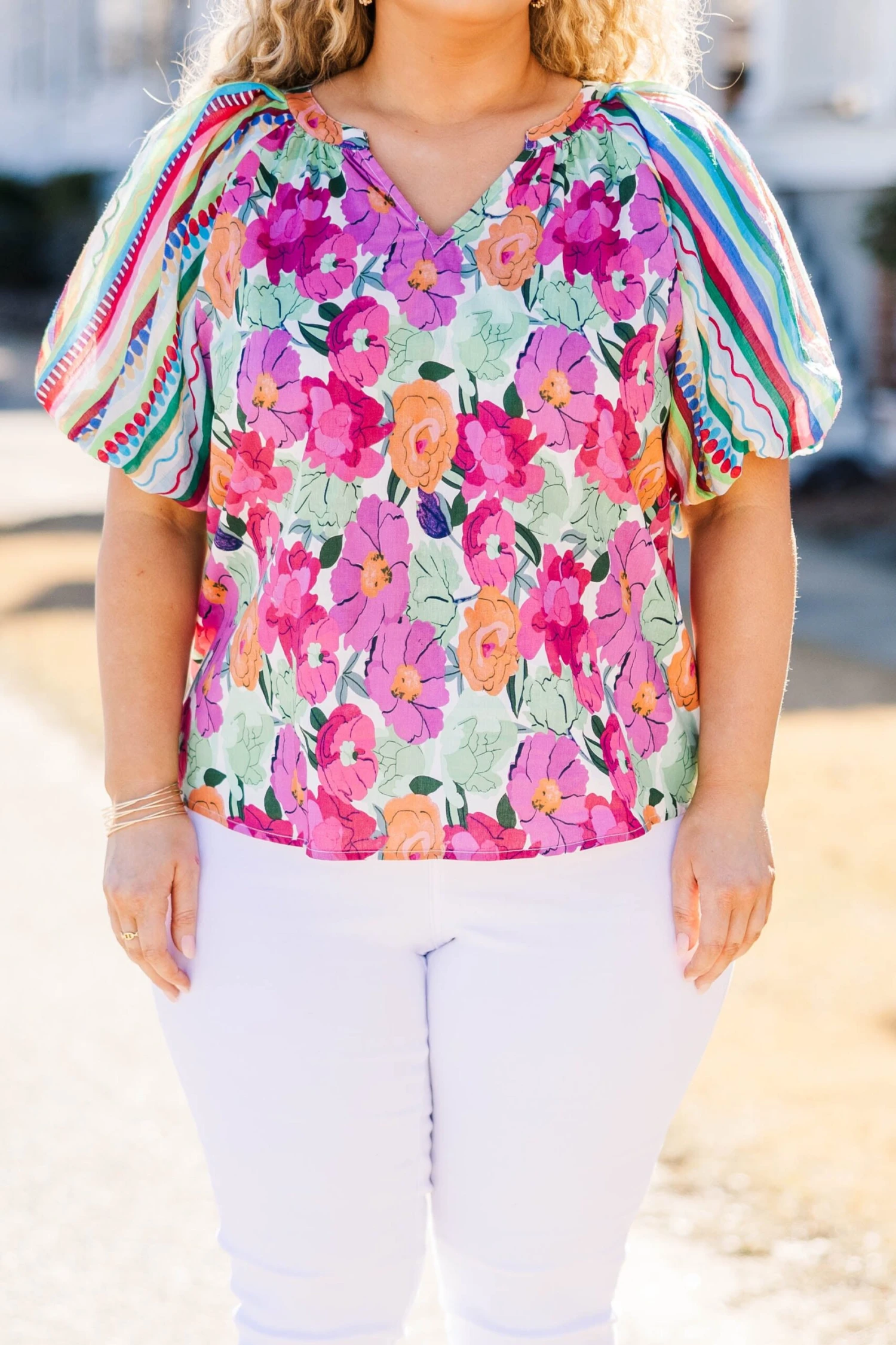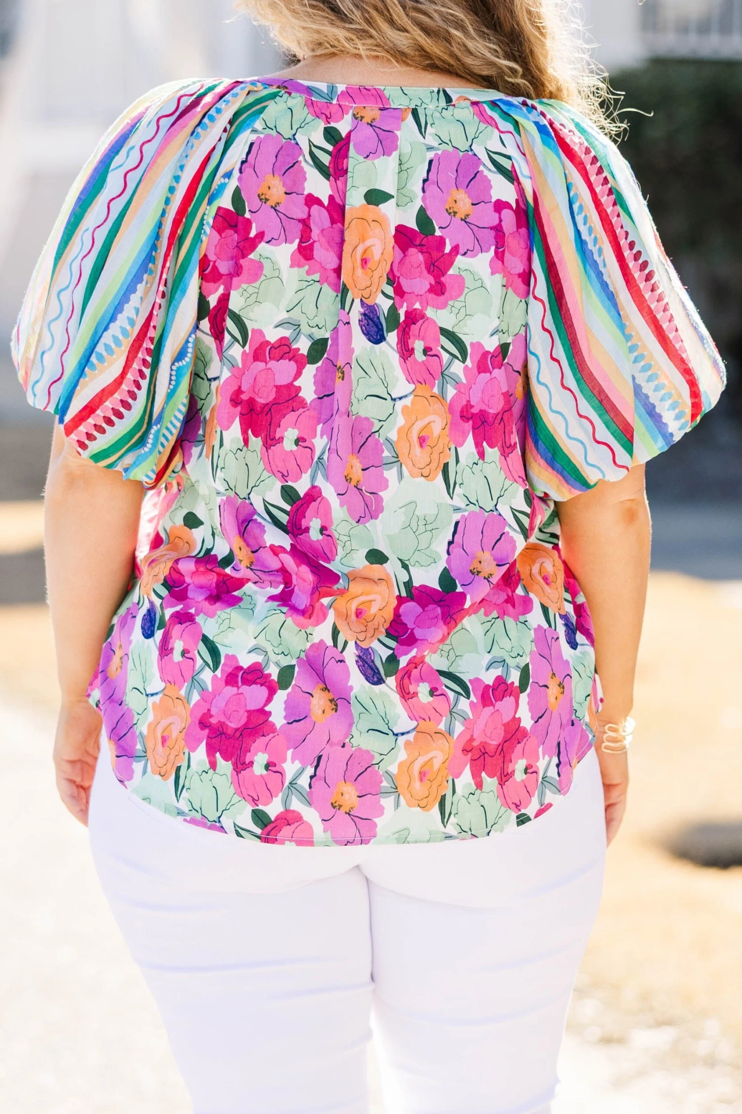 Elevate your style with this GORGEOUS top! Featuring bold multi-color and a trendy floral-stripe pattern with statement bubble sleeves, this top is perfect for any occasion! Pair it with white denim and heels for a chic and effortless look!