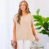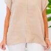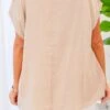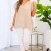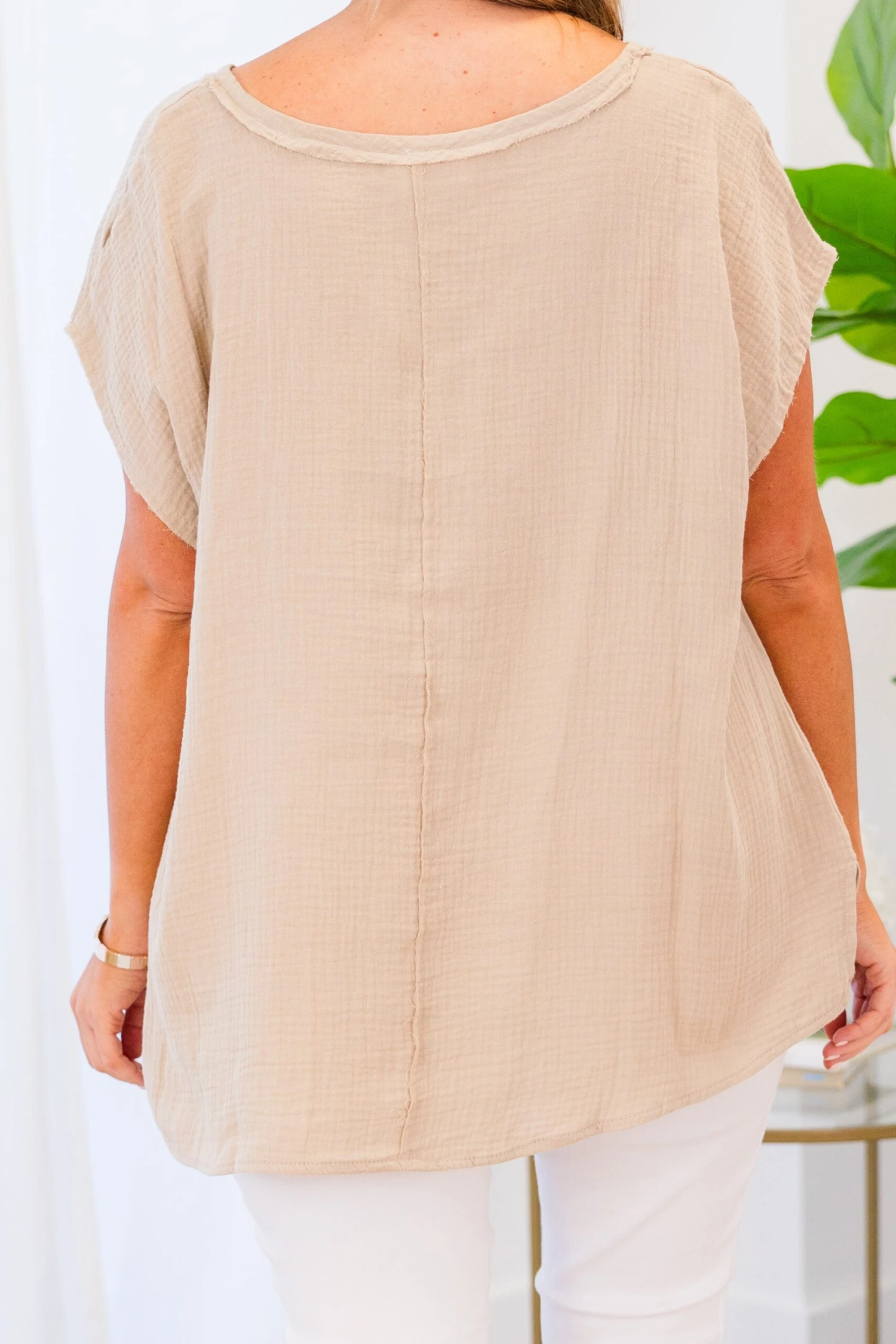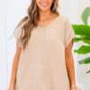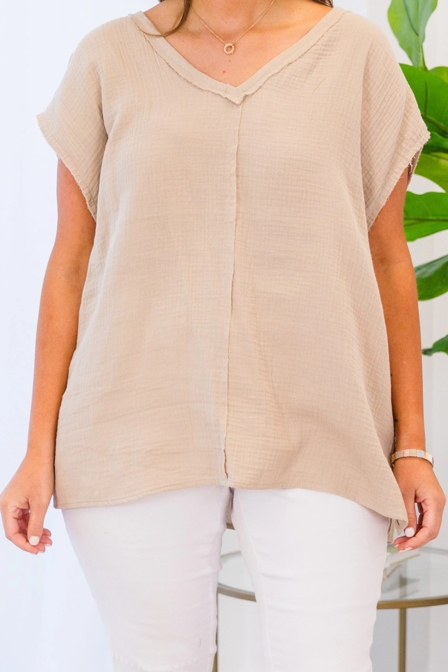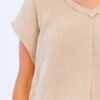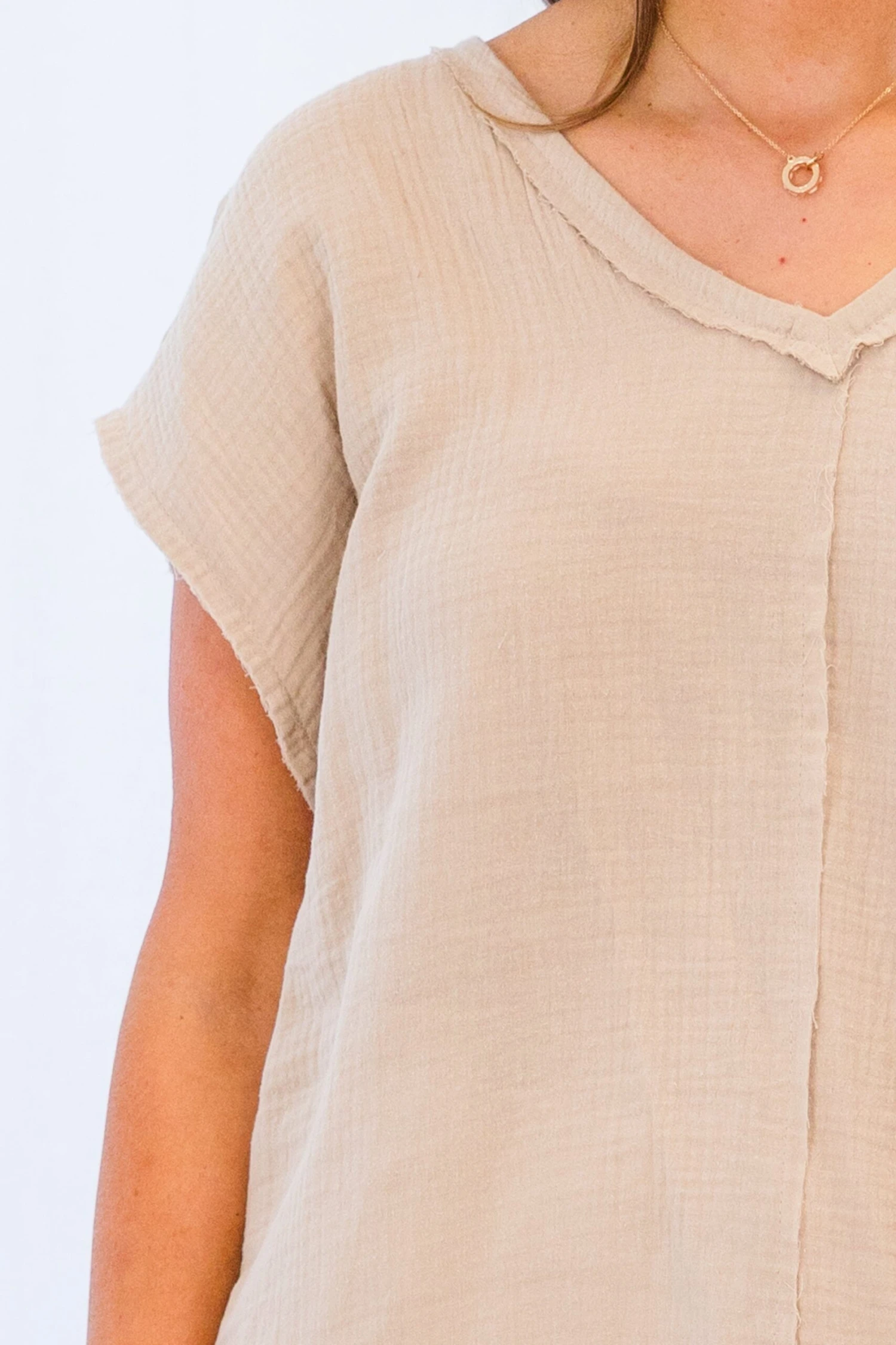 Introducing our Lead With Grace Top in taupe! Crafted from lightweight gauze material and featuring a flattering v-neckline, this top is perfect for any occasion! Pair it with your favorite white or blue denim for a stylish and effortless look!