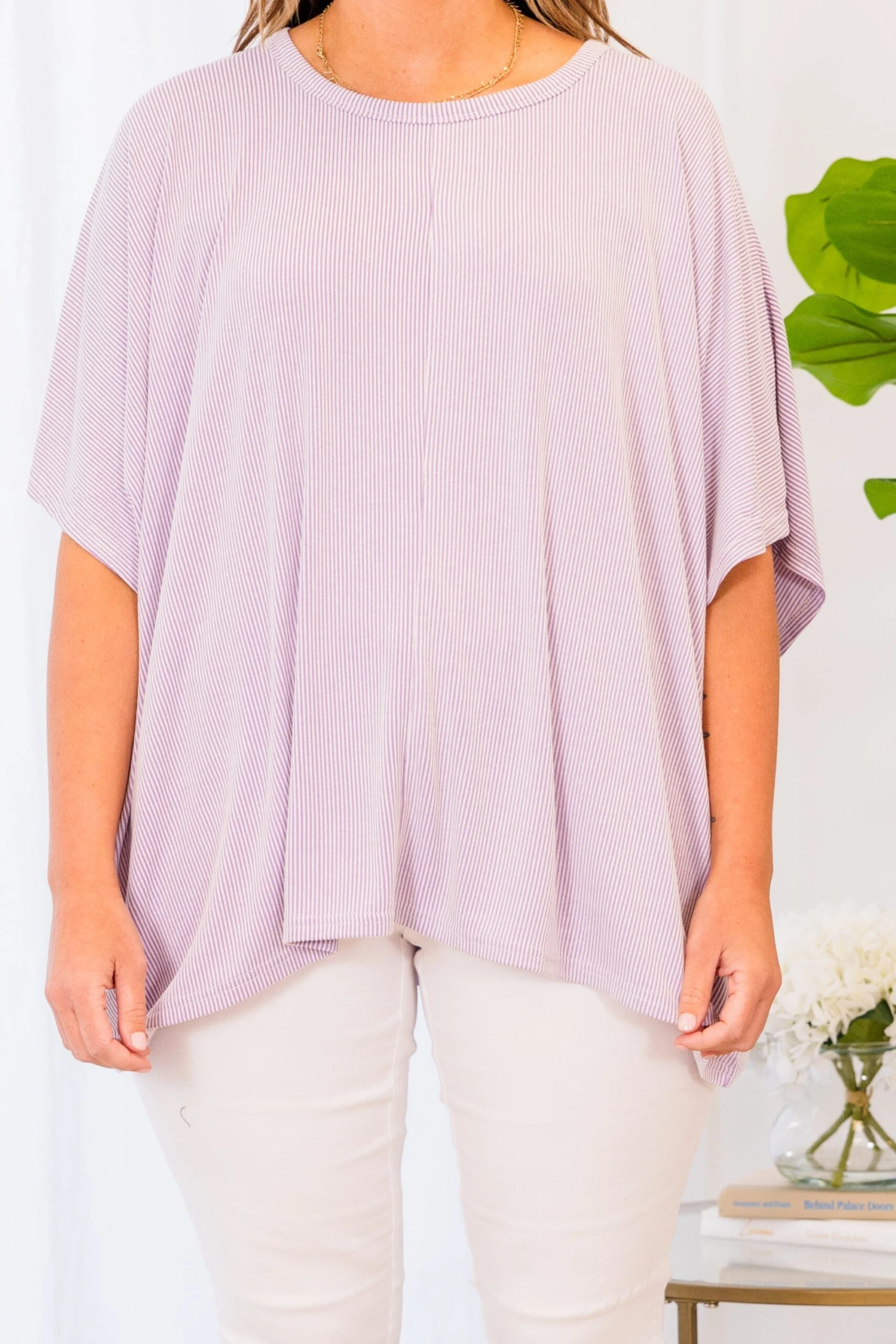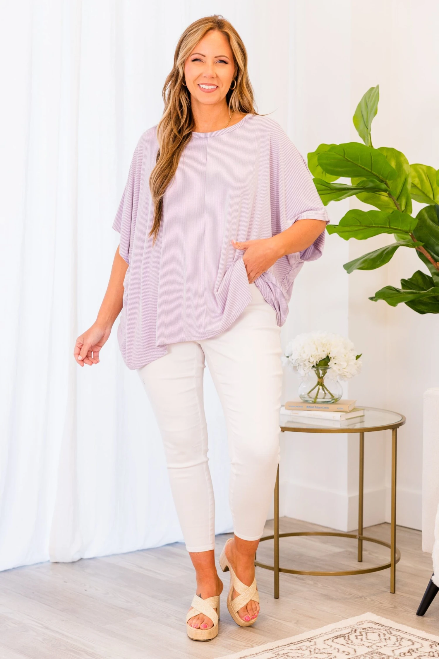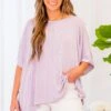 Leave em’ in awe in this fabulous top! This lovely lavender top is not only stylish, but also comfortable and stretchy! The textured material adds a touch of sophistication and pairs well with white denim and wedges for a classic chic look!Â