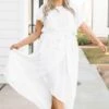You will be stunning in this dress! It has a chic off white color you can dress up or down for every occasion! It’s comfortable for all-day wear, has a figure-flattering fit, and features the cutest tied waistline! Pair this dress with heels or wedges for an effortlessly chic outfit!
